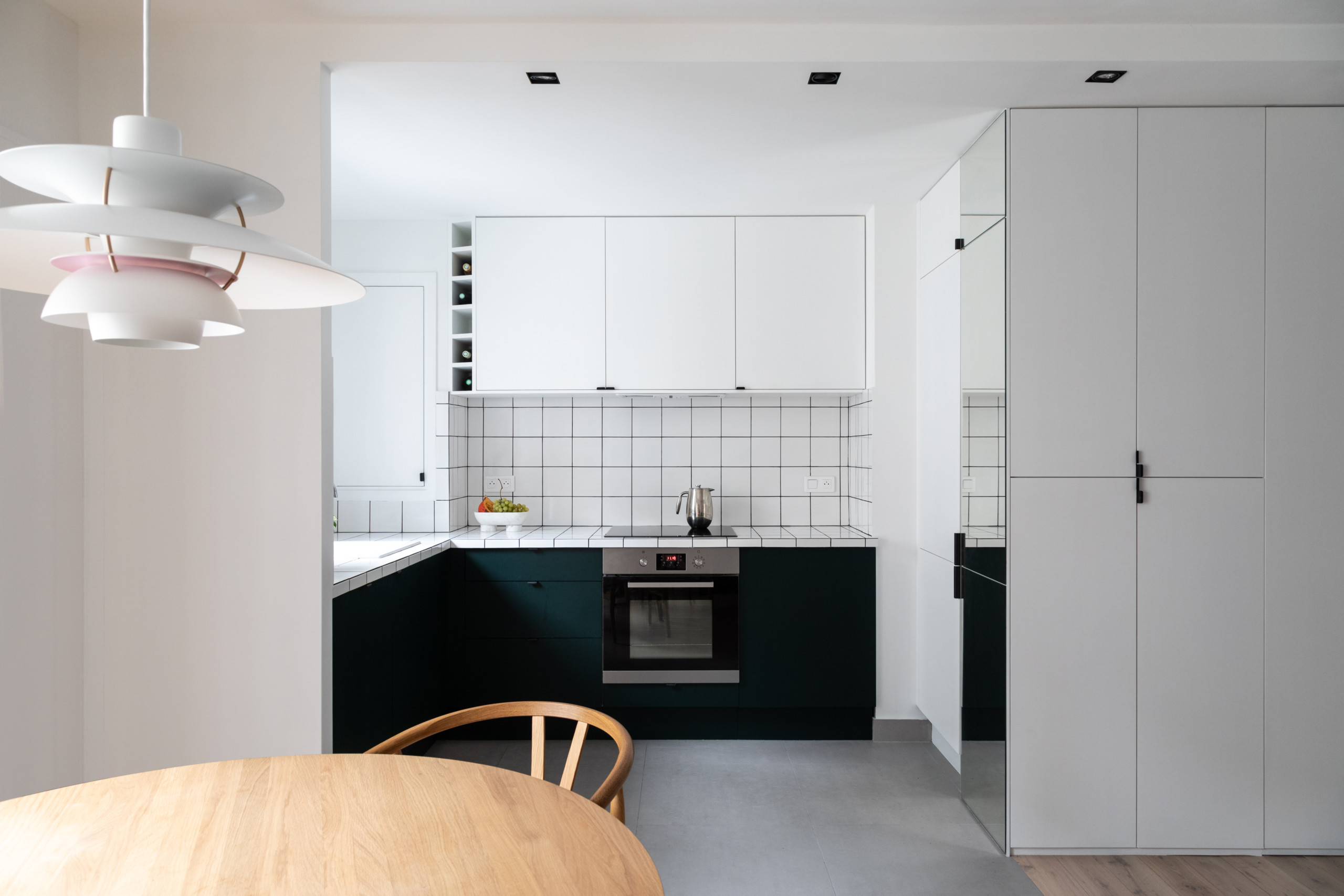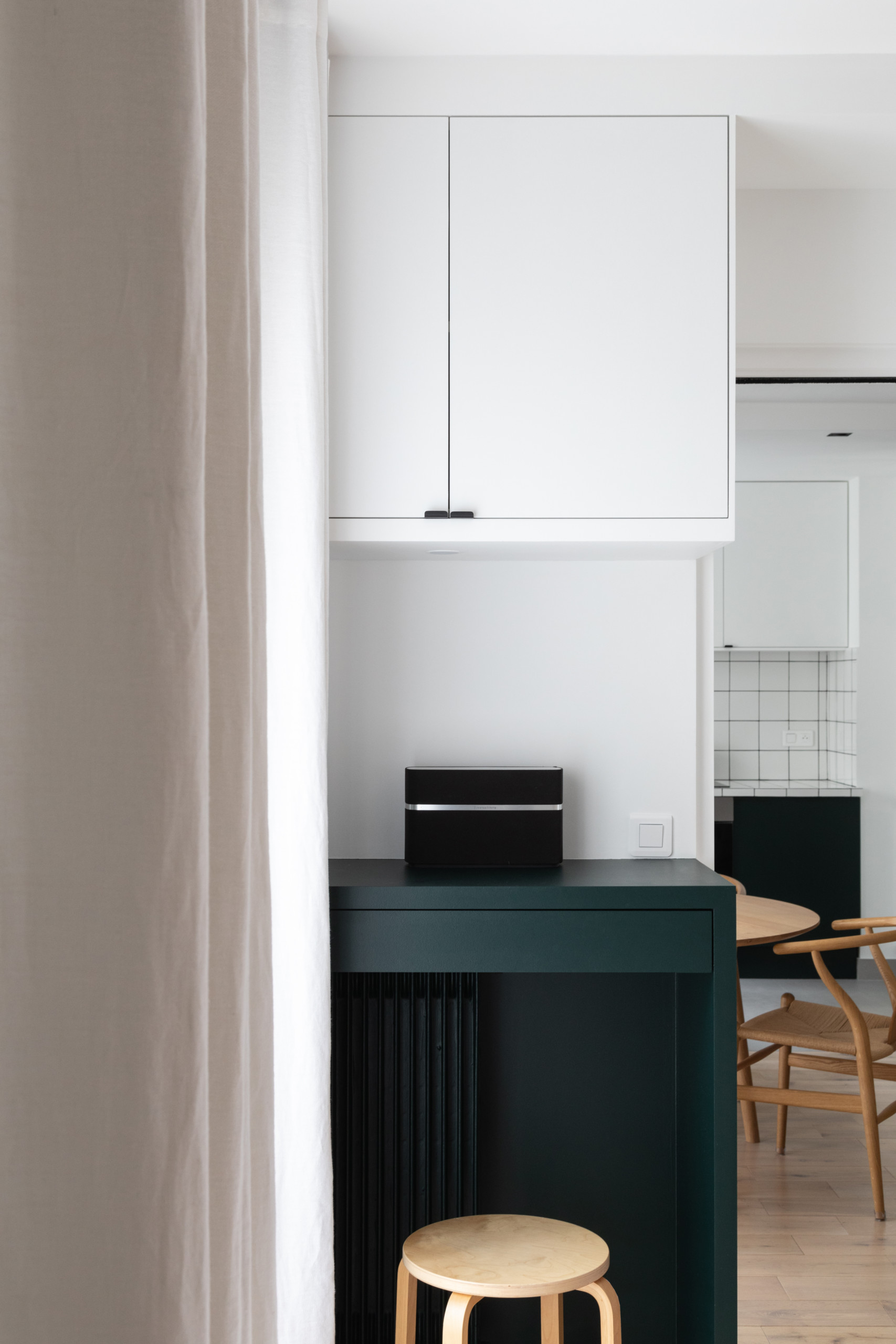 Quant aux caissons inférieurs, ils ont été peint avec le même vert émeraude que celui de l’entrée ; un élégant rappel qui participe à l’unité des espaces.