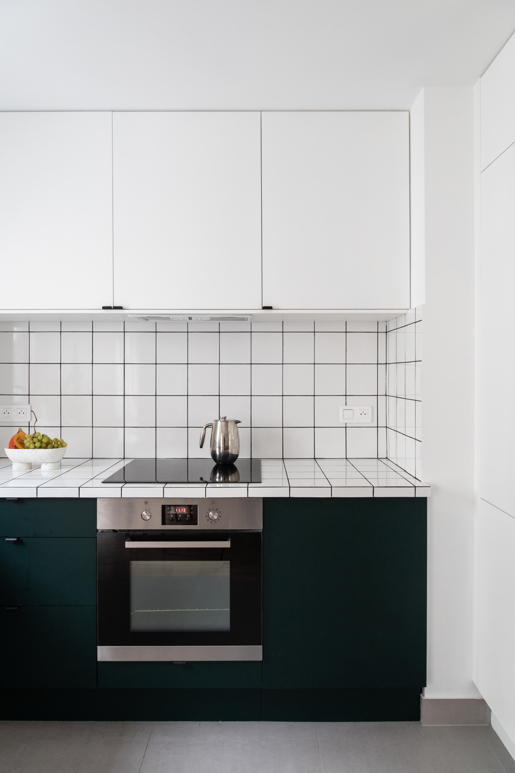 Côté crédence et plan de travail, l’incontournable carreau blanc recouvre les surfaces pour un effet pur et graphique.