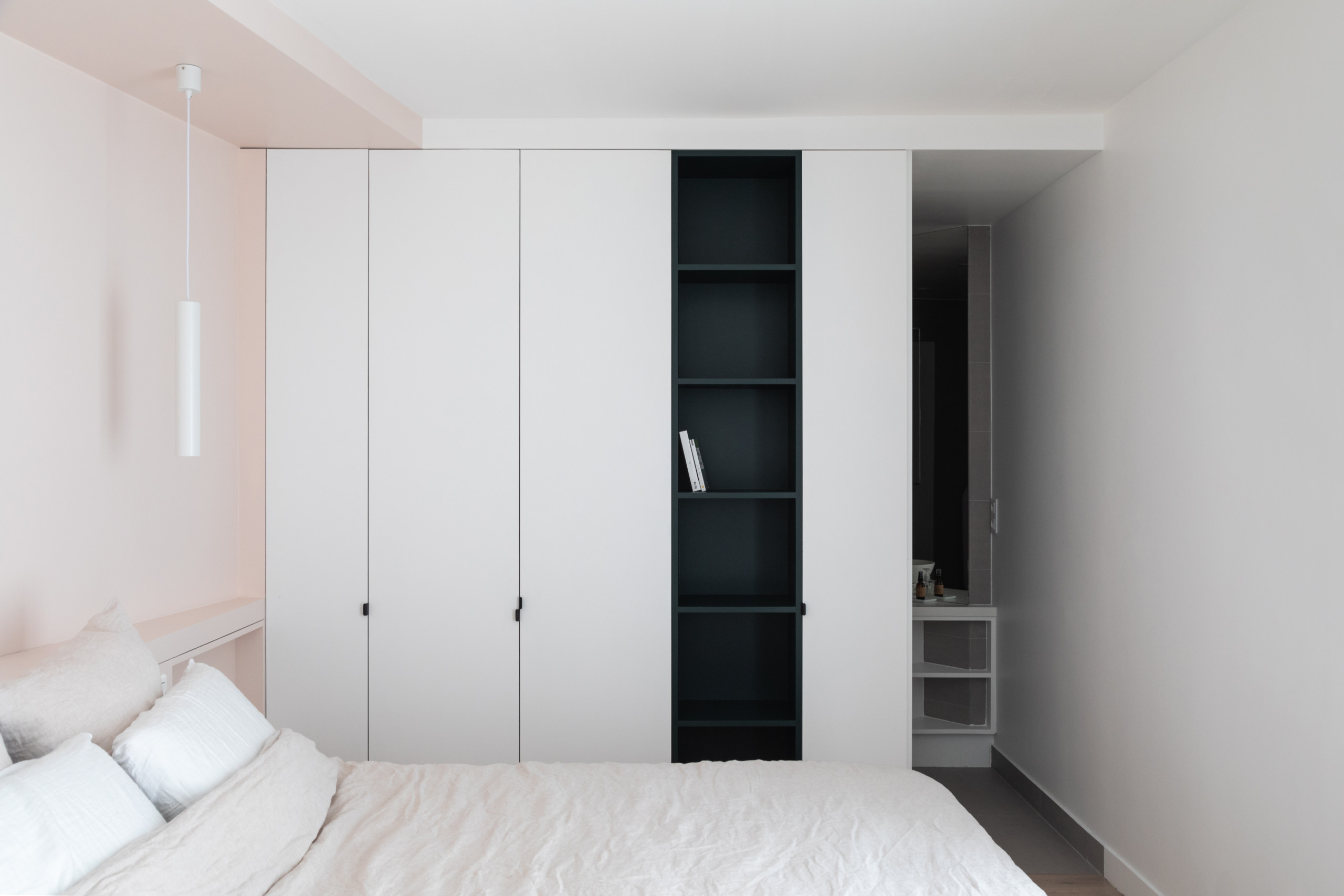 Pour séparer la salle de bain de la chambre et créer plus d’intimité, une cloison a été montée et des placards installés, en guise de dressing.