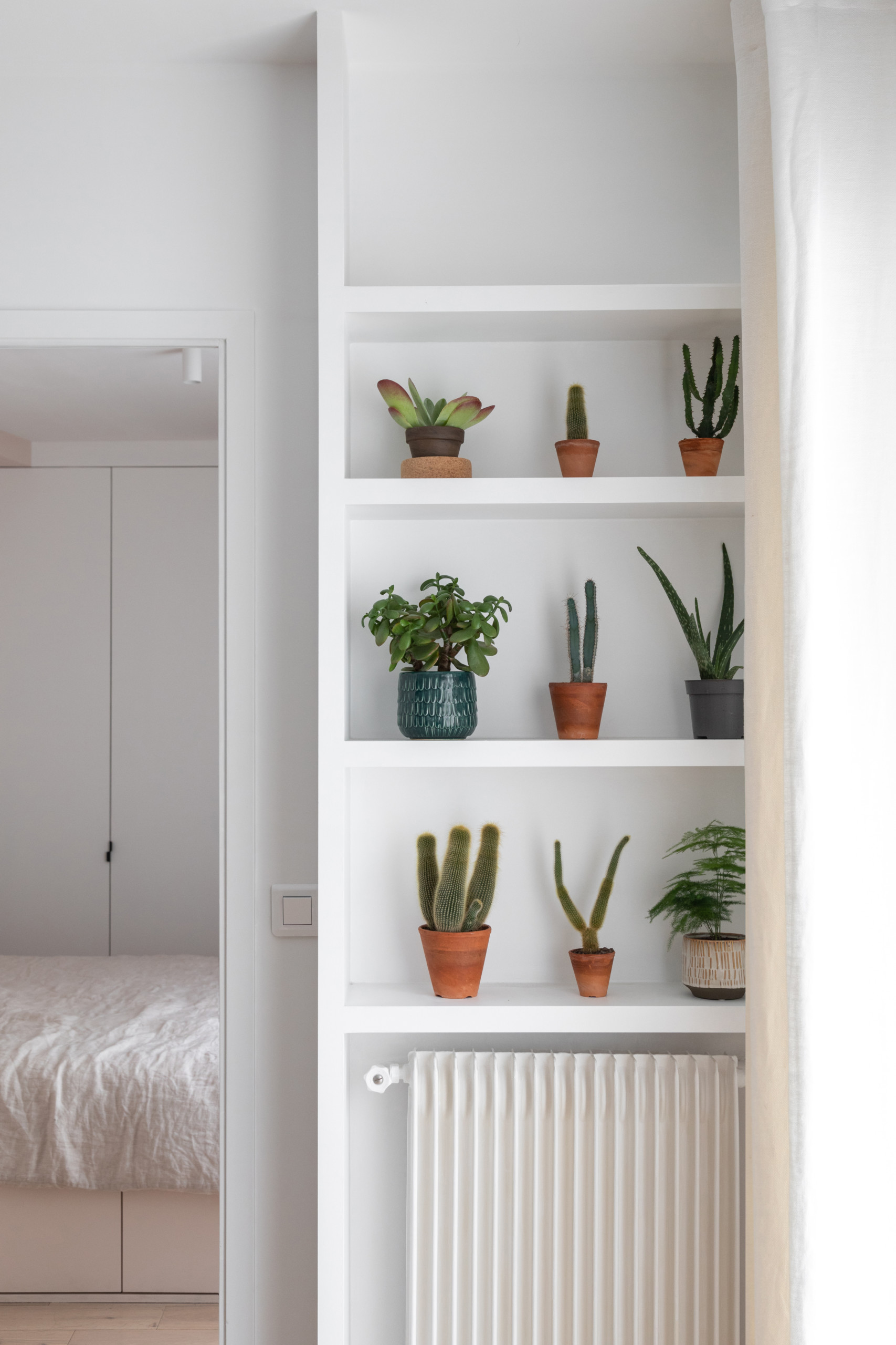 Direction la chambre, annoncée par un mur d’étagères réalisées sur-mesure au-dessus du radiateur d’origine… l’espace est ainsi optimisé !