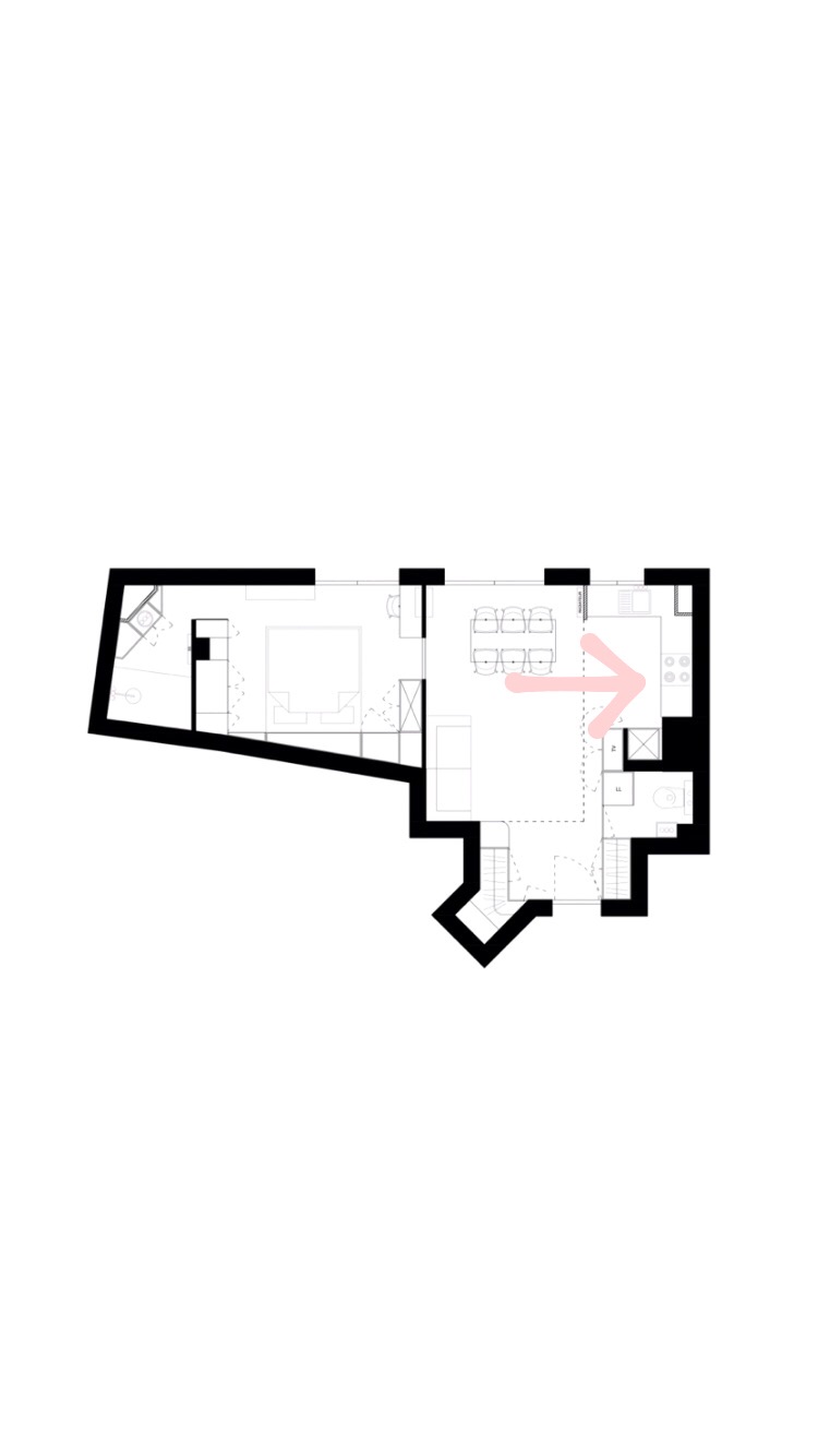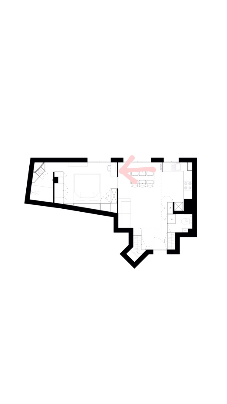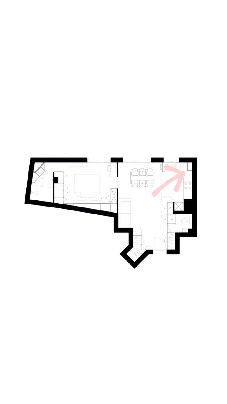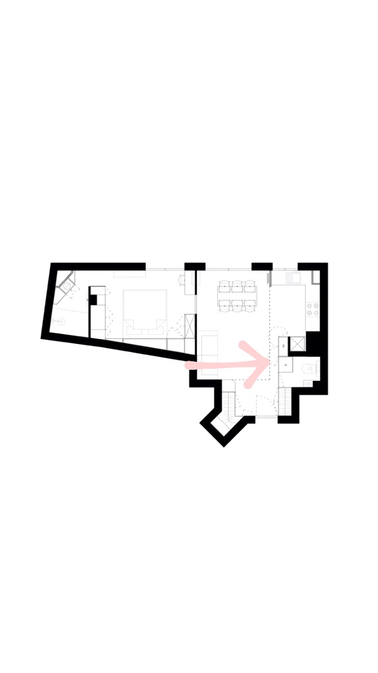 Pour rendre l’entrée fonctionnelle, un module de rangement toute hauteur a été installé dans l’alcôve. Le lien vers le salon se fait grâce à un petit meuble inclus dans l’espace d’entrée et faisant office de “bout de canapé”.