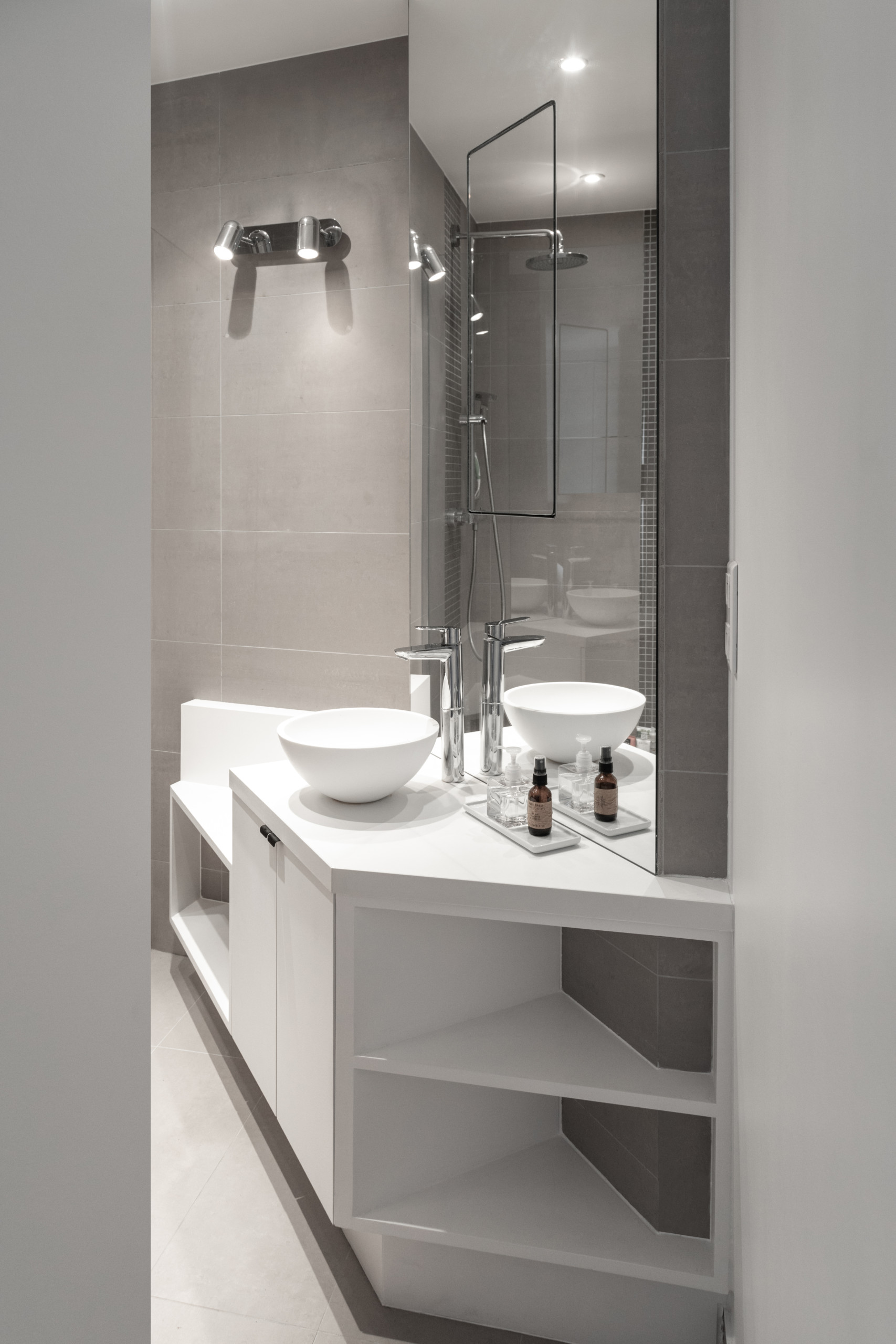 Dans la salle de bain : des plaques de carrelage gris, une grande douche à l’italienne et un module de rangement réalisé sur-mesure pour ne perdre aucun espace !