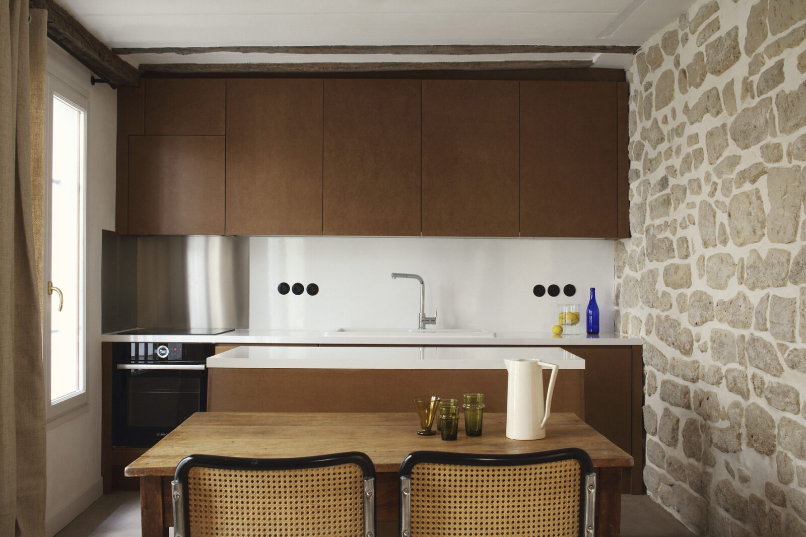 Situé en fond de cour, l’appartement est organisé en L, avec une seule façade percée d’ouvertures. L’entrée, ponctuée de menuiseries en médium qui rappellent les poutres laissées apparentes au plafond, se fait directement dans l’espace cuisine.