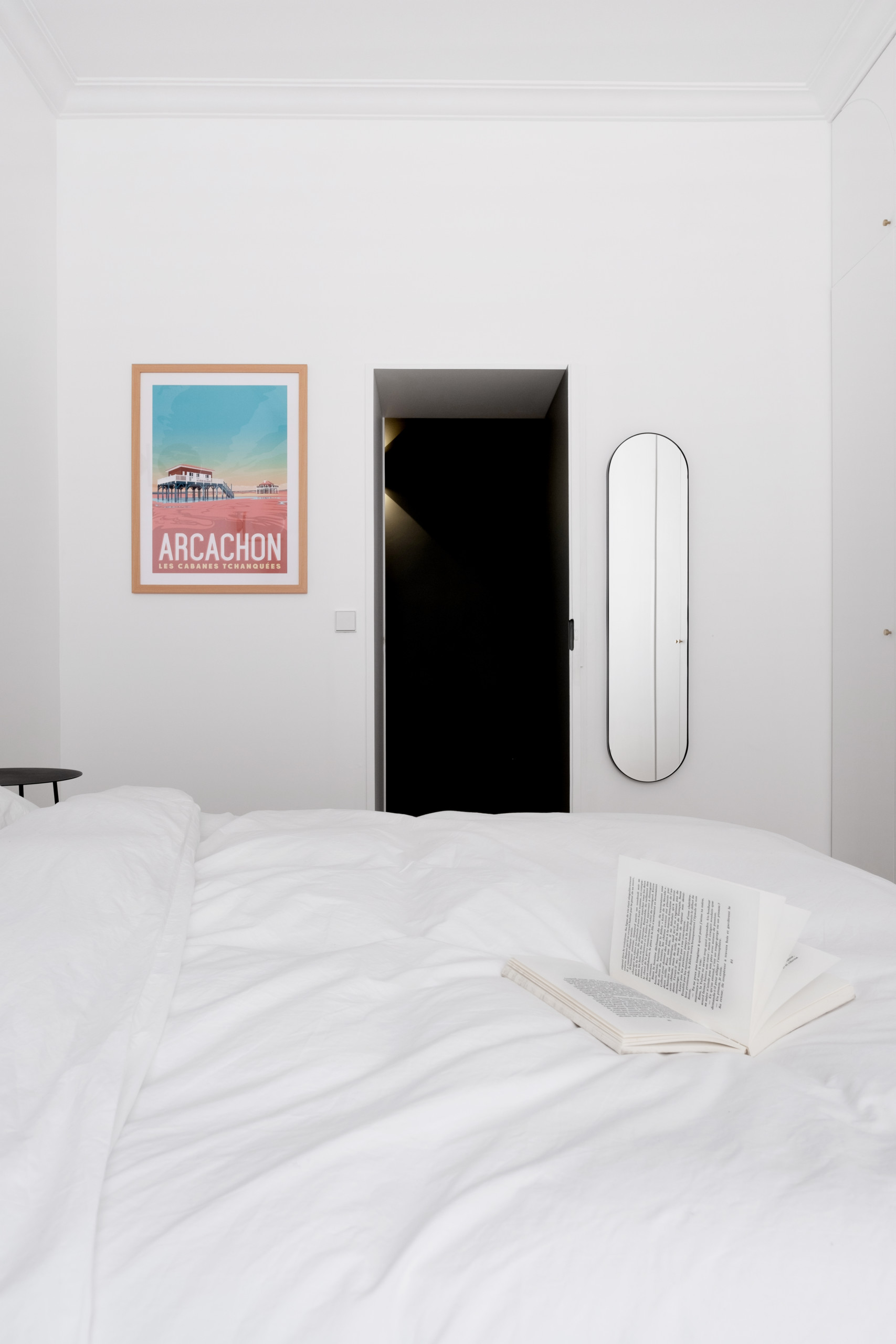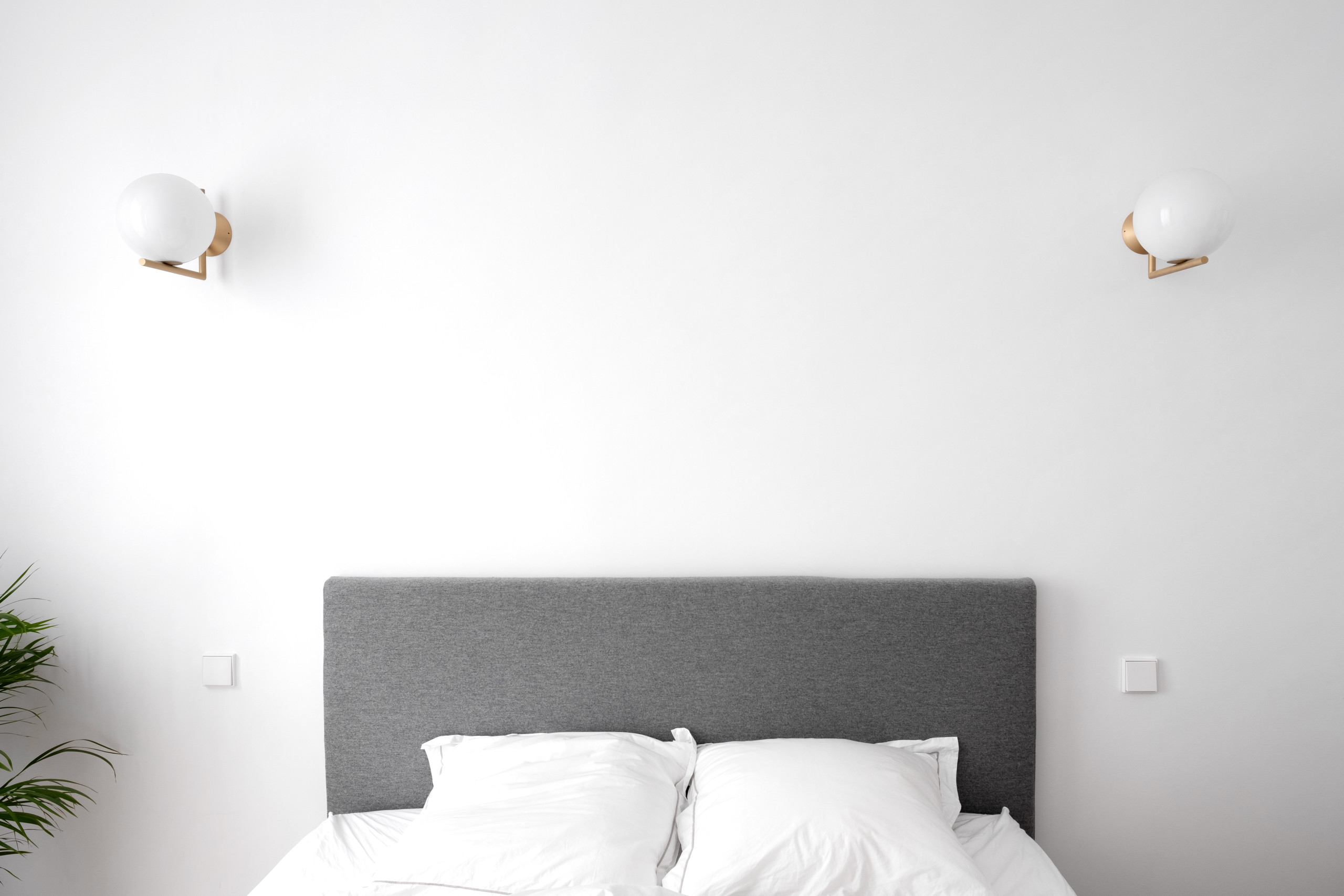 Les murs ont été laissés blanc, comme dans le reste de l’appartement. La tête de lit, en tissu gris, amène une touche de douceur à la composition.