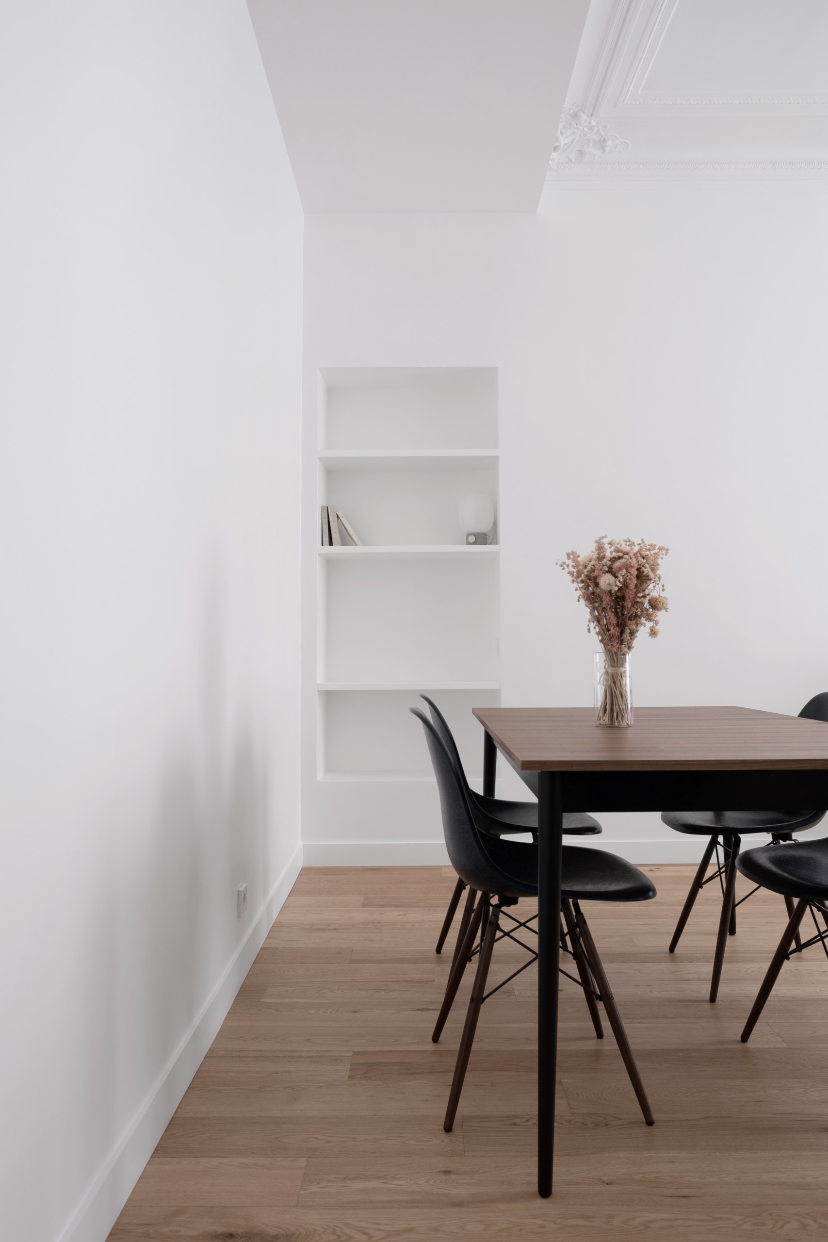 À droite de la table à manger, une bibliothèque a été aménagée dans la profondeur du mur. Parfait pour y disposer livres et objets !