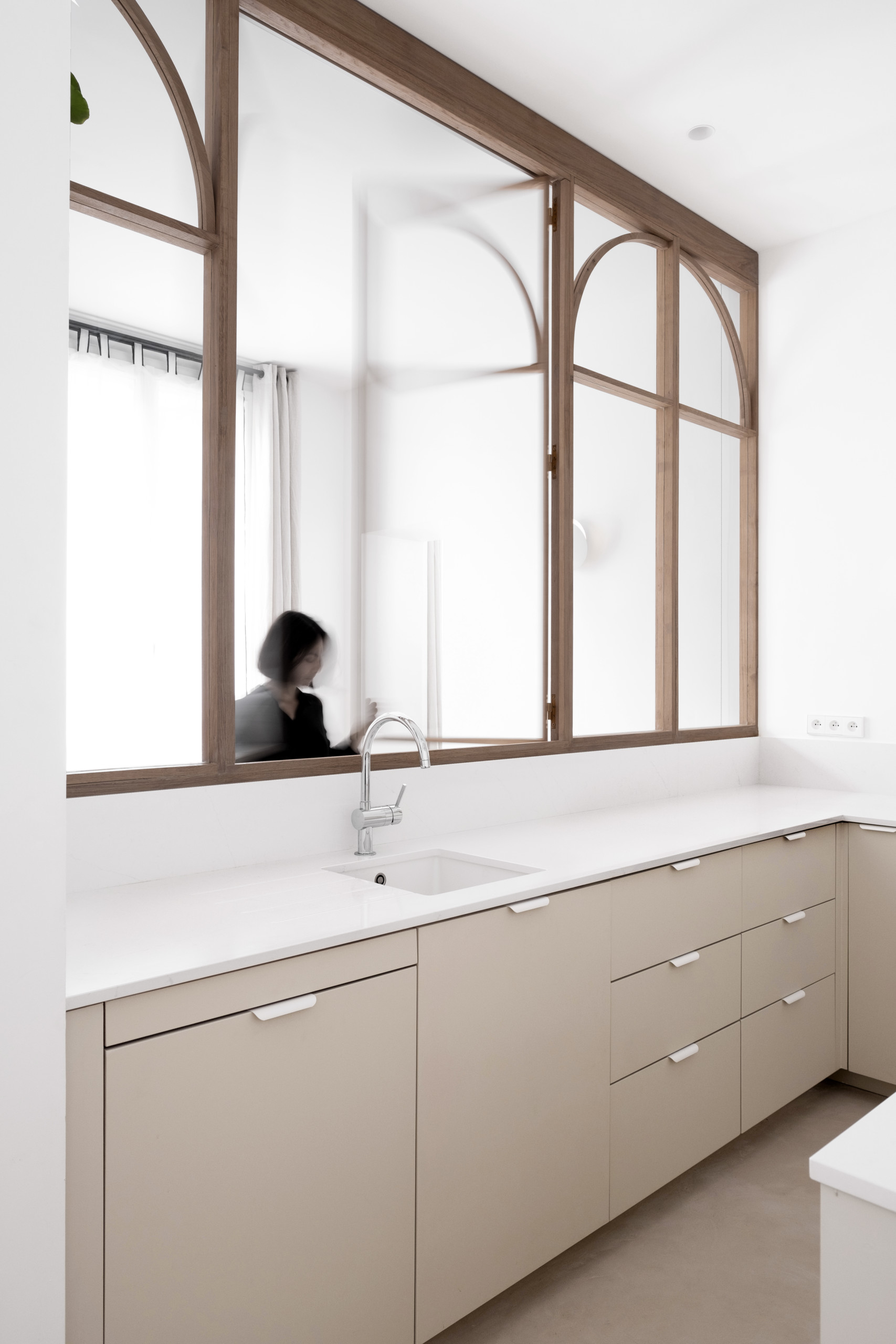 Arche Béton ciré Bibliothèque Bois Carrelage Cuisine ouverte Dressing Laiton Miroir Moulure Mur coloré Plantes Verrière