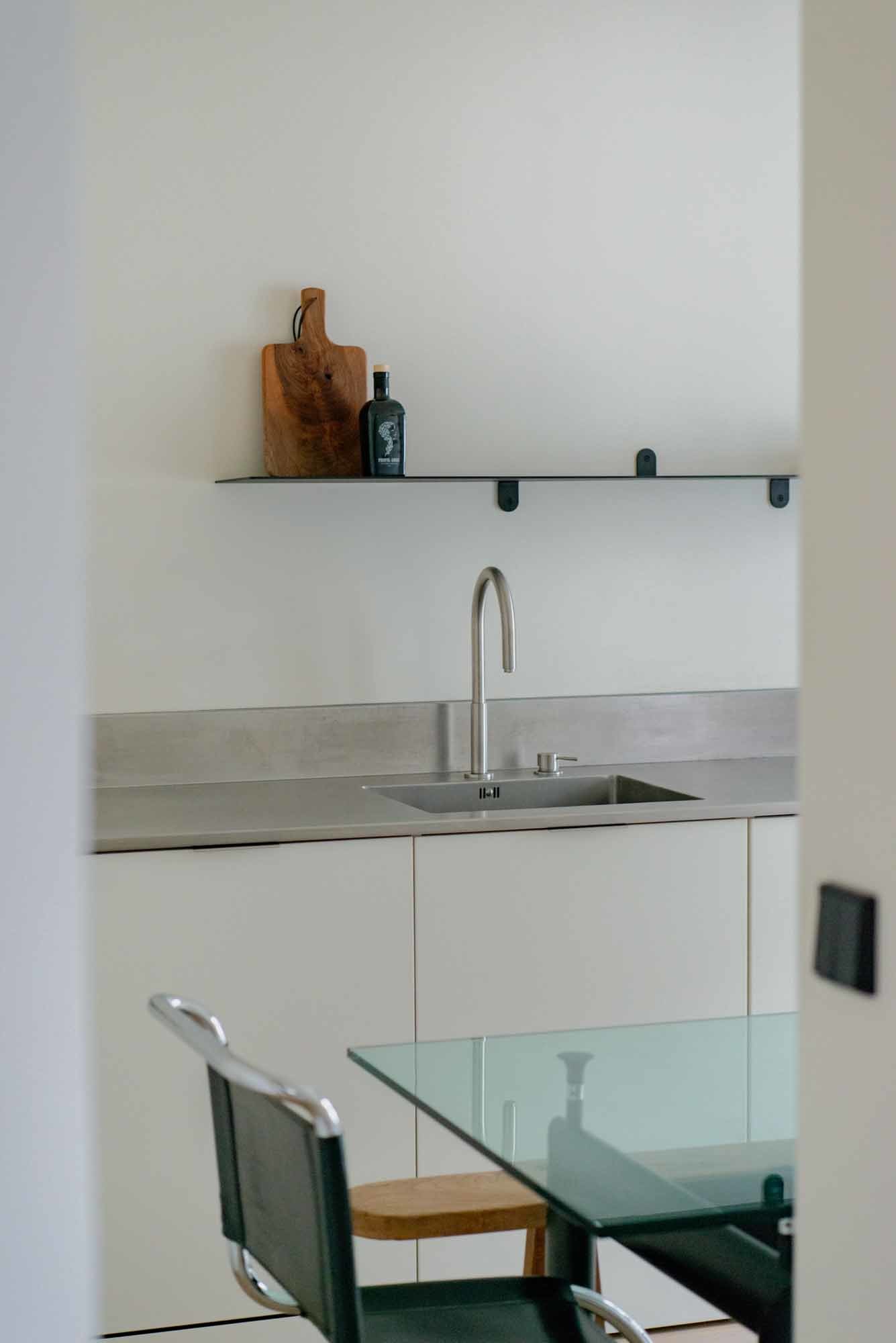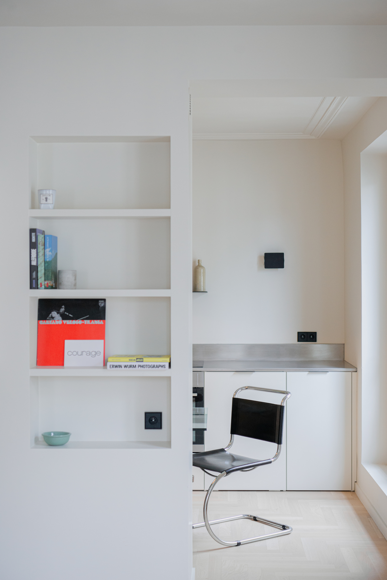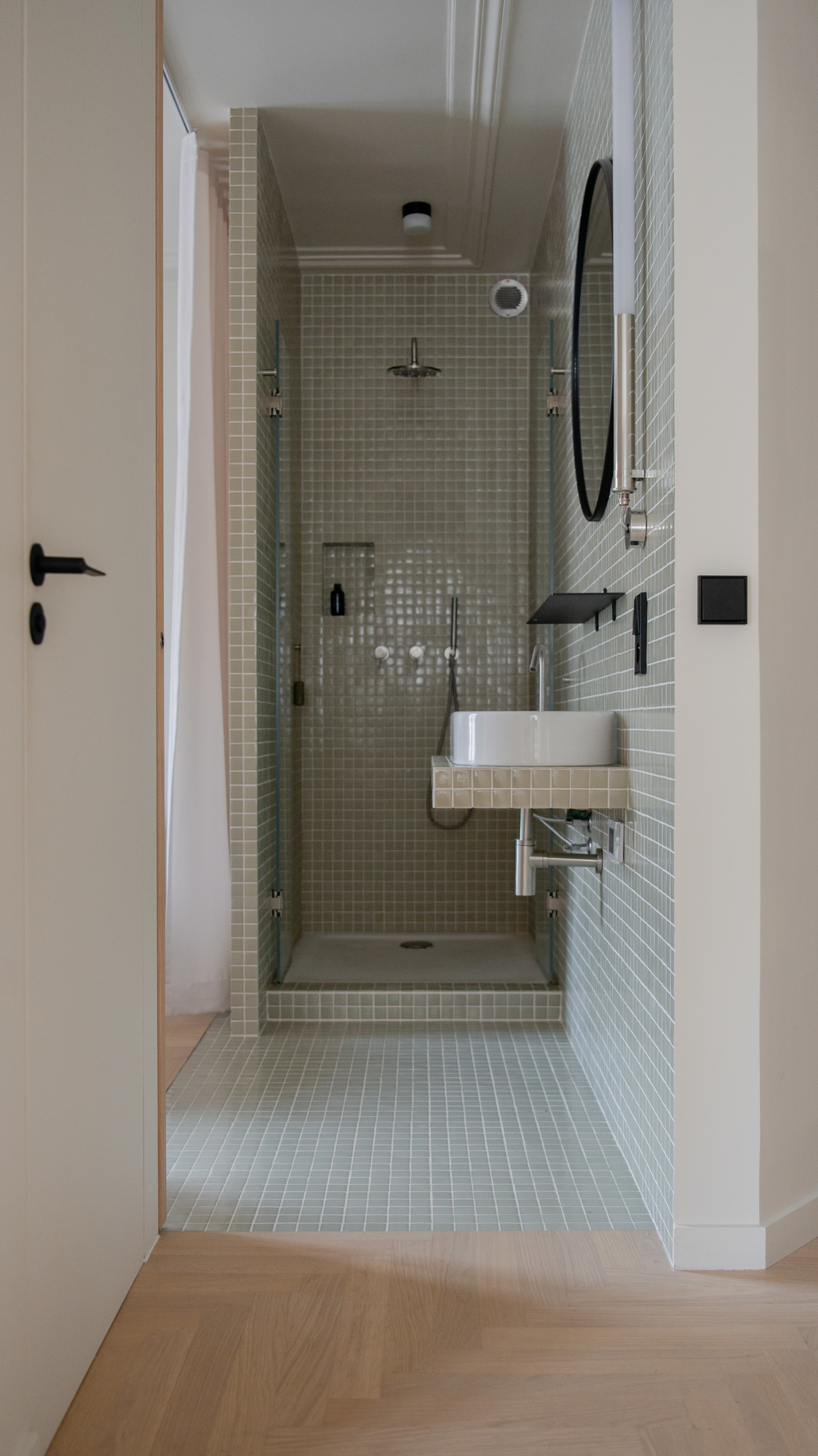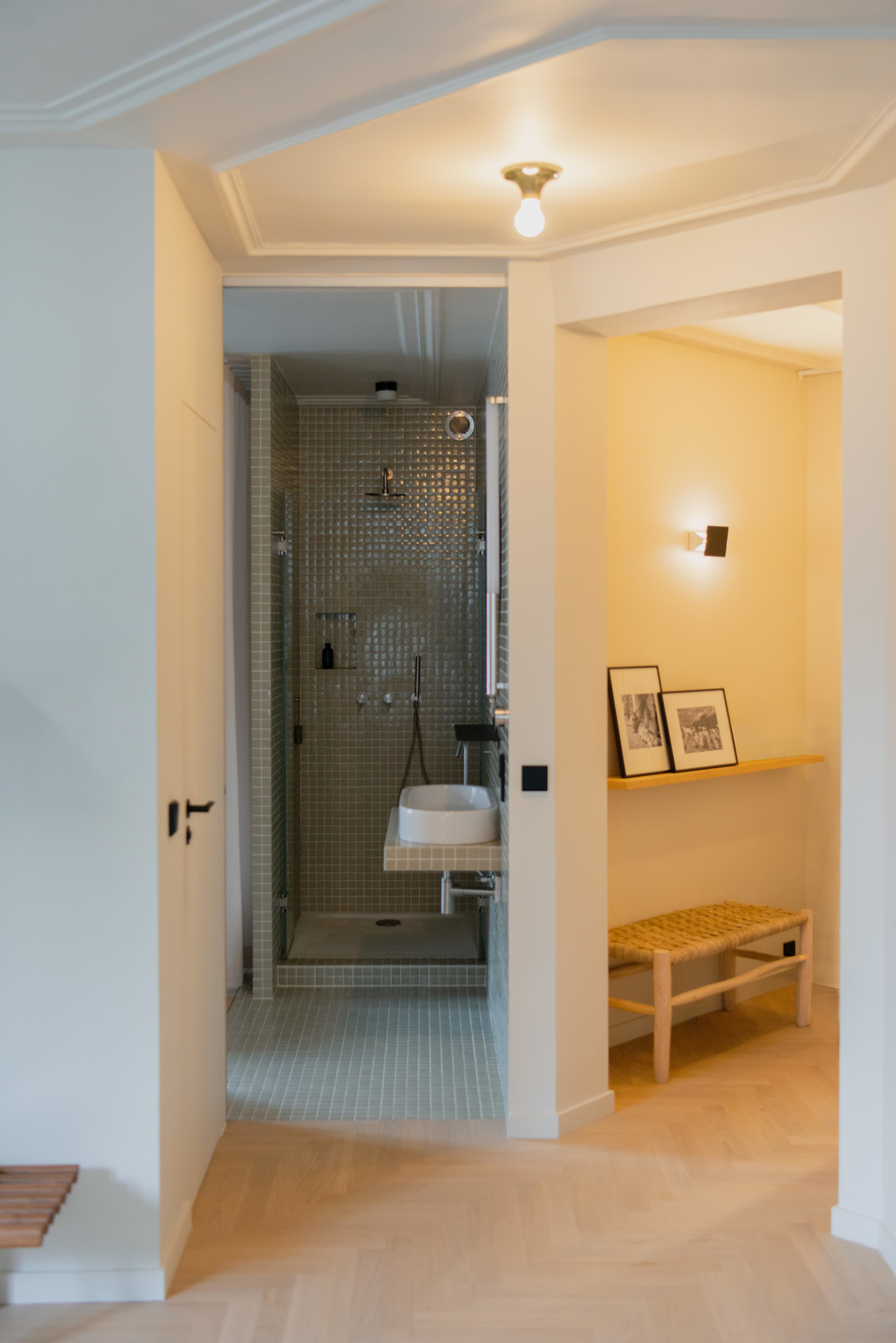 Un parquet Bauwerk à chevrons recouvre uniformément le sol pour confondre les pièces, à l’exception de la salle d’eau qui se pare de carreaux en pâte de verre.