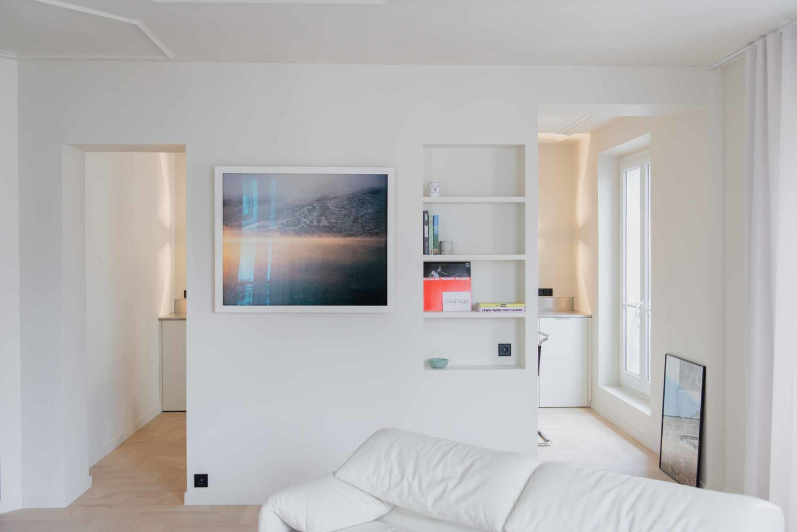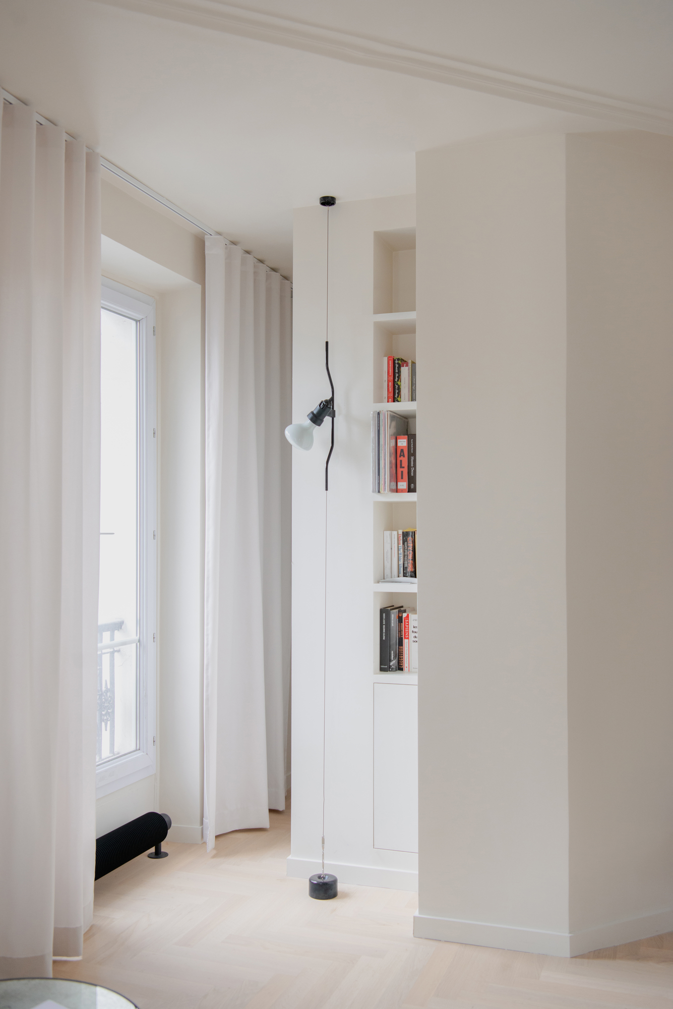L’application uniforme de blanc des murs au plafond augmente la sensation d’espace et brouille les lignes, faisant oublier l’enveloppe alambiquée de l’appartement.