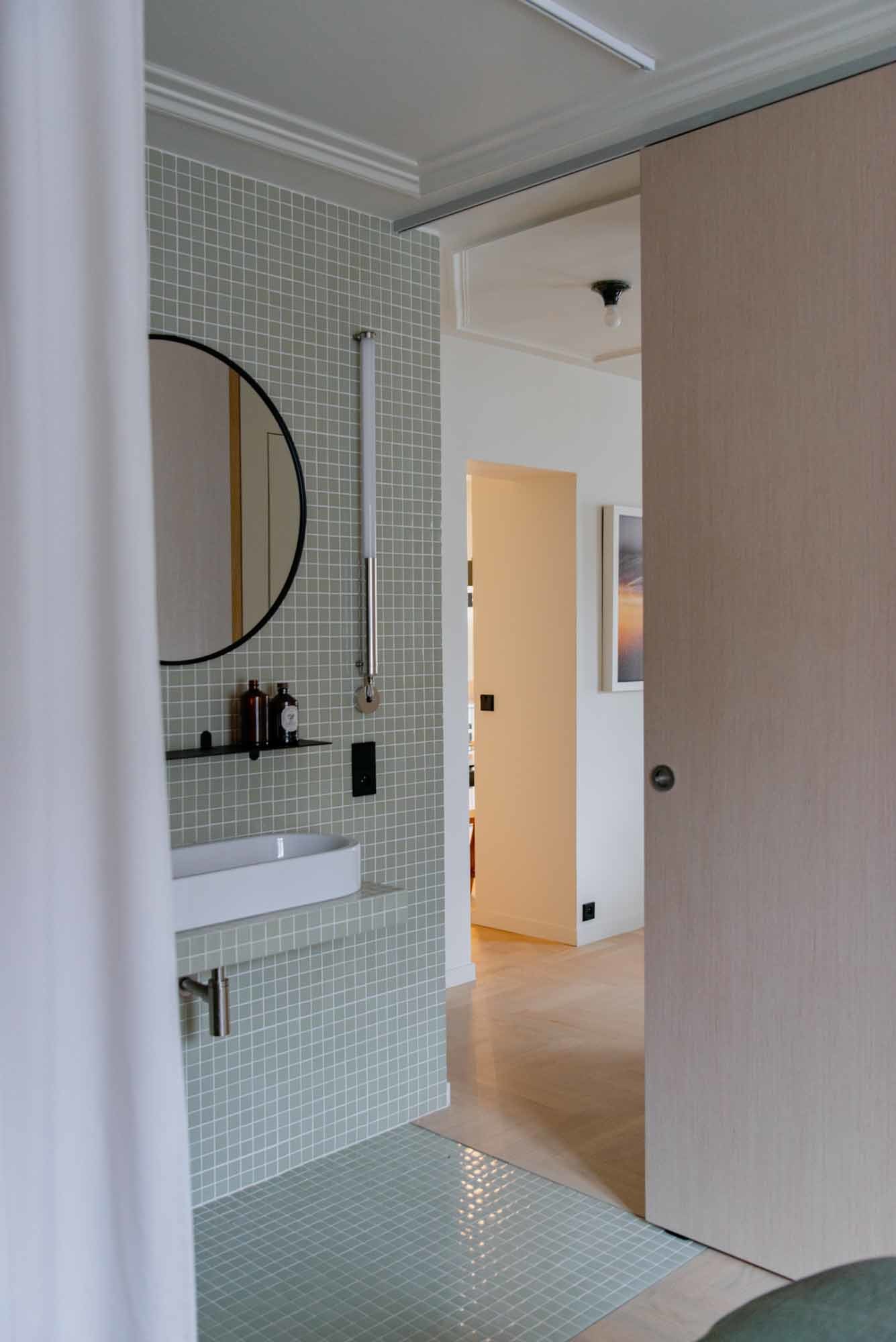 Une porte coulissante toute hauteur en bois permet de cloisonner au besoin la salle d’eau pour retrouver son intimité.