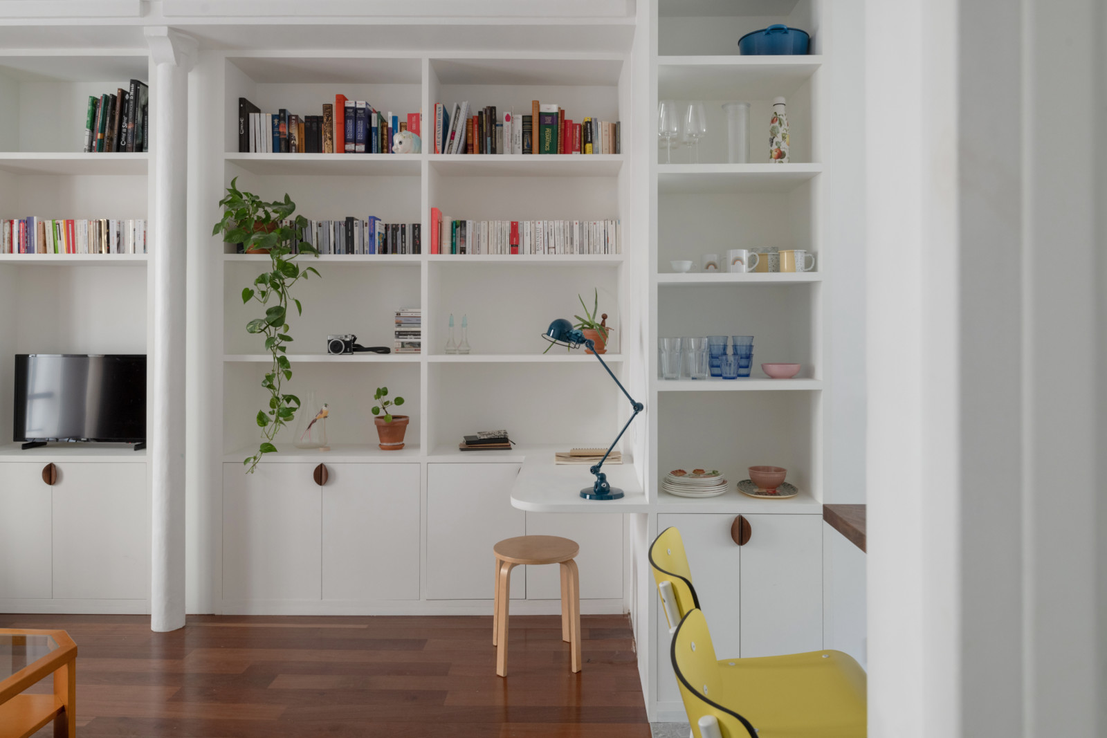 … avec un bar pour délimiter les espaces. Les tabourets jaunes assurent le show de la couleur. Au fond, un petit coin bureau intégré.