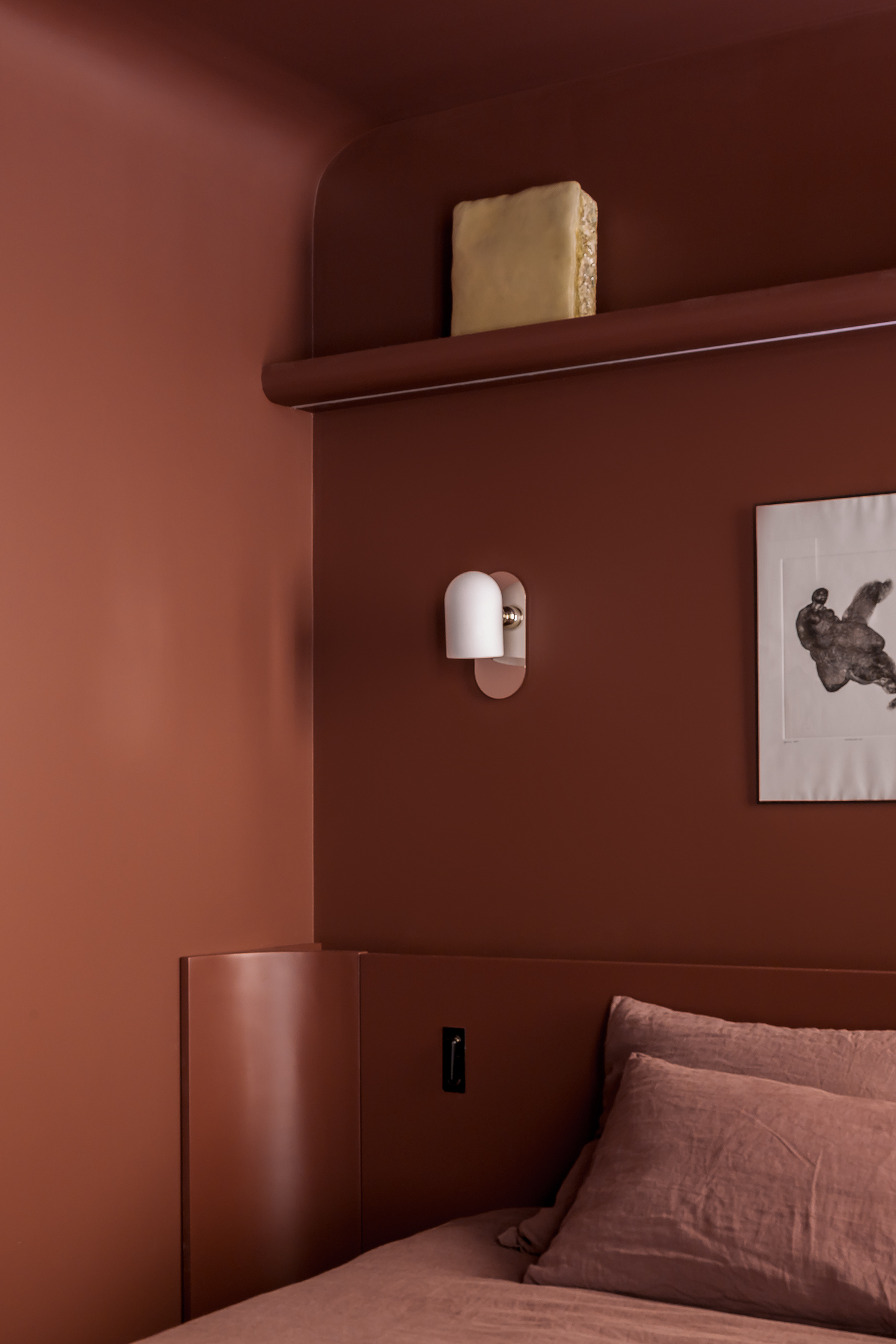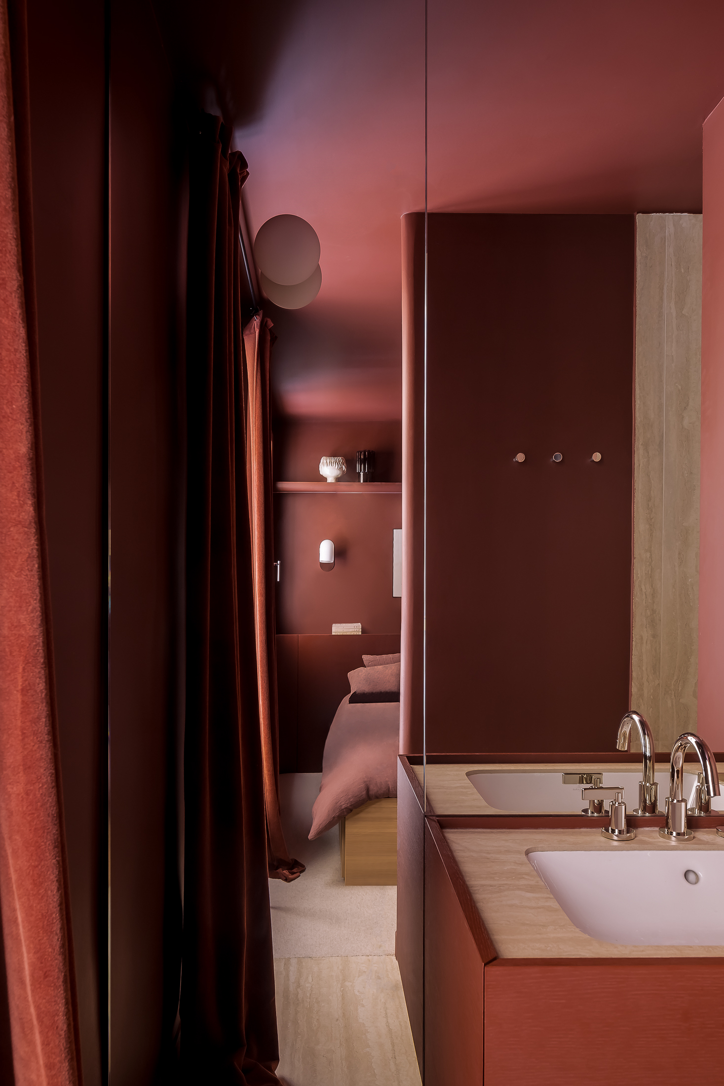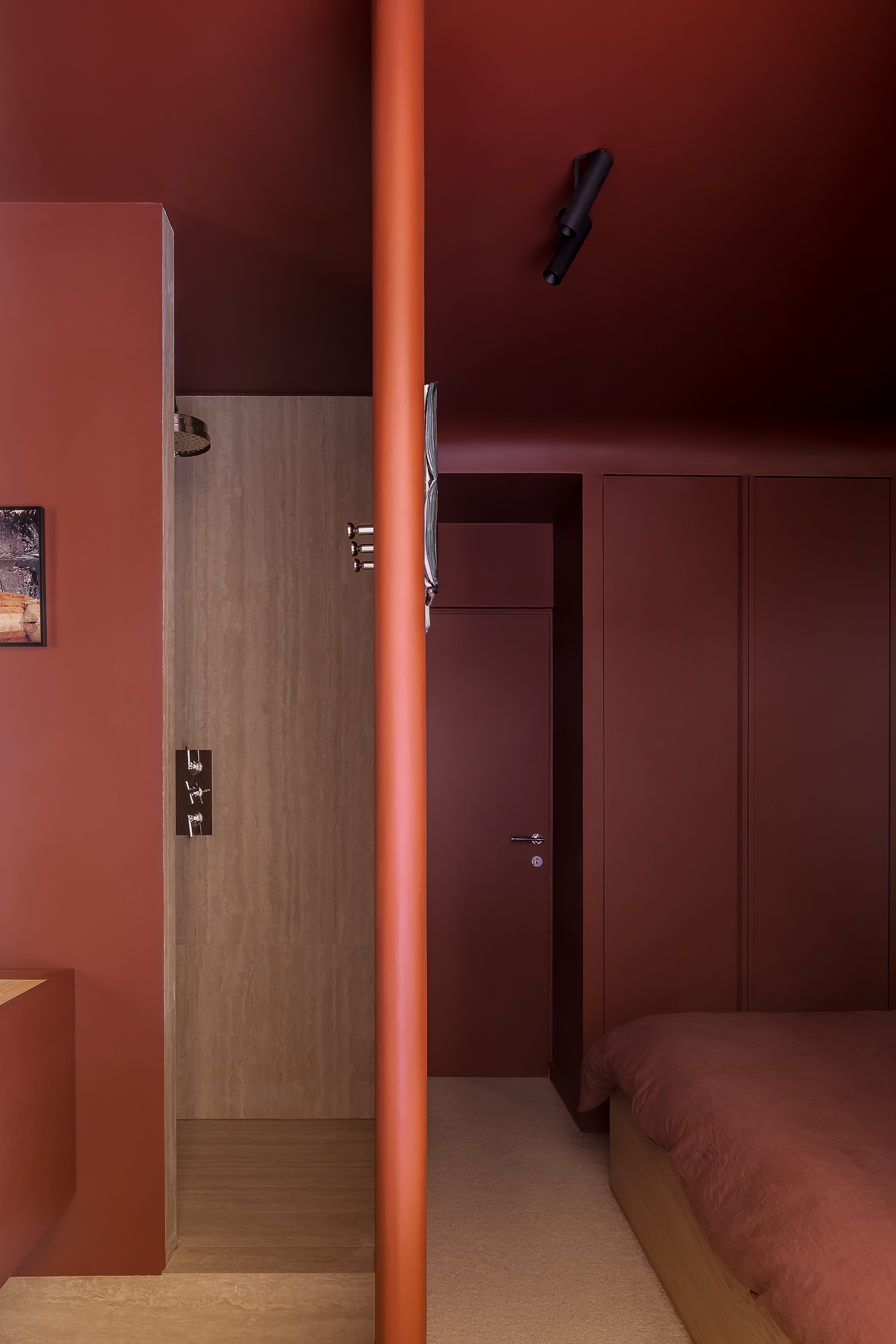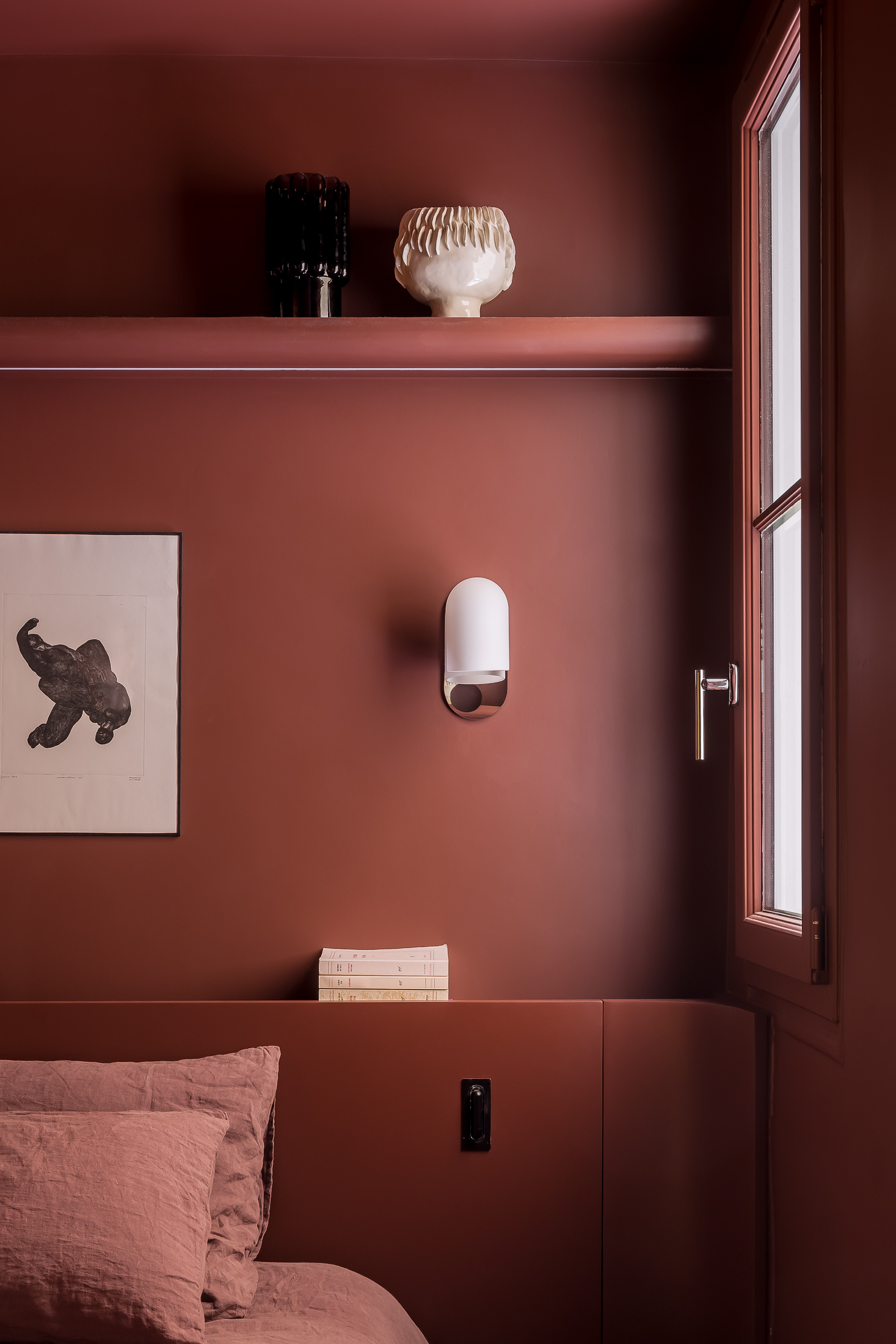 La visite commence par la chambre, enveloppée dans un ton rouge brun très chaleureux.