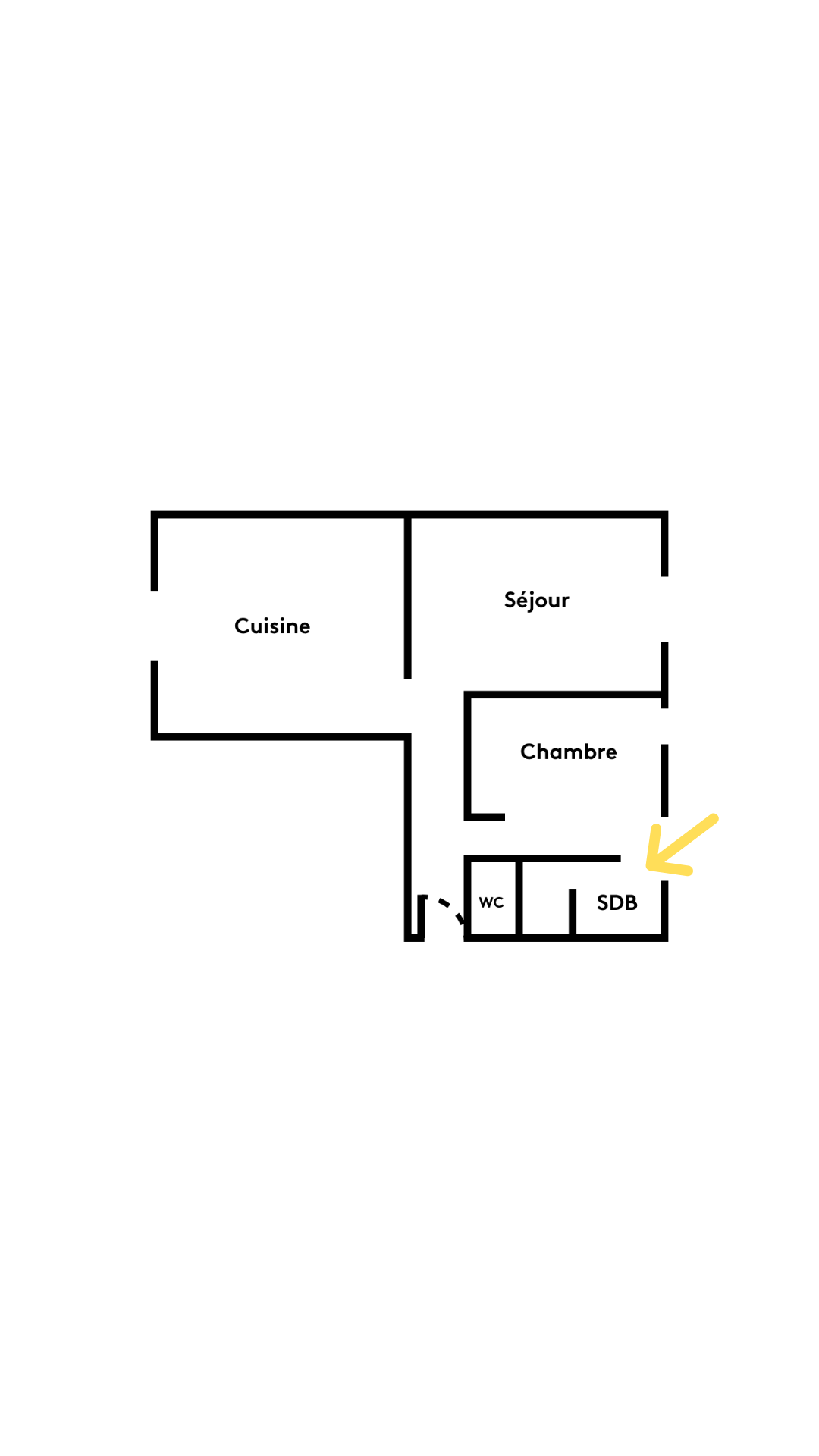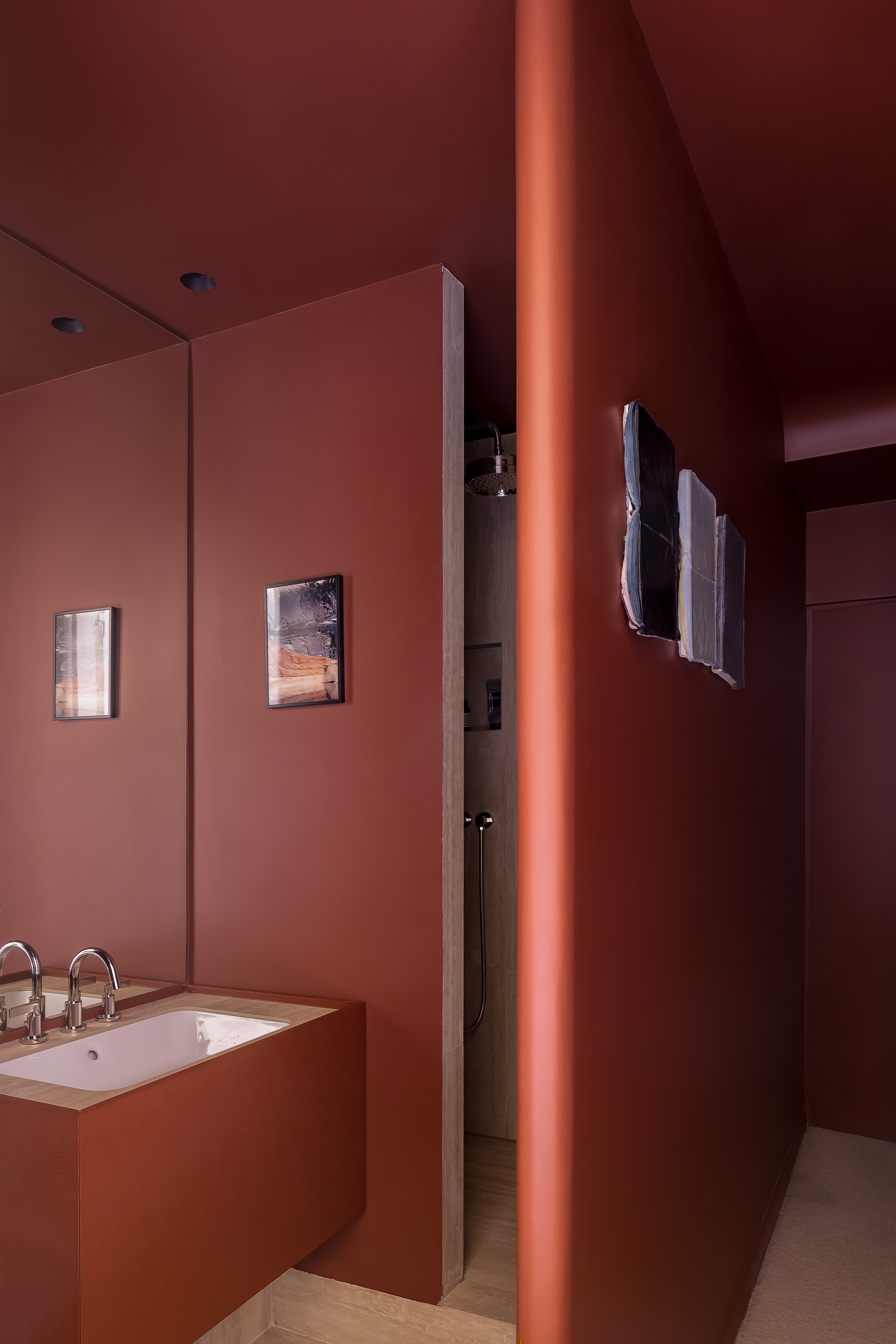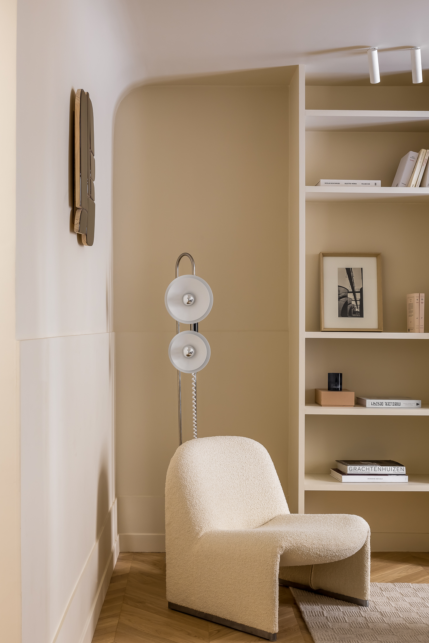 On retrouve ce jeu d’arrondis sur la tranche de la cloison de la salle d’eau, assurant une transition voluptueuse vers cet espace.
