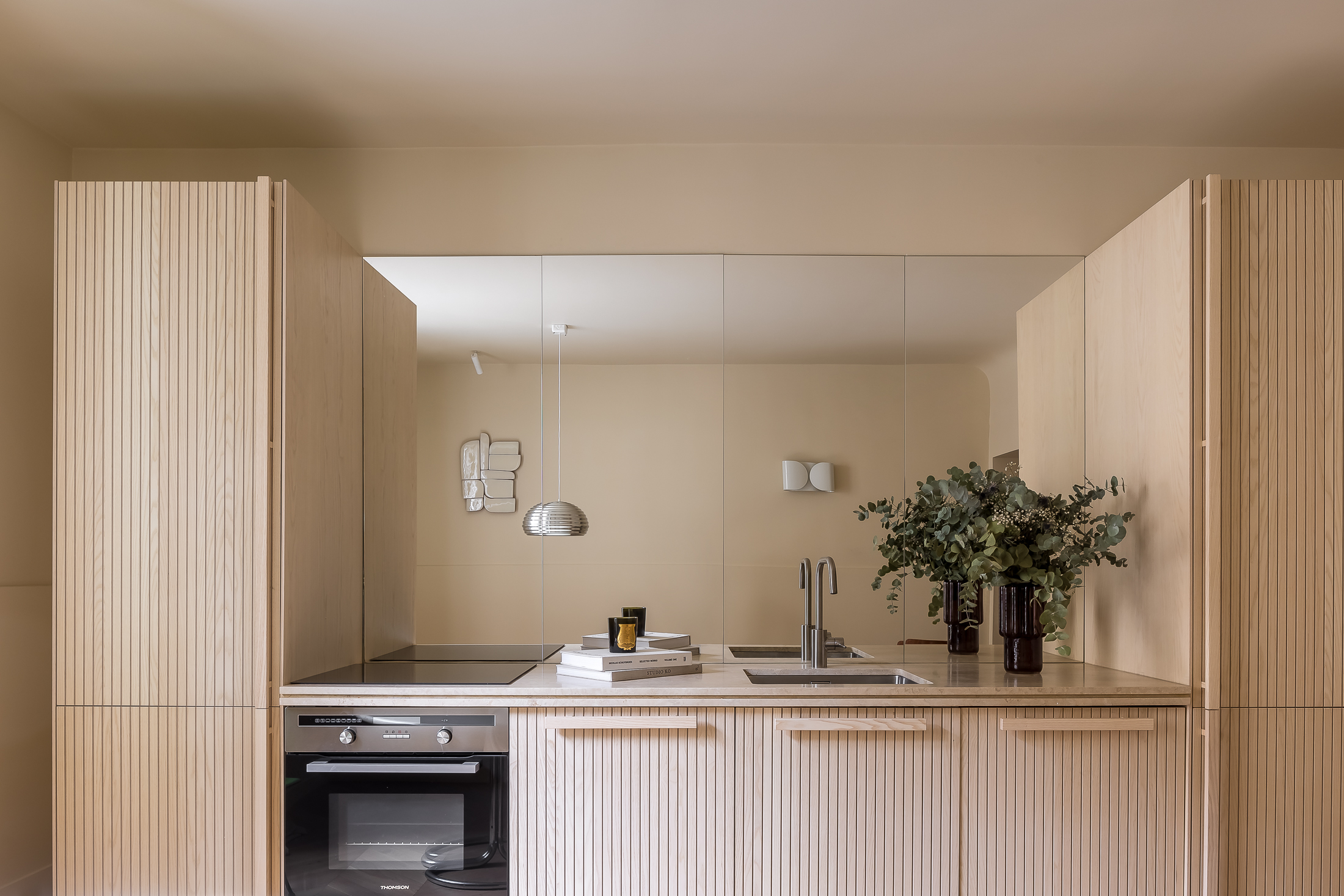 On retrouve le jeu de miroir qui théâtralise la cuisine, pour un effet quasi monumental qui ne laisse pas indifférent !