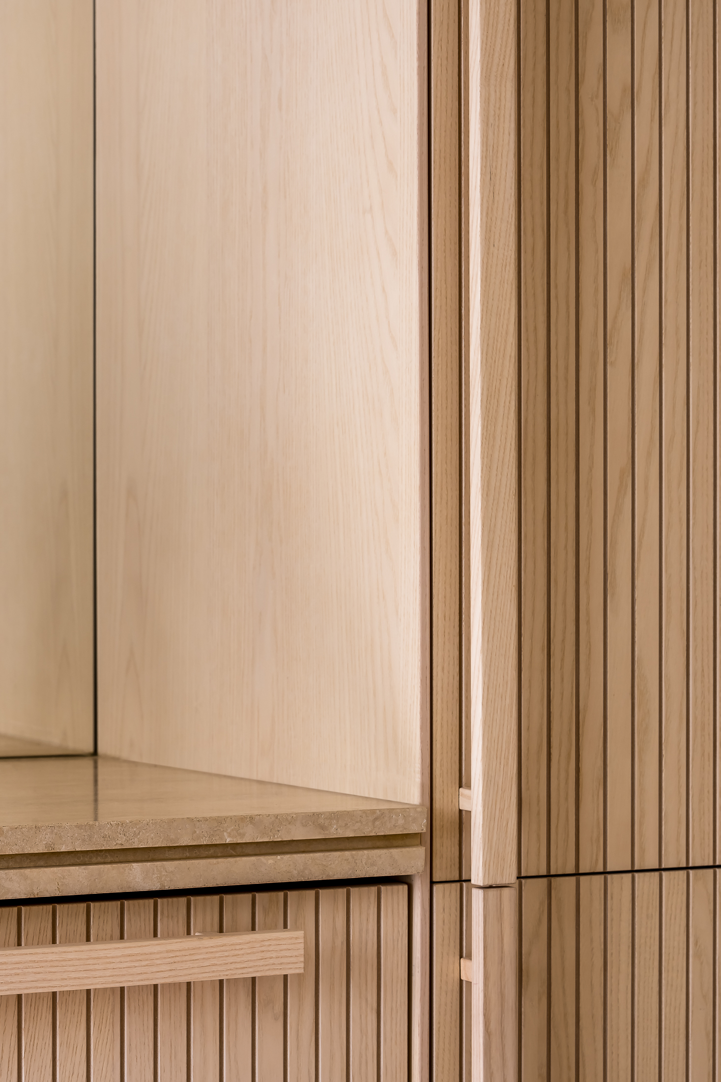 Zoom sur la complémentarité des lignes de chêne clair, au rendu très graphique.