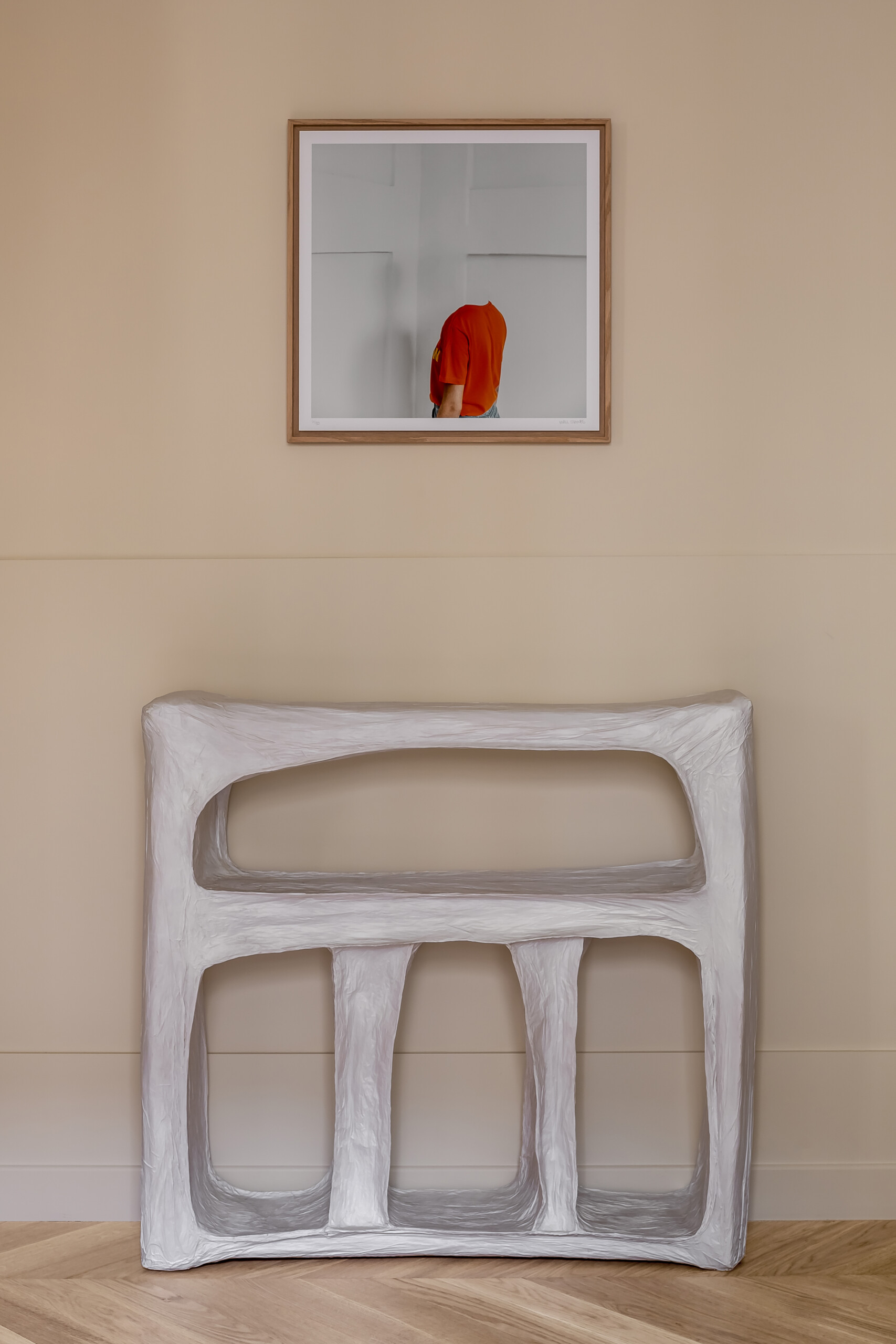 Sur le parquet en chêne, une console de papier calque et colle de riz de l’artiste Pao Hui Kao concilie art et usage !