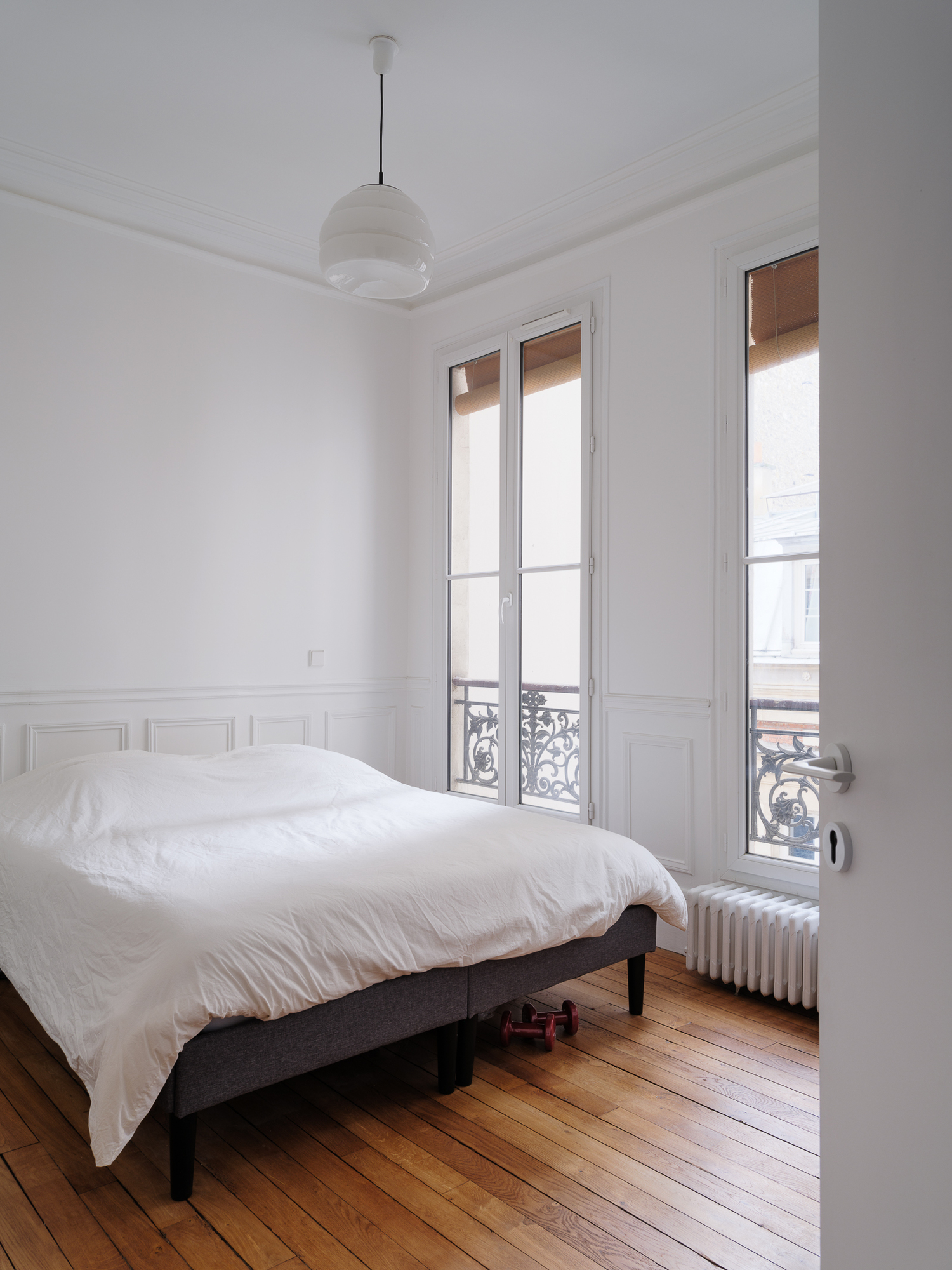 Dotée d’une belle hauteur sous plafond, la chambre fait valoir son caractère haussmannien. Elle donne sur le tranquille passage, un luxe à Paris !