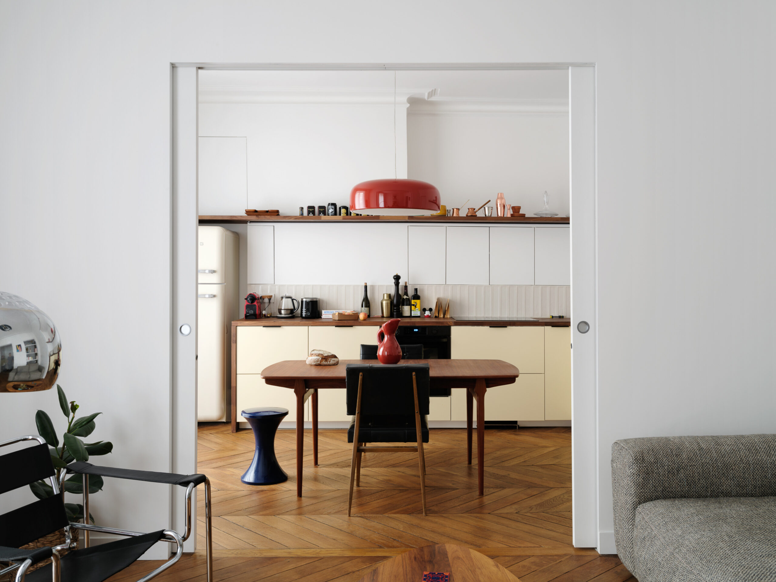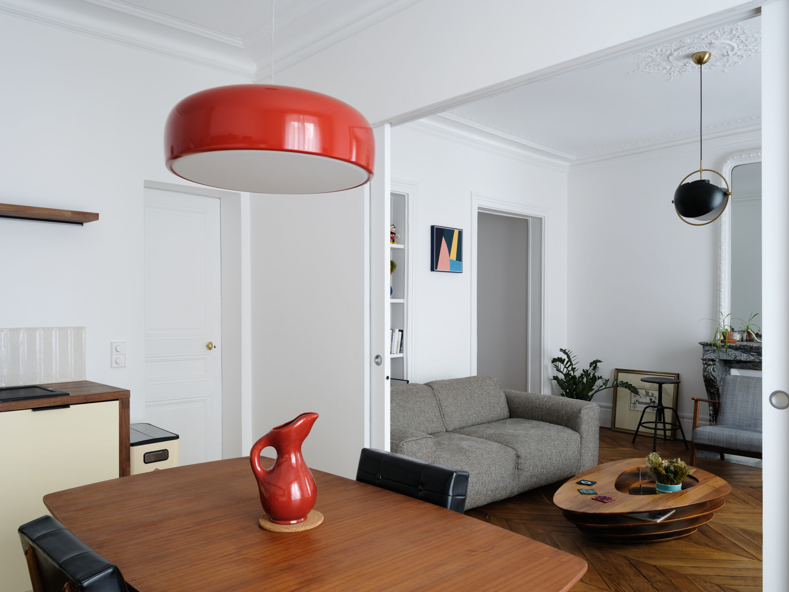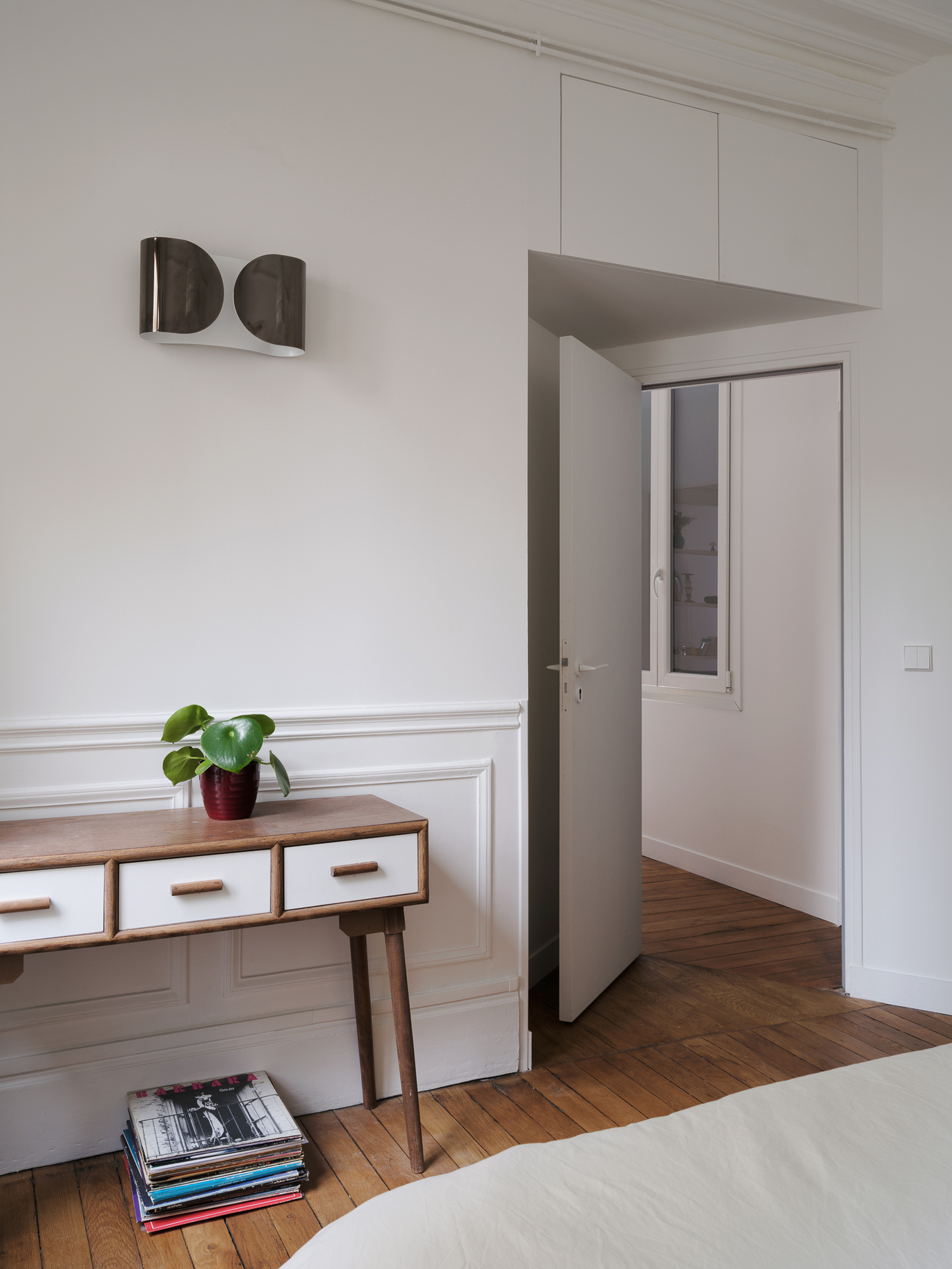 Au-dessus des portes, les volumes triangulaires sont utilisés comme espaces de rangement. Le luminaire Foglio chromé de Flos amène une touche seventies, en rappel à la décoration de la cuisine et du salon.