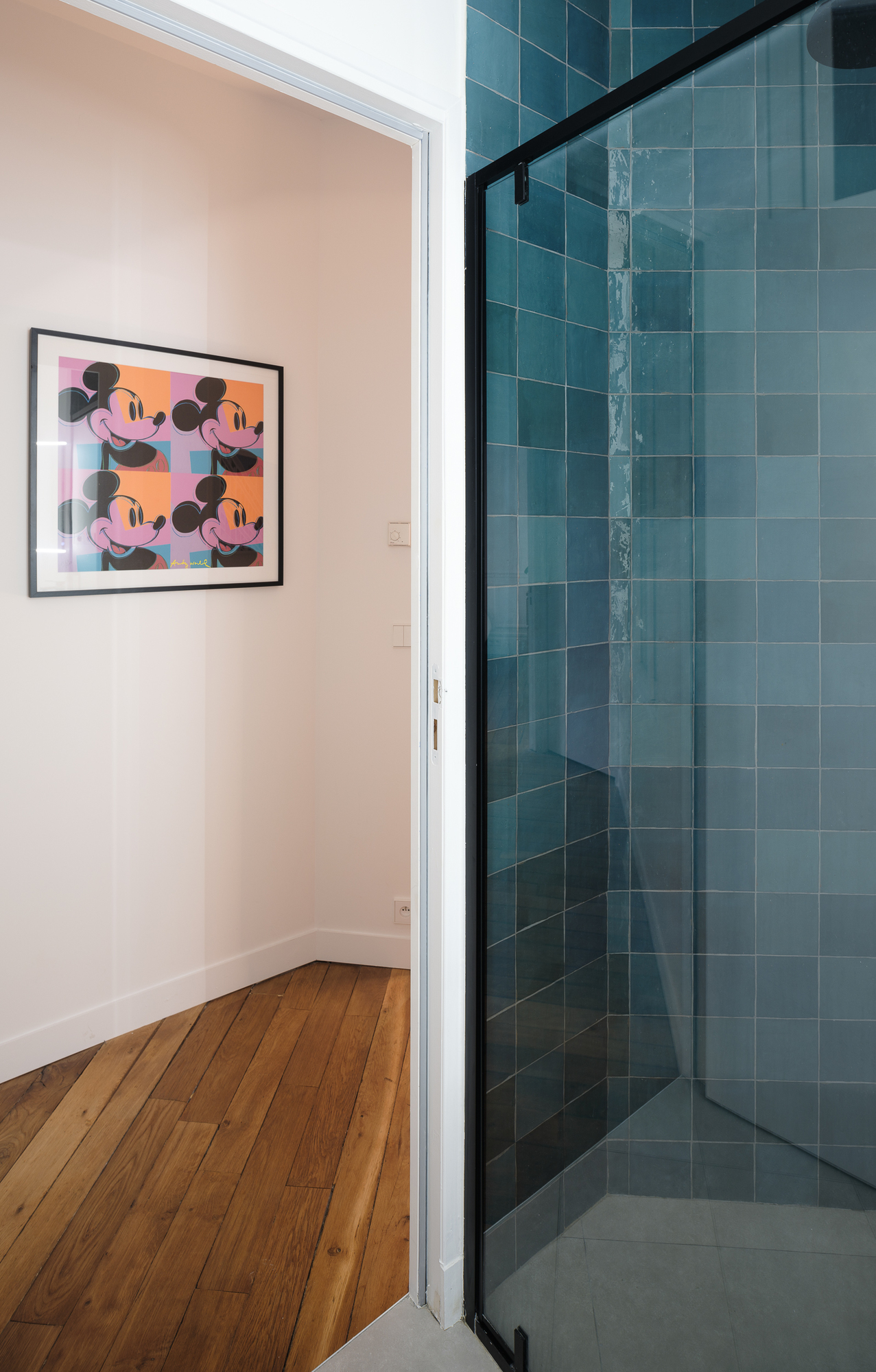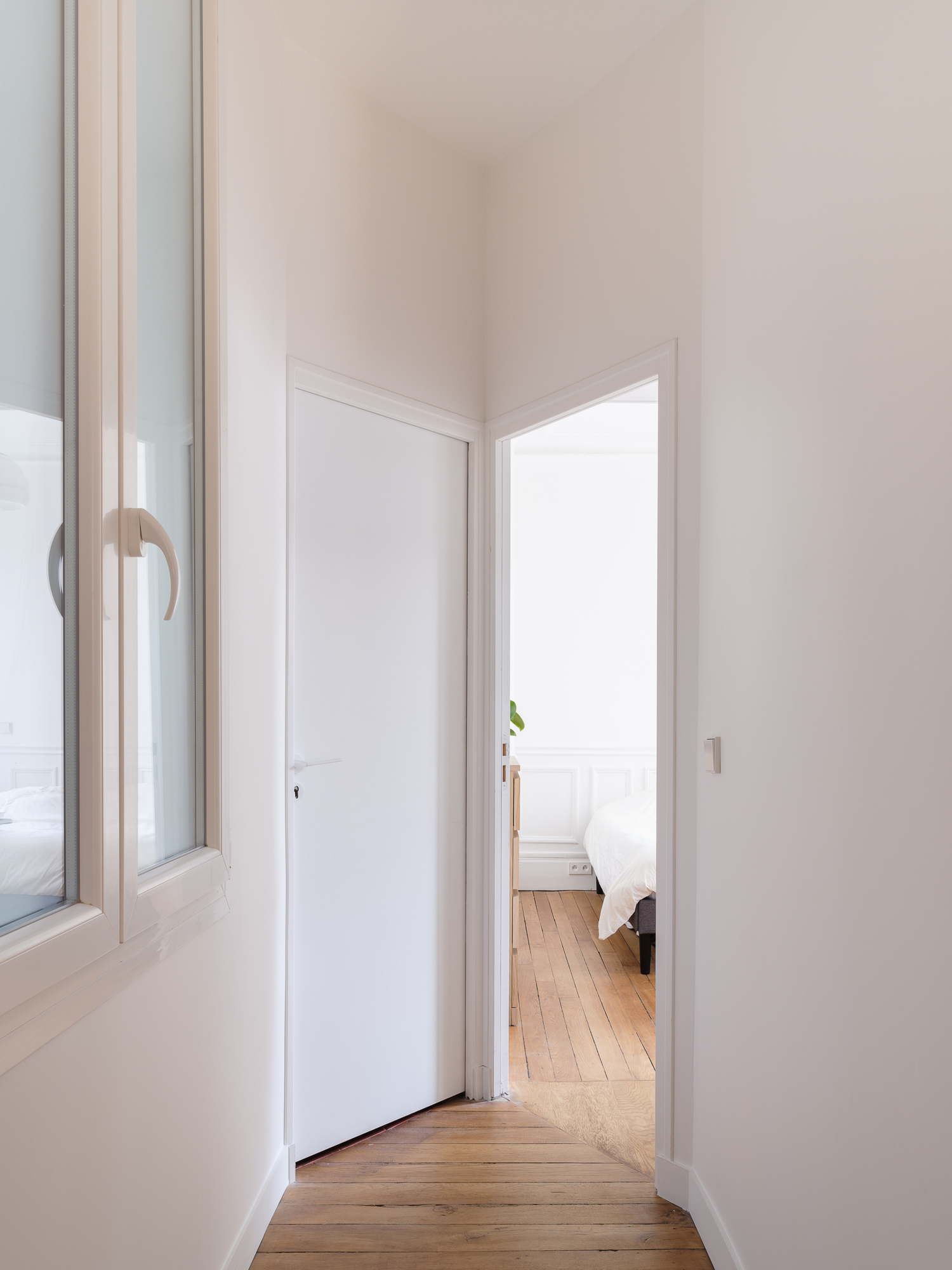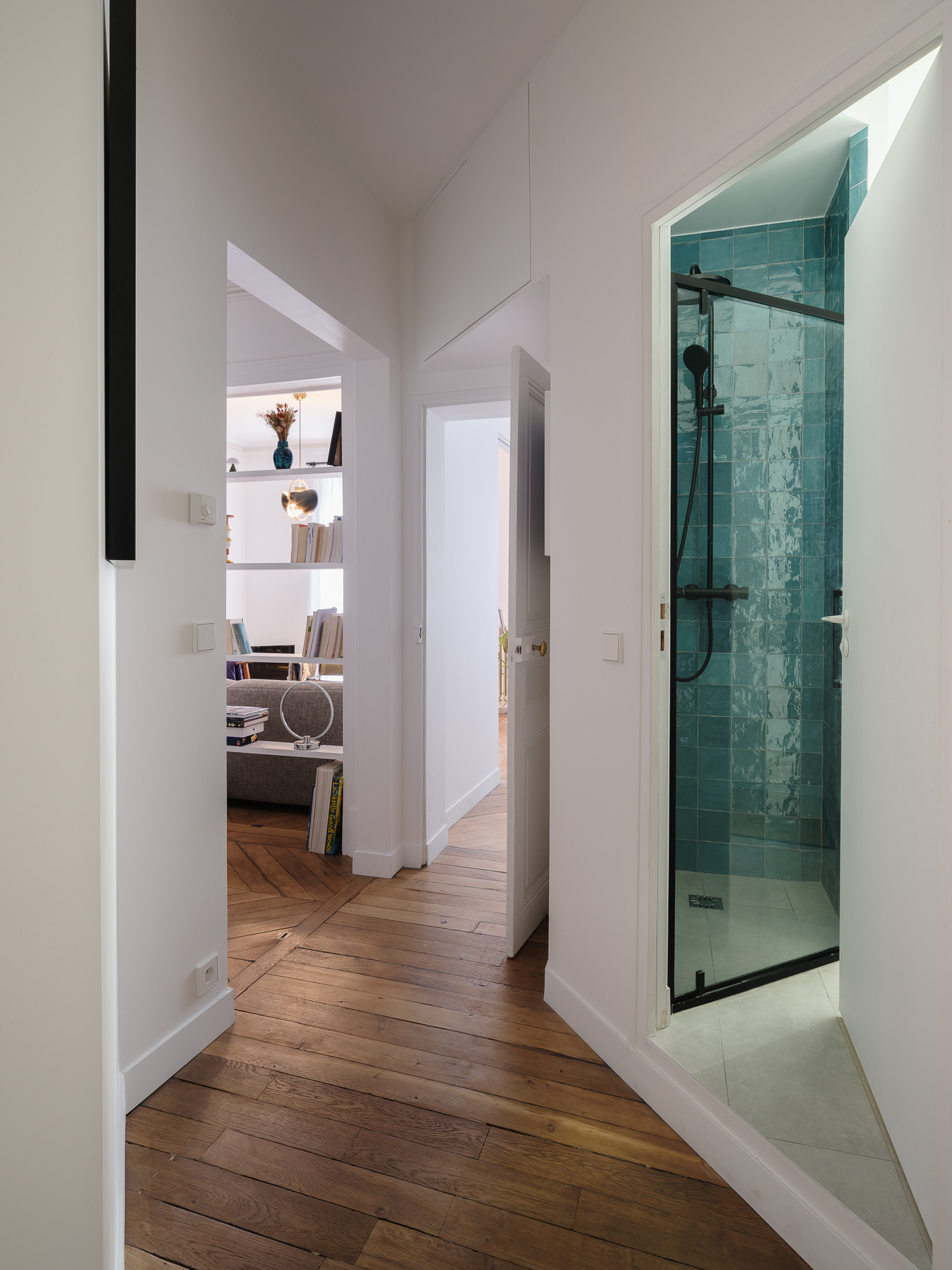 Le couloir, qui épouse la forme de la cage d’escalier, dessert les différentes pièces : à gauche, le dressing, au milieu, la cuisine et à droite, la salle d’eau. Autrefois étroit et fermé, il est désormais plus ouvert et lumineux.