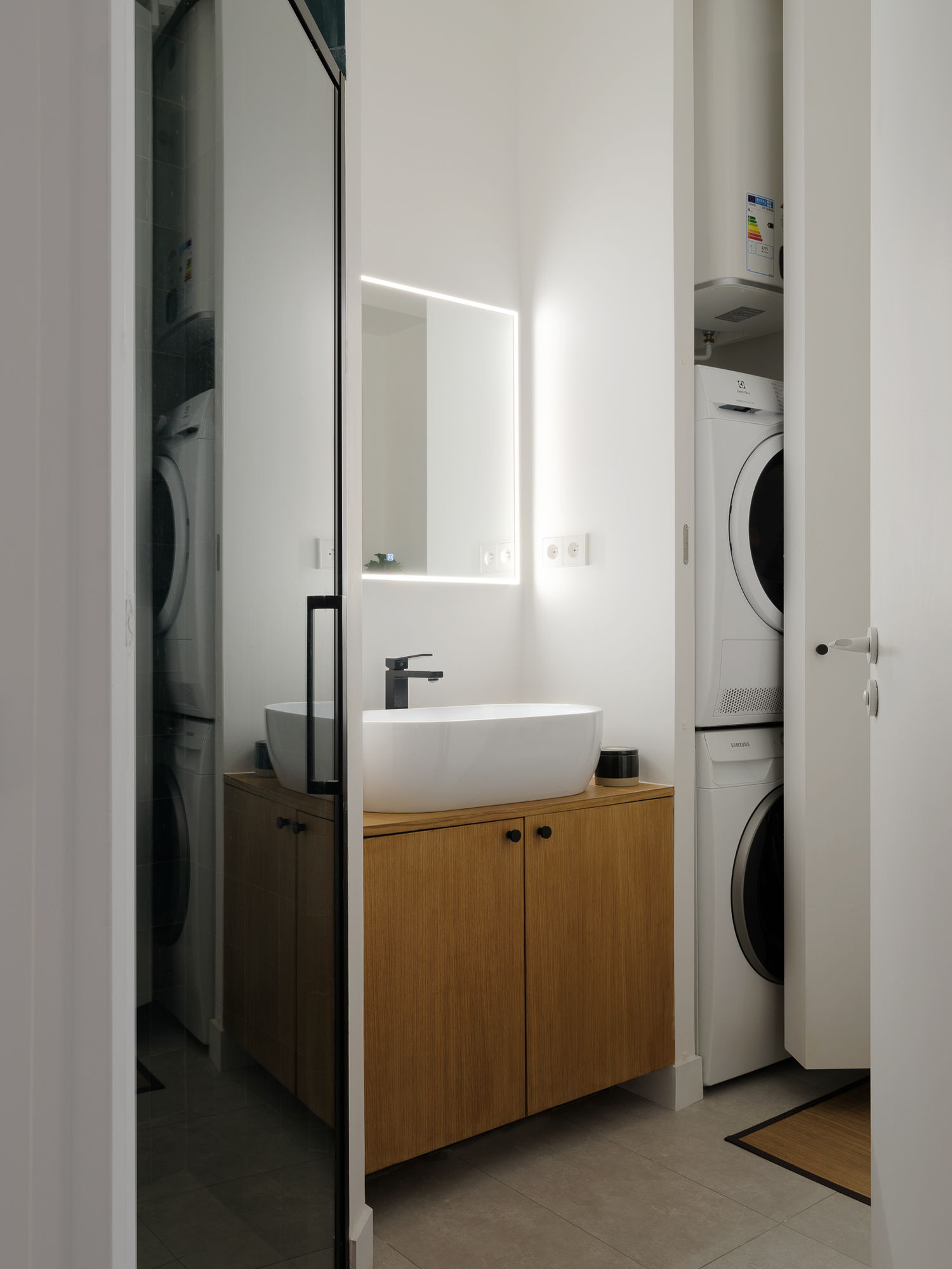 La salle d’eau, épurée, n’en est pas moins fonctionnelle avec son grand placard qui dissimule la buanderie et le ballon d’eau chaude.