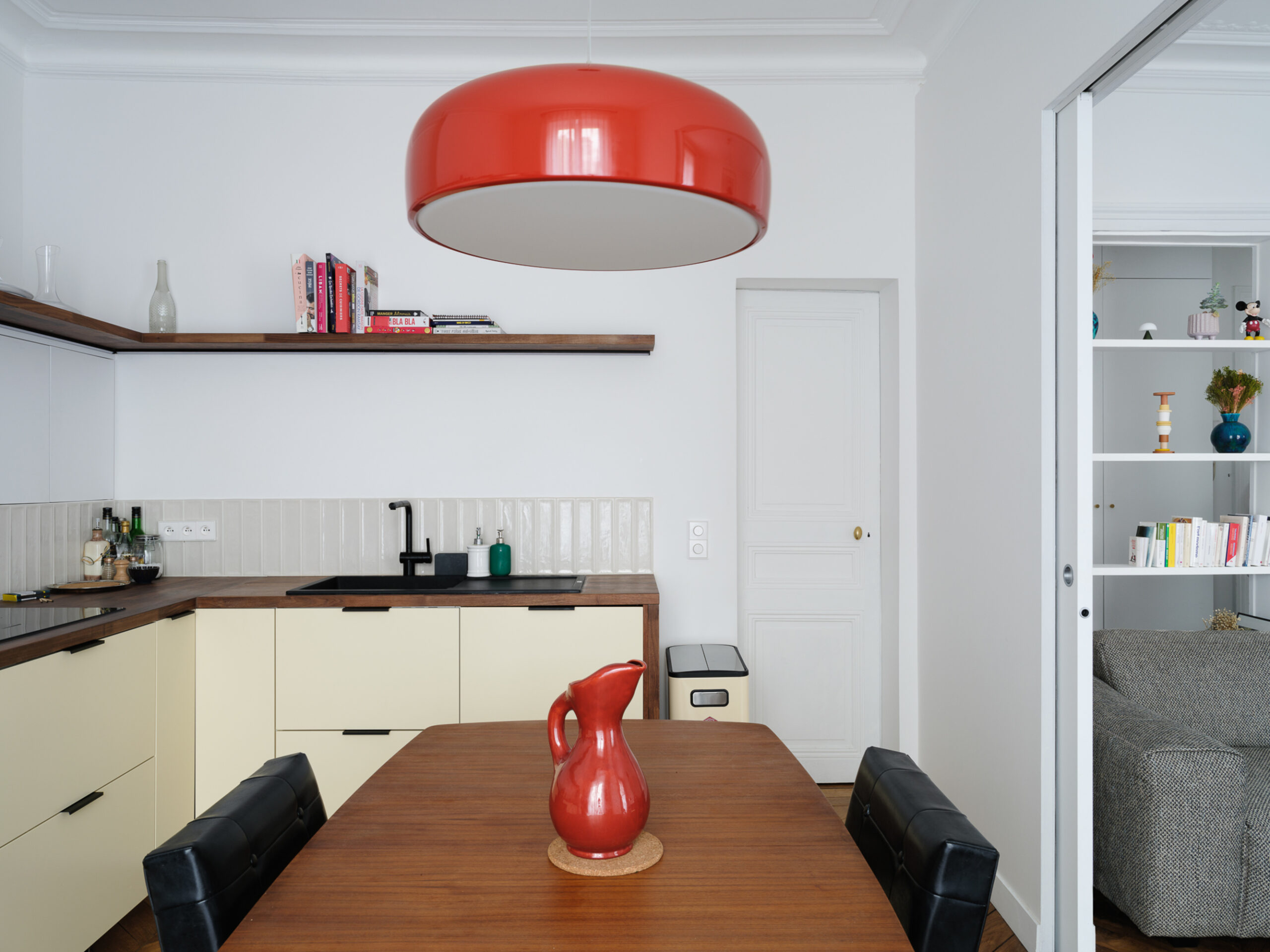 La suspension Smithfield de Flos rouge confère du caractère à la cuisine en créant un effet de contraste avec le bois et les tons crème.