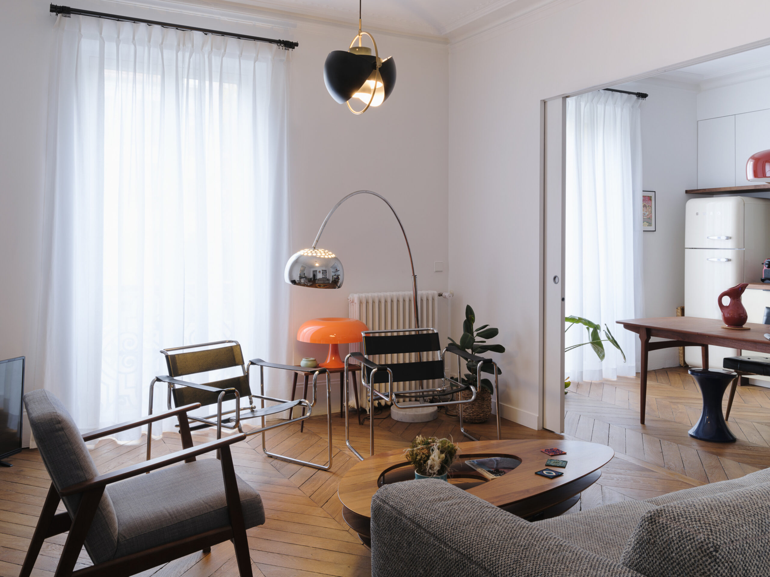 La décoration célèbre les années 1970 au travers de pièces de mobilier soigneusement choisies, à l’image de cette lampe champignon orange.