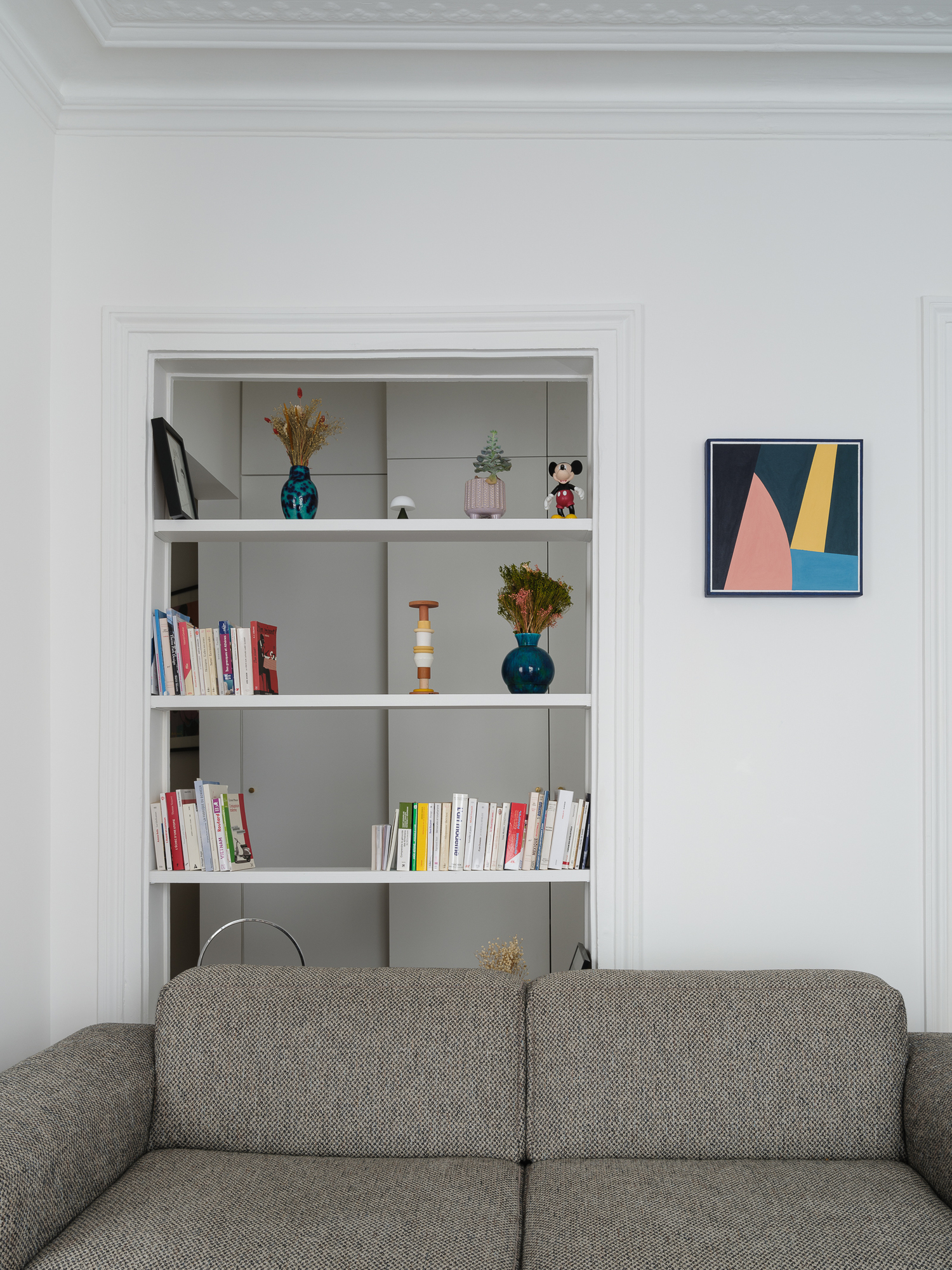 Derrière le canapé, une étagère ajourée permet d’amener habilement la lumière jusque dans la partie dressing, tout en créant un effet visuel original et percutant.