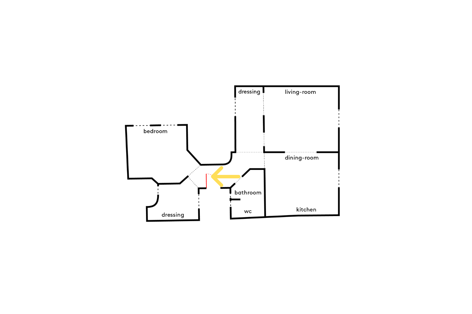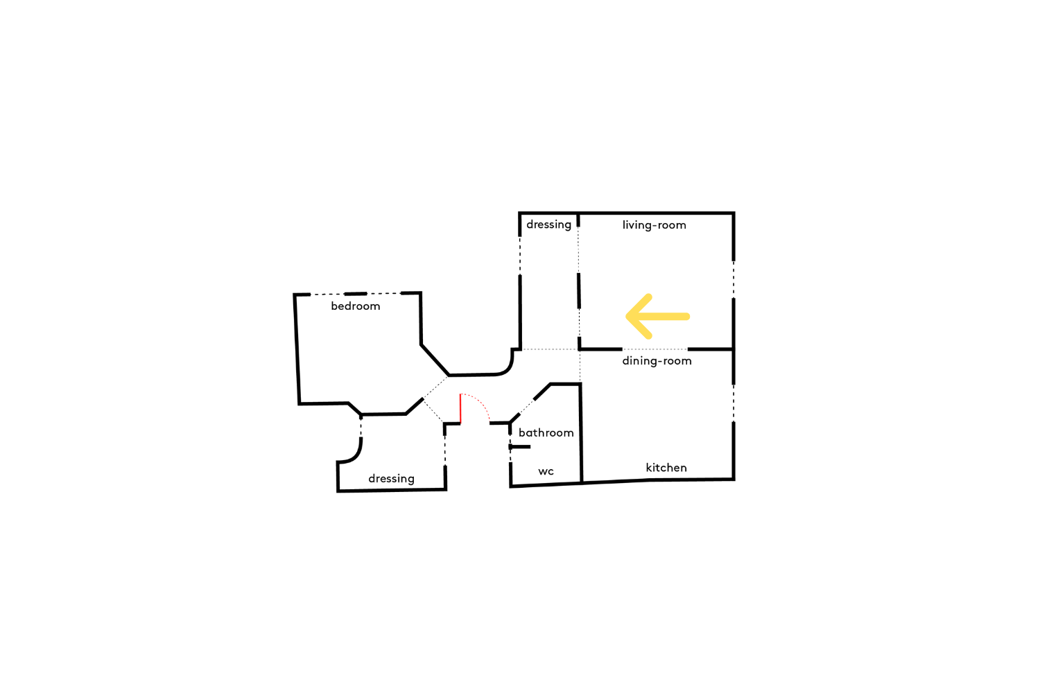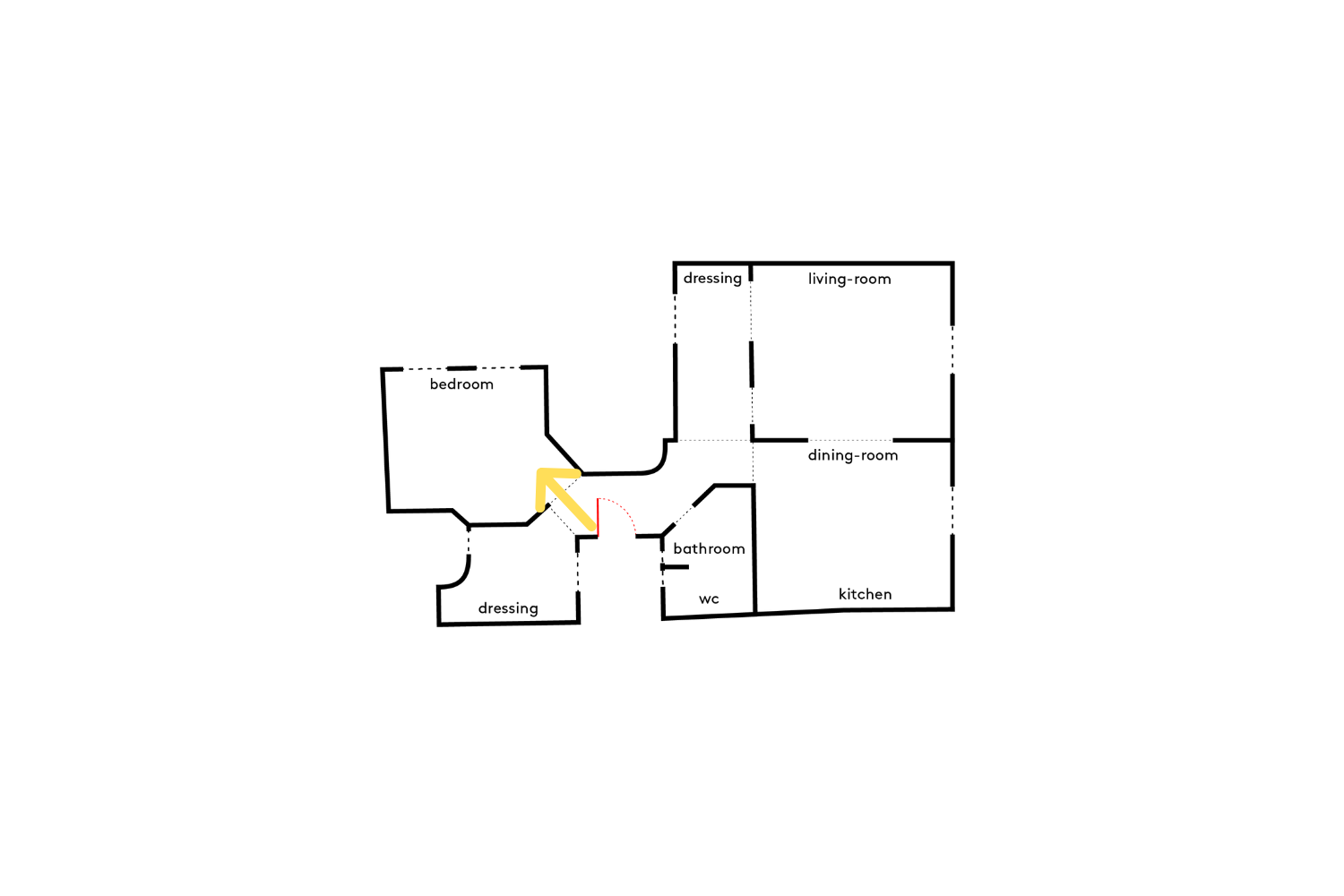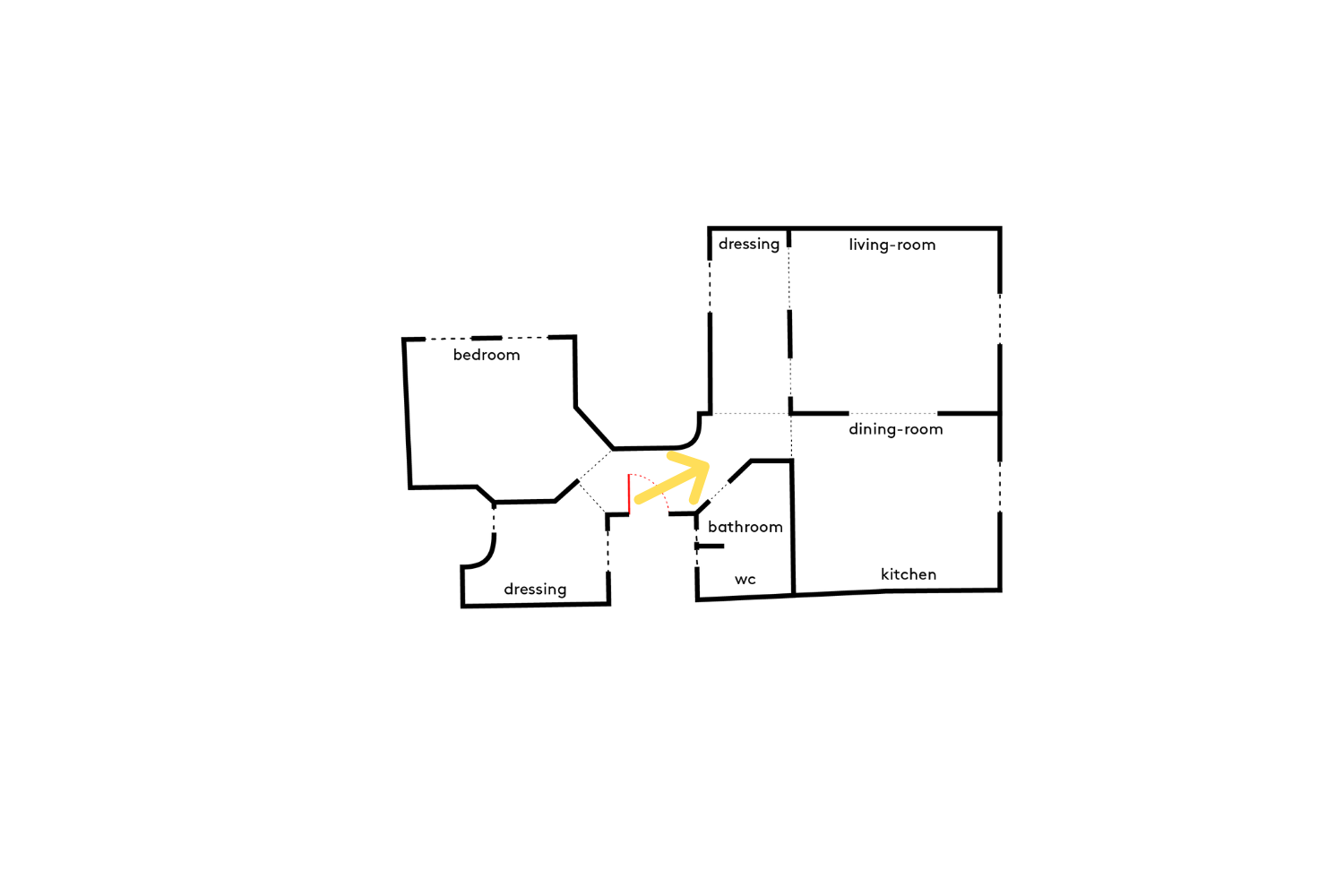 On y retrouve la forme triangulaire. De manière générale, toutes les portes des pièces de l’appartement s’ouvrent sur des triangles afin d’optimiser l’espace.
