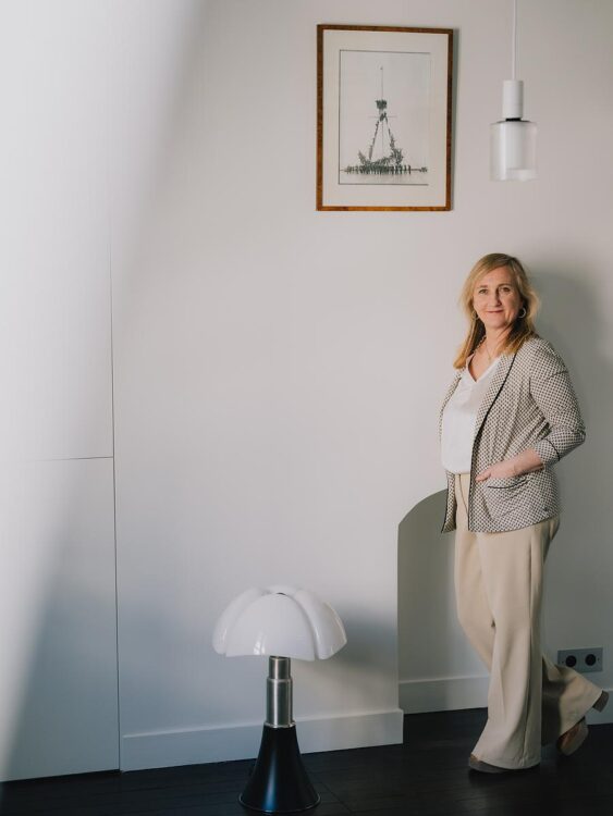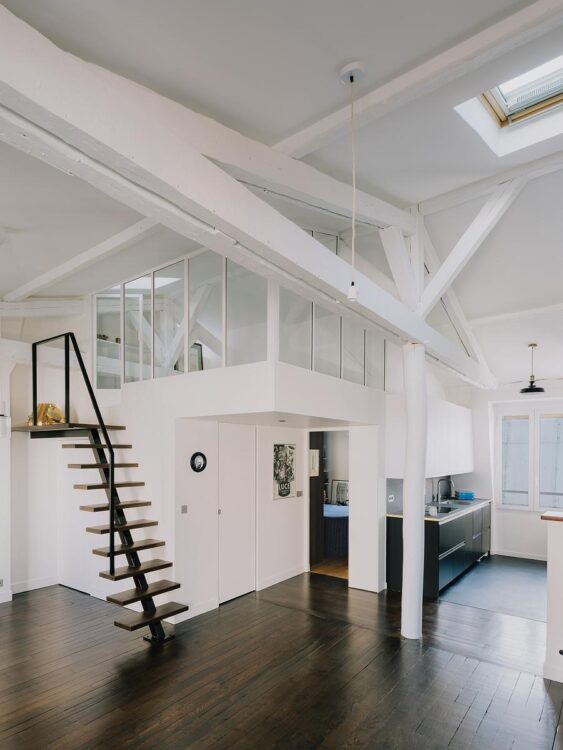 L’objectif de Guilaine d’Harcourt : ouvrir au maximum tout en intégrant une mezzanine confortable, pensée comme une « boîte » perchée dans les combles, et structurant l’ensemble sans l’alourdir.