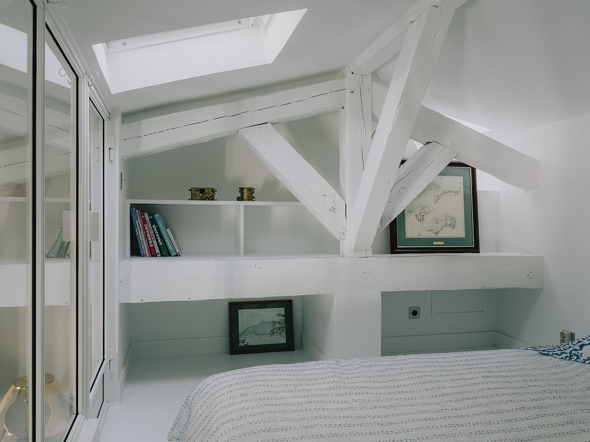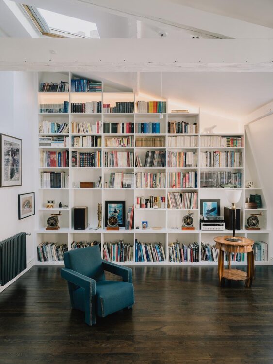 Autre pièce maîtresse du projet : la bibliothèque sur mesure. Haute de plus de 4 mètres, elle est éclairée par la lumière de la fenêtre de toit et un jeu de luminaires intégrés. Elle abrite la collection de livres et d’objets d’art du propriétaire, ancien sous-marinier.