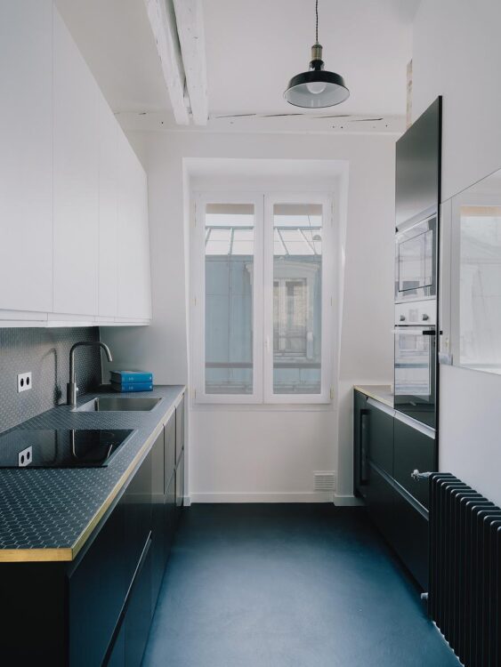 Ce projet mené par l’architecte Guilaine d’Harcourt est parti d’une page blanche. Sous les toits parisiens, cet appartement de 60 mètres carrés a ainsi été entièrement décloisonné pour repenser les volumes et les circulations.
