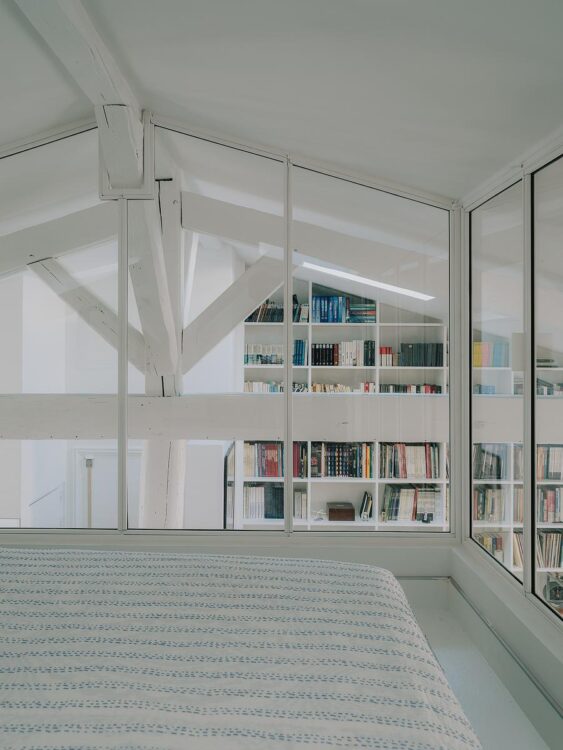 Accessible par un escalier en métal blanc, la mezzanine évoque une cabane suspendue. Derrière son vitrage acoustique, elle se protège des bruits de la pièce de vie. Avec vue directe sur la bibliothèque murale, elle accueille un lit et de nombreux rangements. Un cocon intime et enveloppant, où l’on se sent comme en apesanteur.