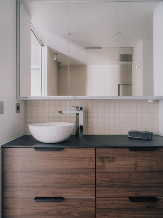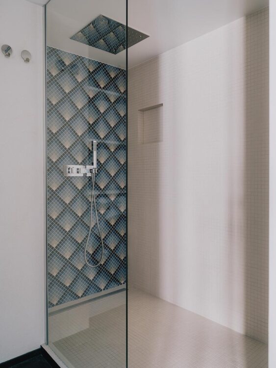 La vaste douche à l’italienne, qui occupe tout un pan de la pièce, est habillée d’une mosaïque Winckelmans. Son calepinage évoque subtilement les fonds sous-marins, clin d’œil poétique au passé nautique du propriétaire.