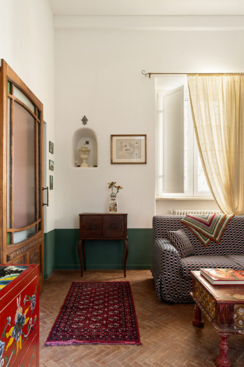 Au plafond, le lustre de la bisnonna ponctue l’ensemble d’une présence à la fois précieuse et délicate.