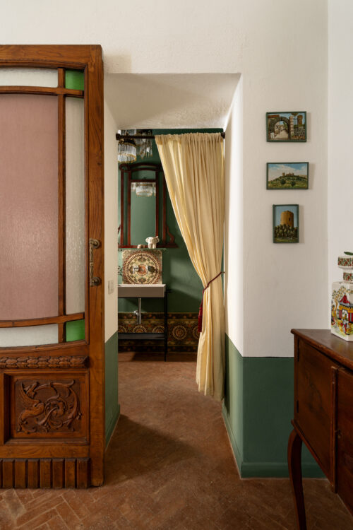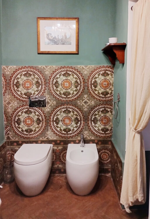 La pièce se distingue par un décor de faïence réalisé à partir d’un ancien sol, dont les motifs circulaires rythment les murs.