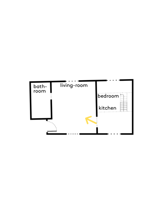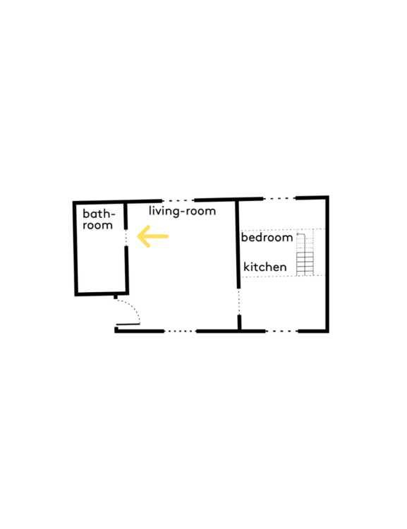 Depuis le séjour, un passage étroit se dessine, adouci par un rideau clair, laissant deviner la salle d’eau comme un espace à part, intime.