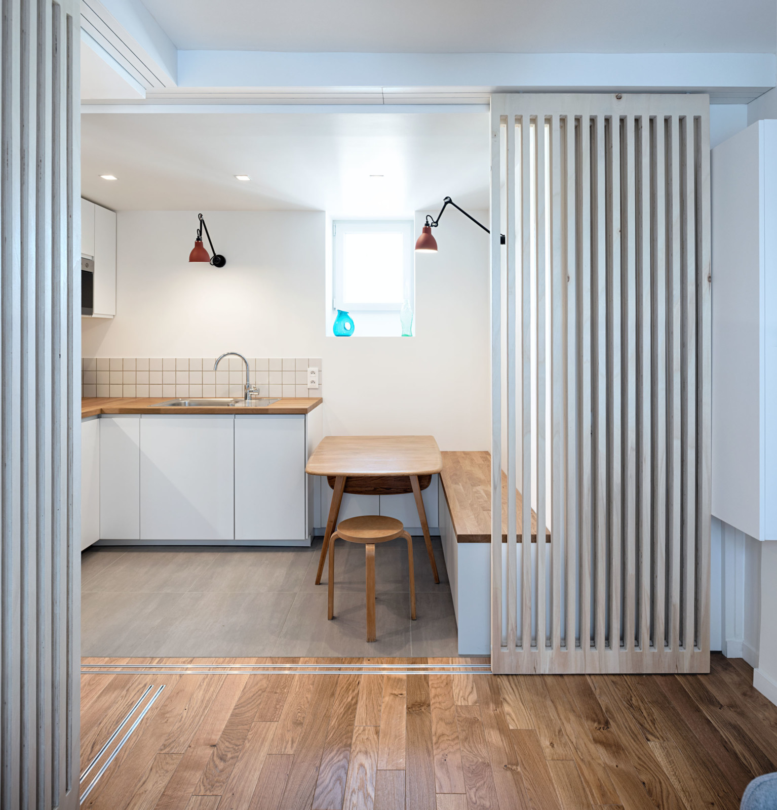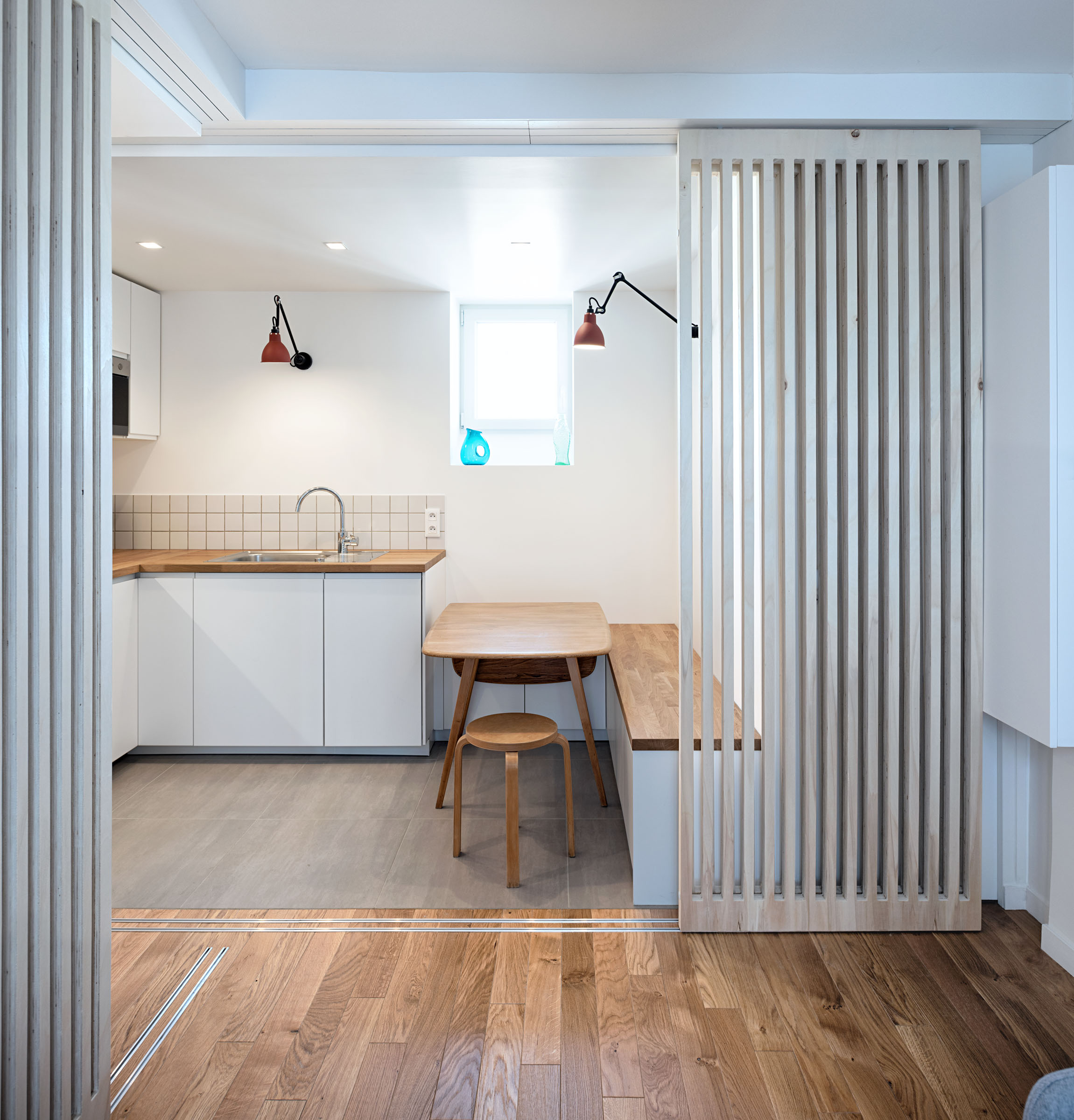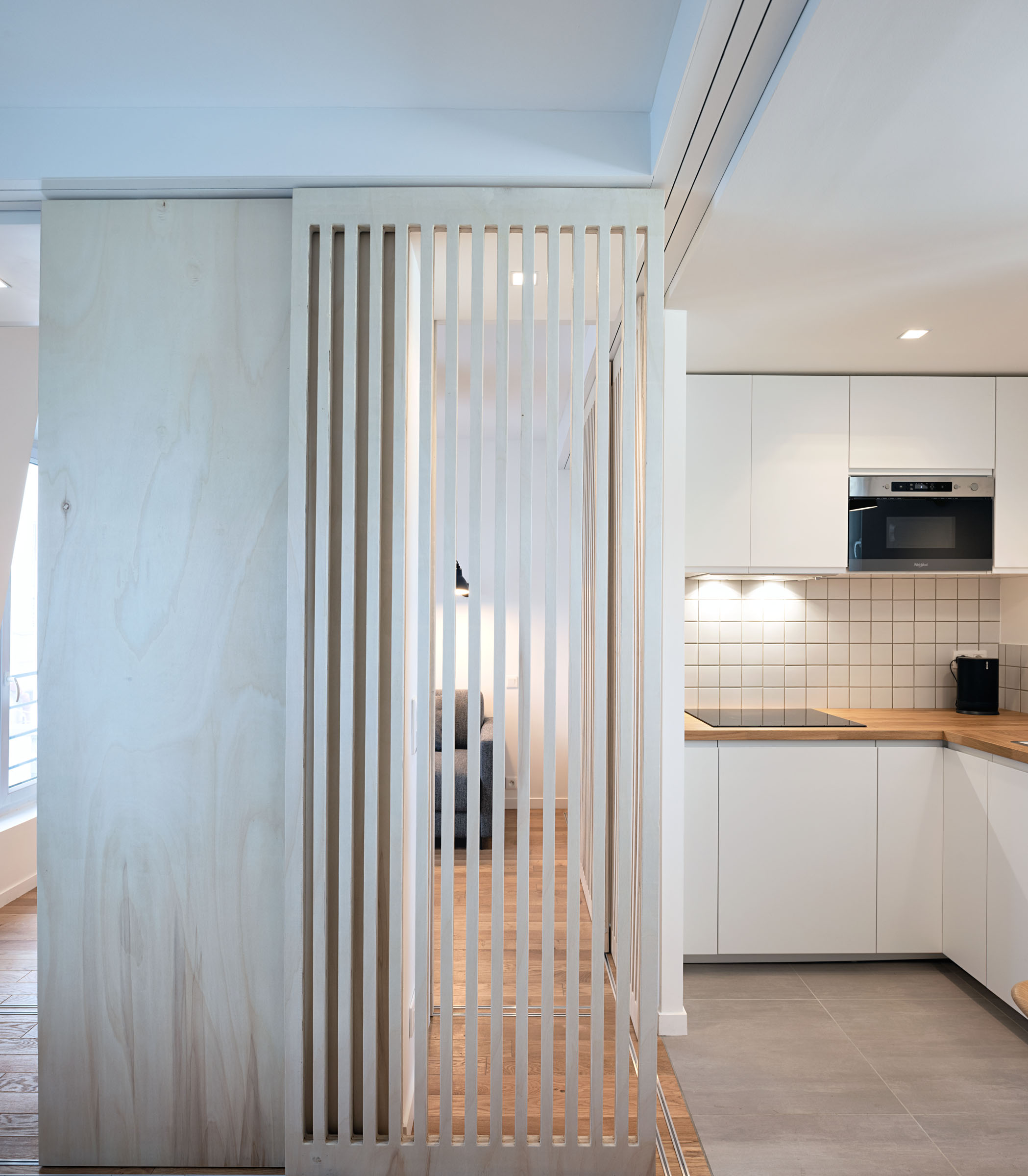 Même principe entre le salon et la cuisine, avec deux claustras sur rail en contreplaqué de peuplier, dans un esprit contemporain et japonisant.