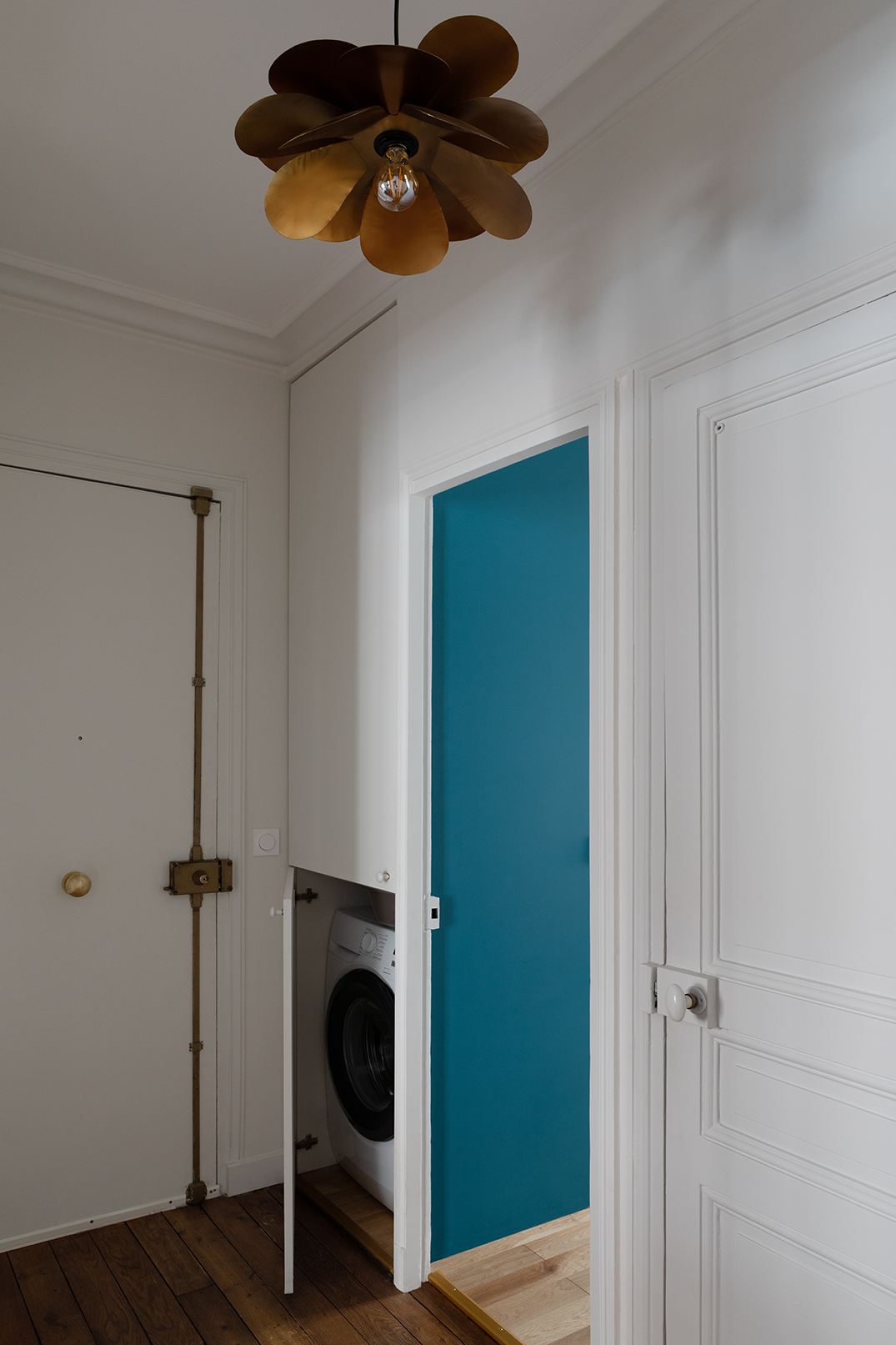 Pas tant que ça ! Elle a été aménagée de façon optimale pour dissimuler le lave linge et des rangements.