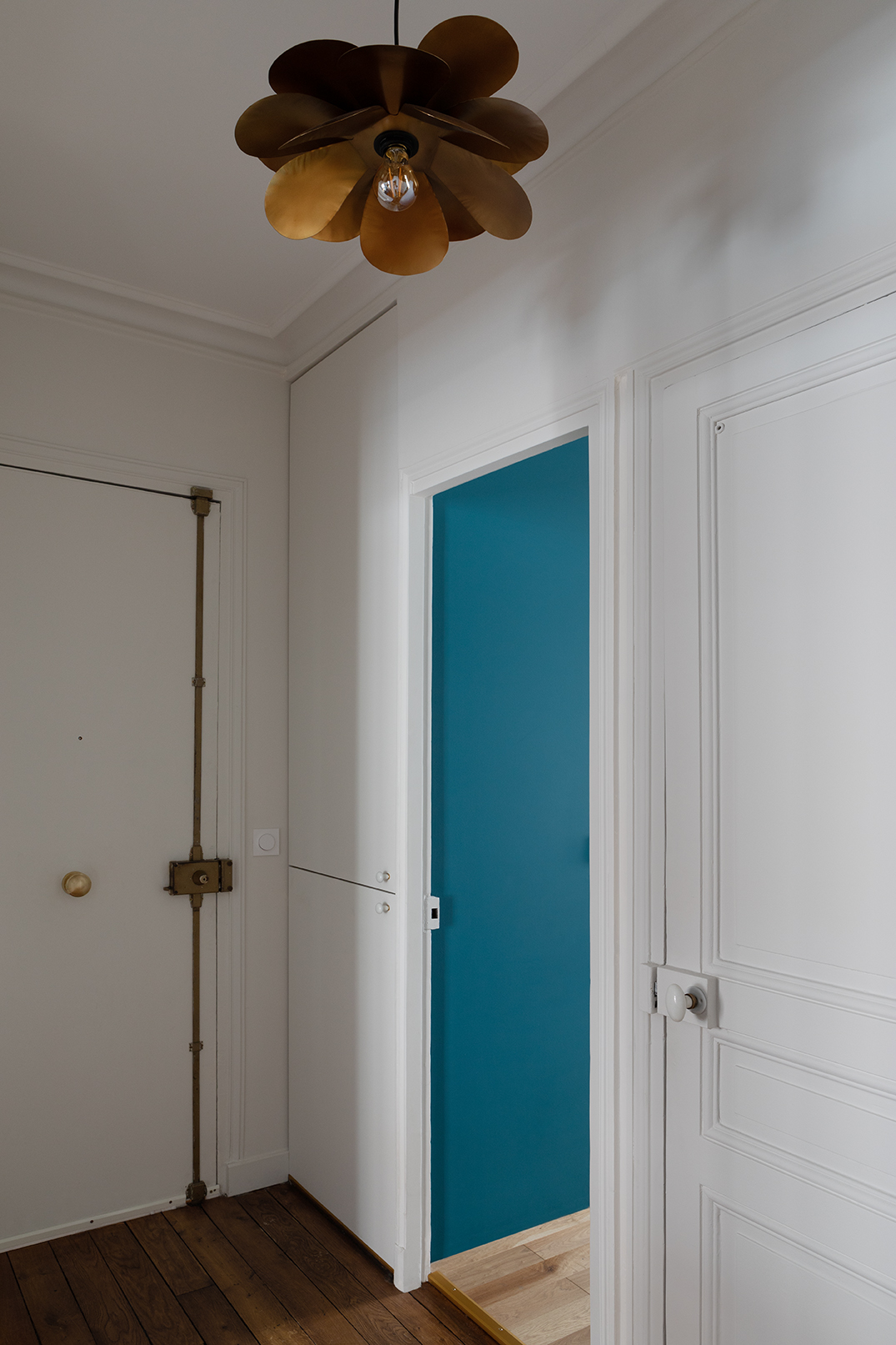 Le coin bureau a été installé près de la fenêtre pour bénéficier de la lumière naturelle. Il est traité tout en couleurs avec des placards bleu canard et un papier peint chamarré qui annonce le thème décoratif de l’appartement tout entier.