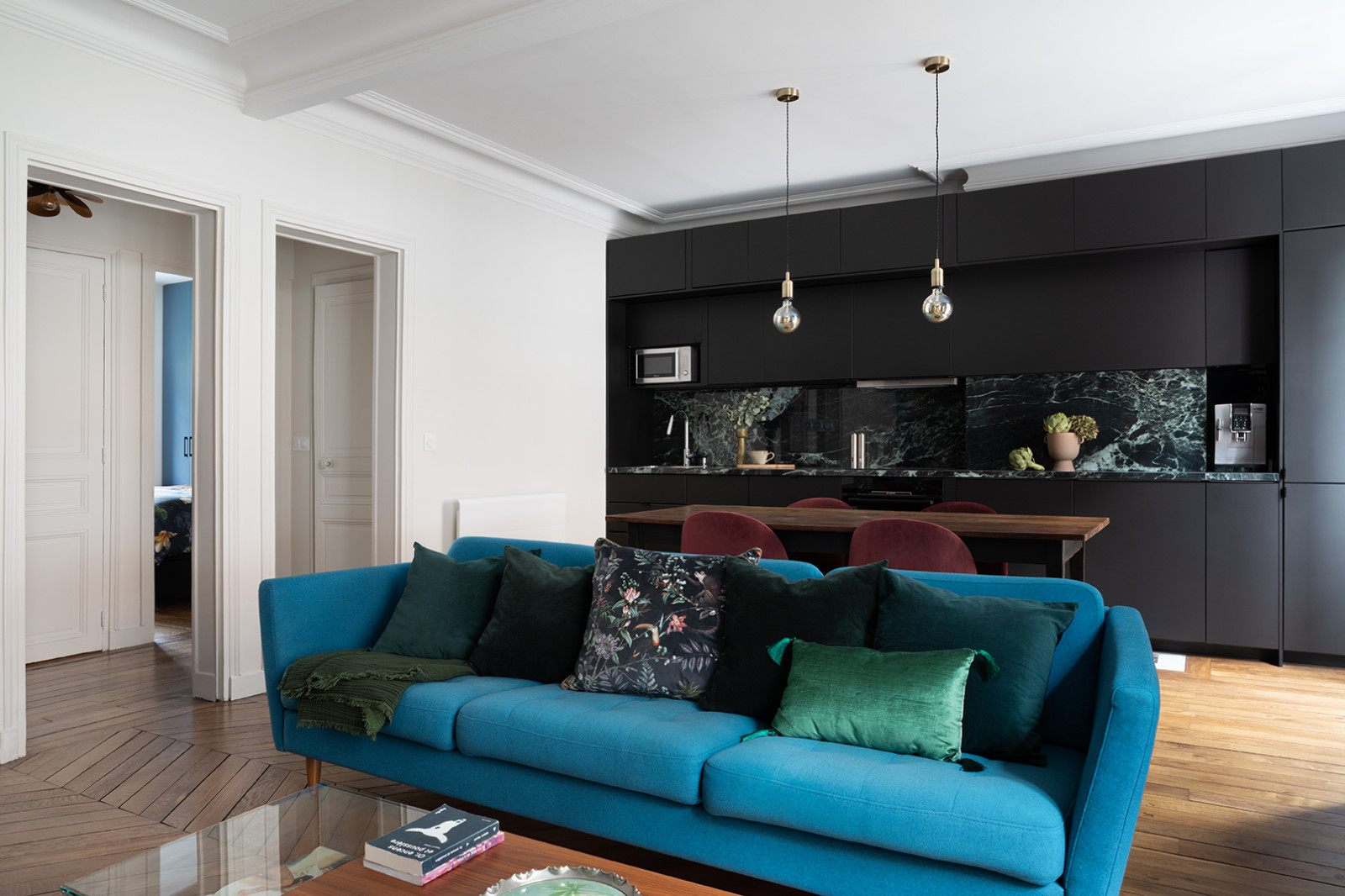 Le canapé a été choisi bleu. La couleur fait partie des fils directeurs du décor de l’appartement.