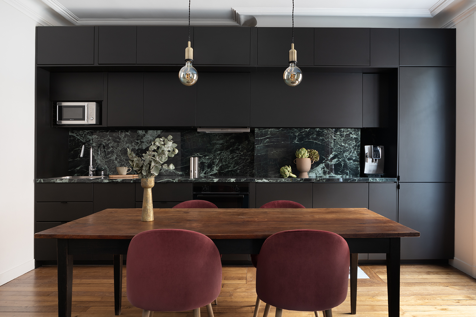 Derrière le canapé, on accède au coin repas et à la cuisine noire qui se déploie, elle aussi, sur toute la largeur du mur. Les deux pans sombres encadrent la lumineuse pièce à vivre et délimitent les espaces.