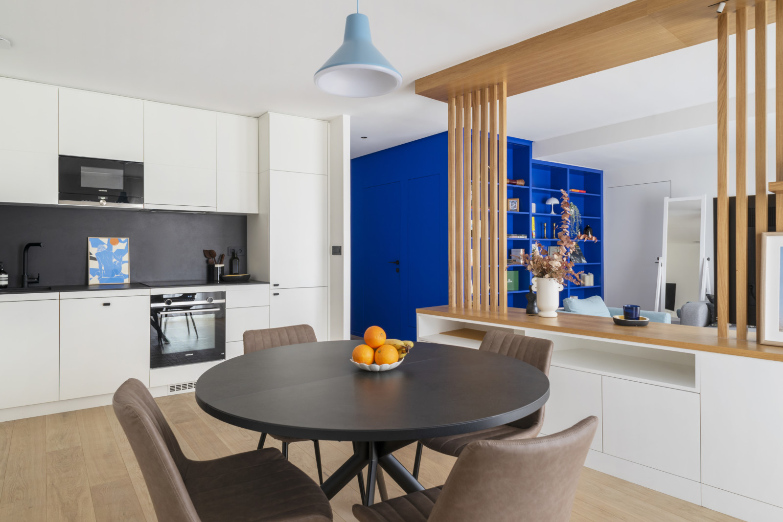 Ce bleu iconique se décline de l’entrée jusqu’à la bibliothèque du salon, pour ajouter une touche déco audacieuse à ce séjour épuré.