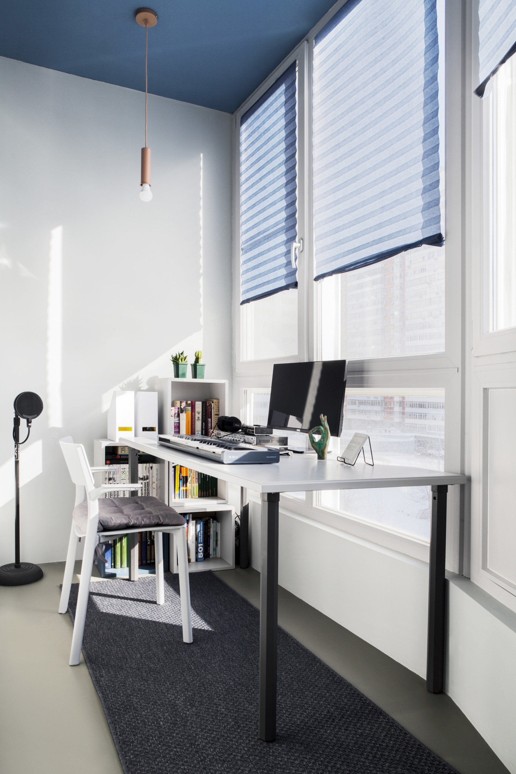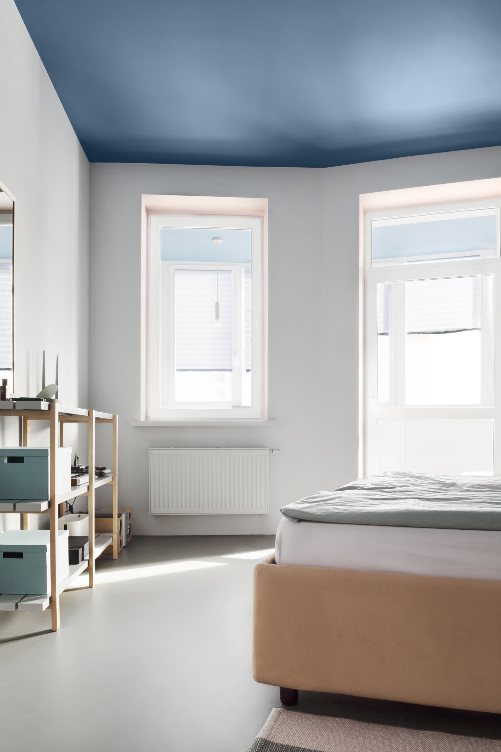 Avec le bureau, c’est la pièce qui bénéficie de la lumière du matin ! Un bleu ciel a été choisi pour le plafond.