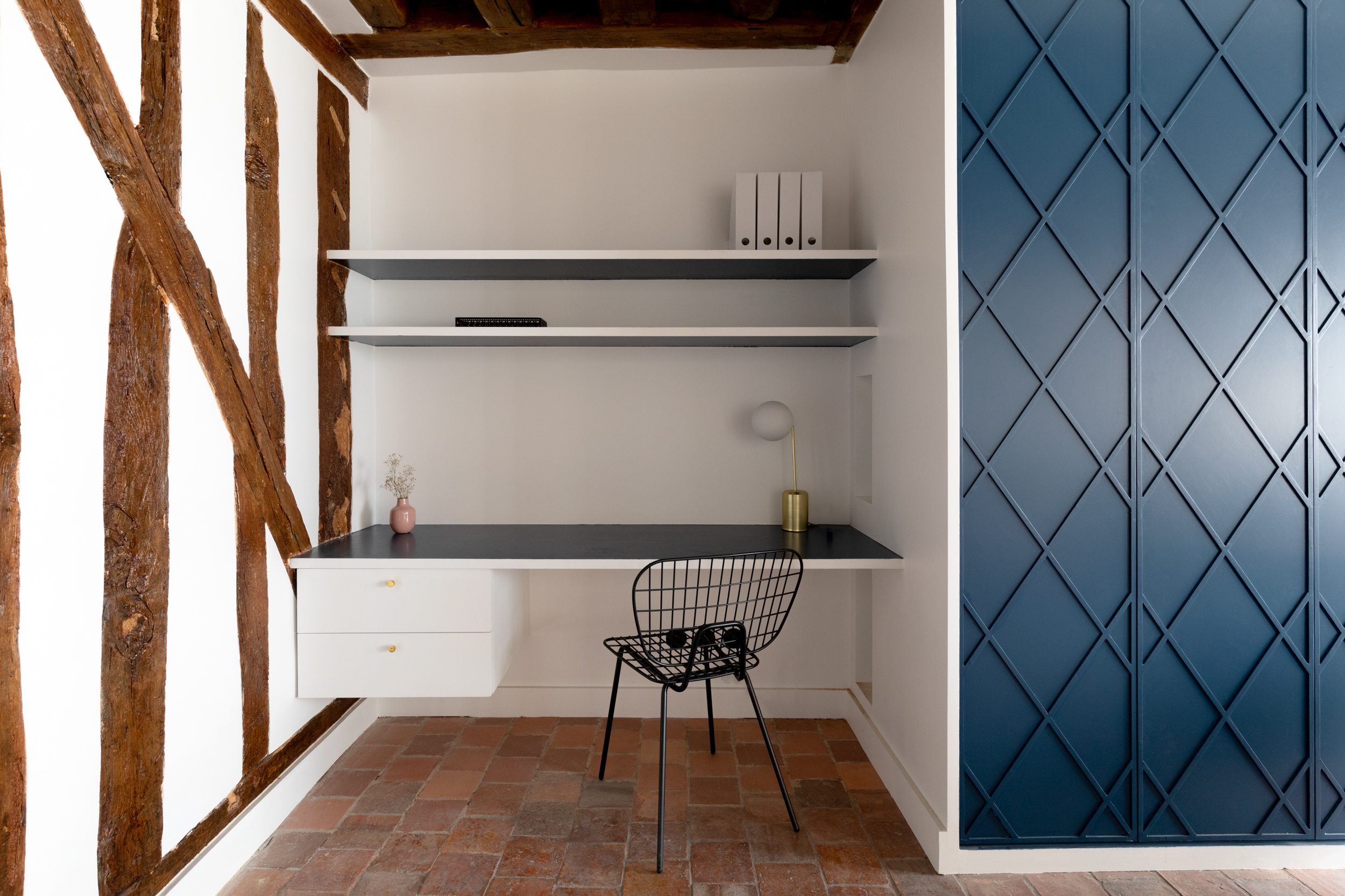 Nous passons le petit sas d’entrée et nous voici dans le séjour. Un véritable espace bureau a été créé dans un coin de la pièce, glissé entre le mur avec son ossature apparente et l’armoire réalisée sur mesure.