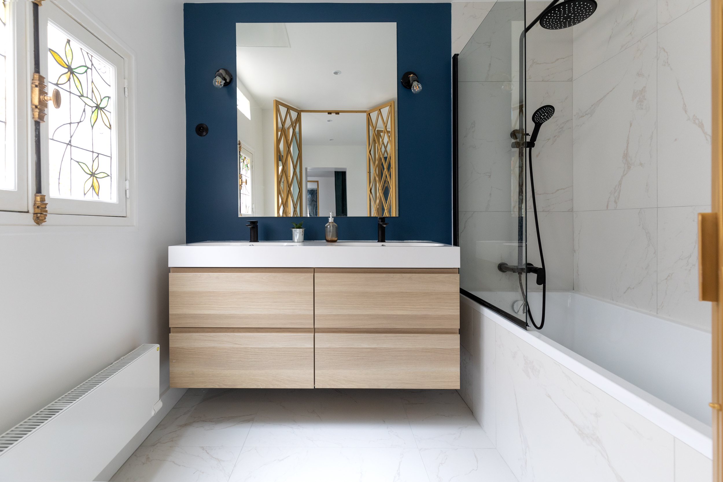Une fois le dressing traversé, nous voici dans la salle de bain traitée toute en modernité. Les témoignages du temps persistent cependant sur les carreaux de la fenêtre !