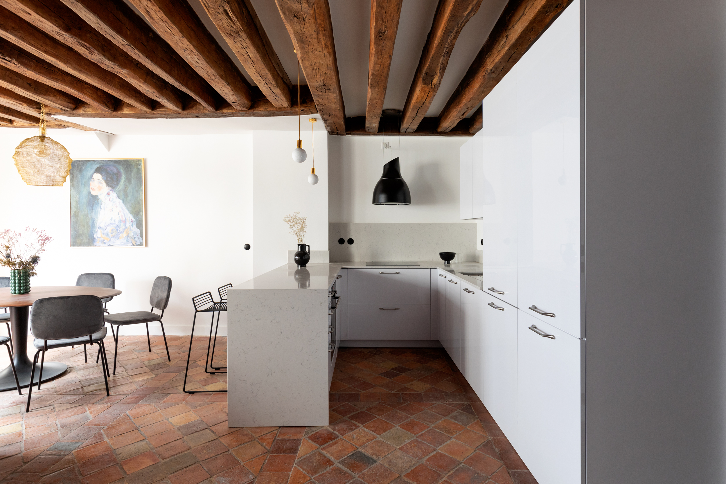 Juste en face se déploie la cuisine, installée dans l’ancienne entrée. Les éléments ont été habillés de portes blanches pour capter le maximum de lumière tout en restant discrets.