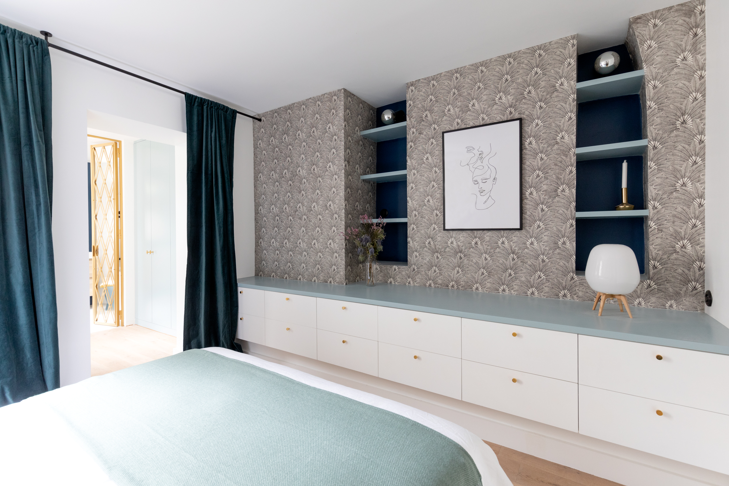 En face, on a créé deux colonnes d’étagères qui cadencent le papier peint à motif. Au sol, une rangée de tiroirs s’étend sur toute la largeur du mur dans un esprit commode XXL.