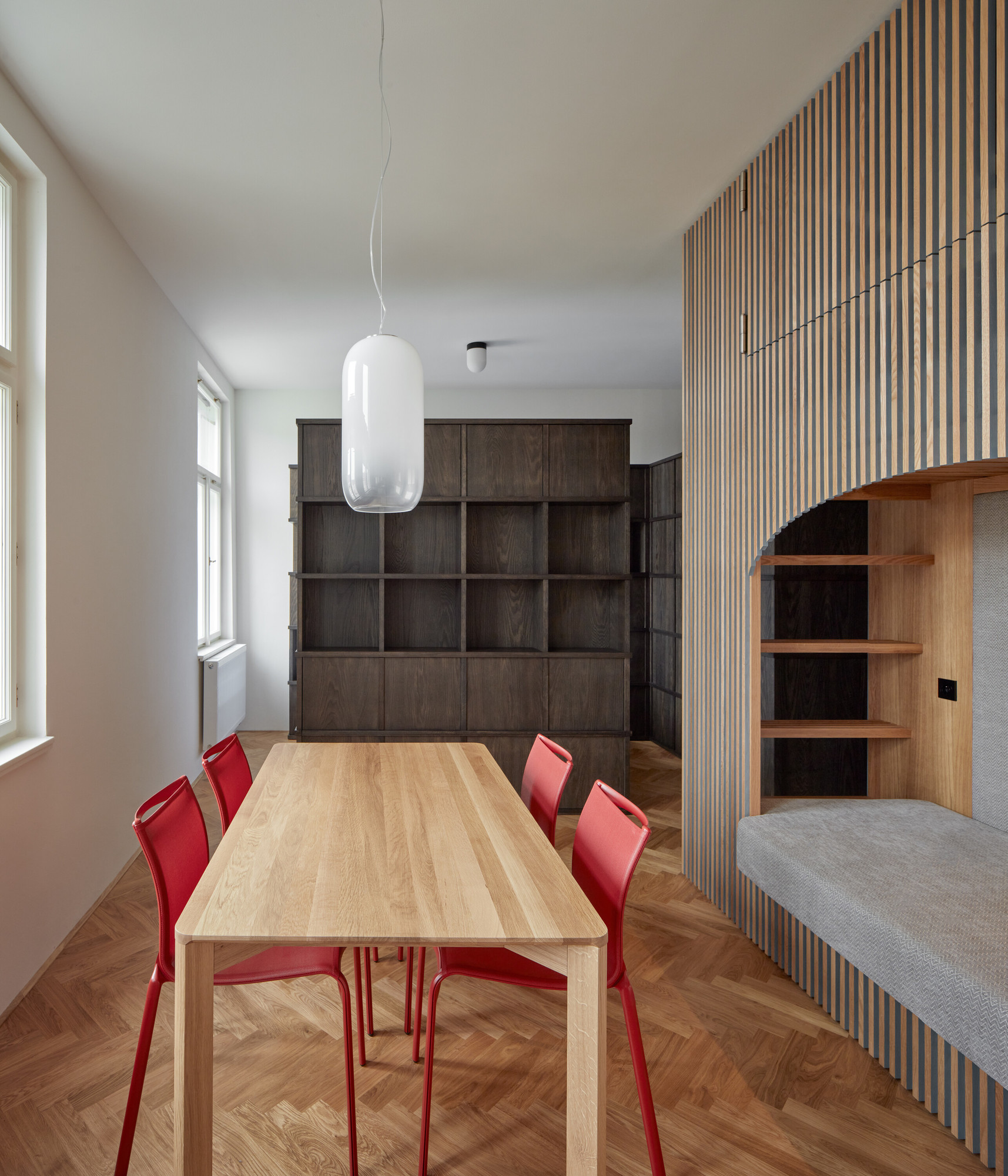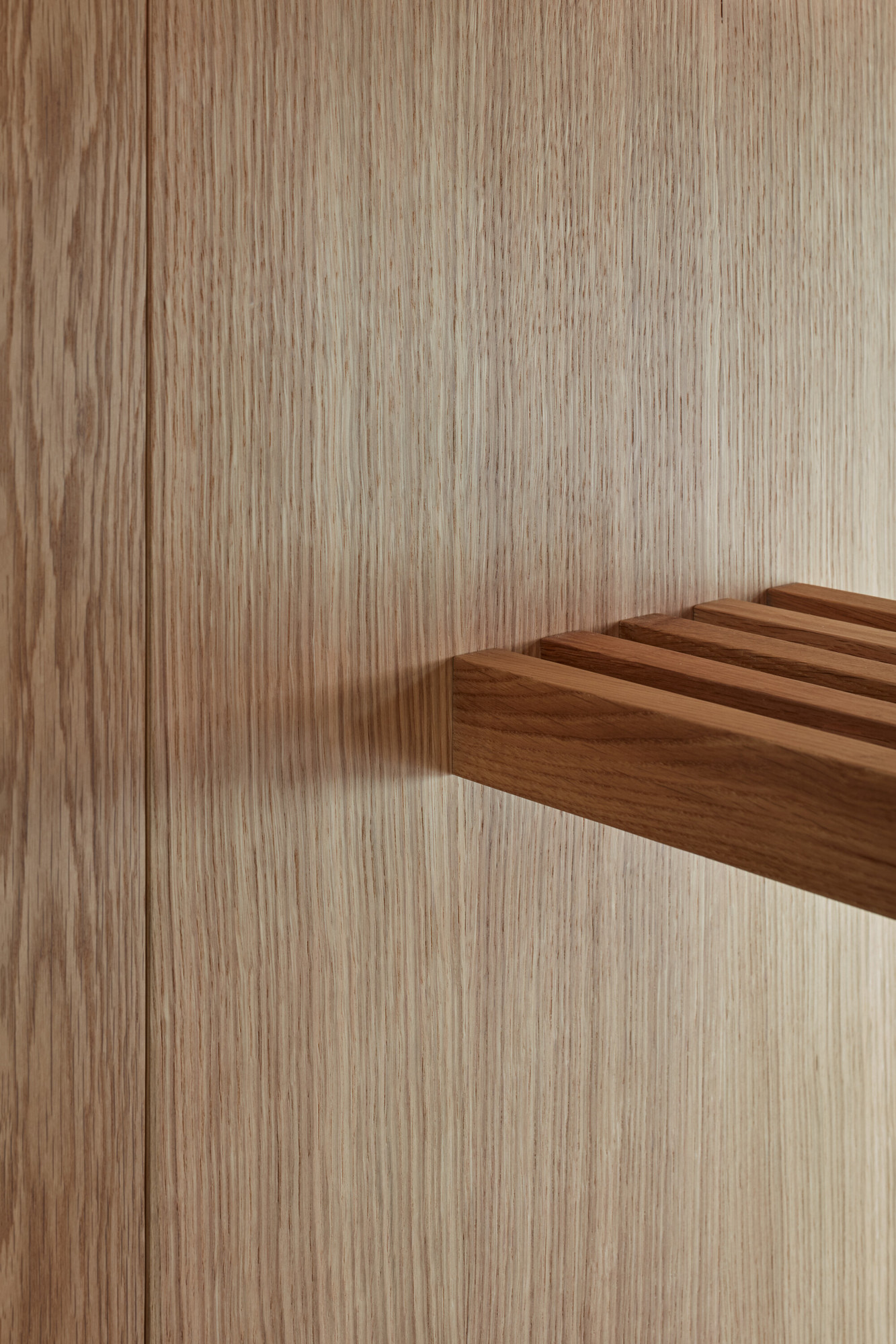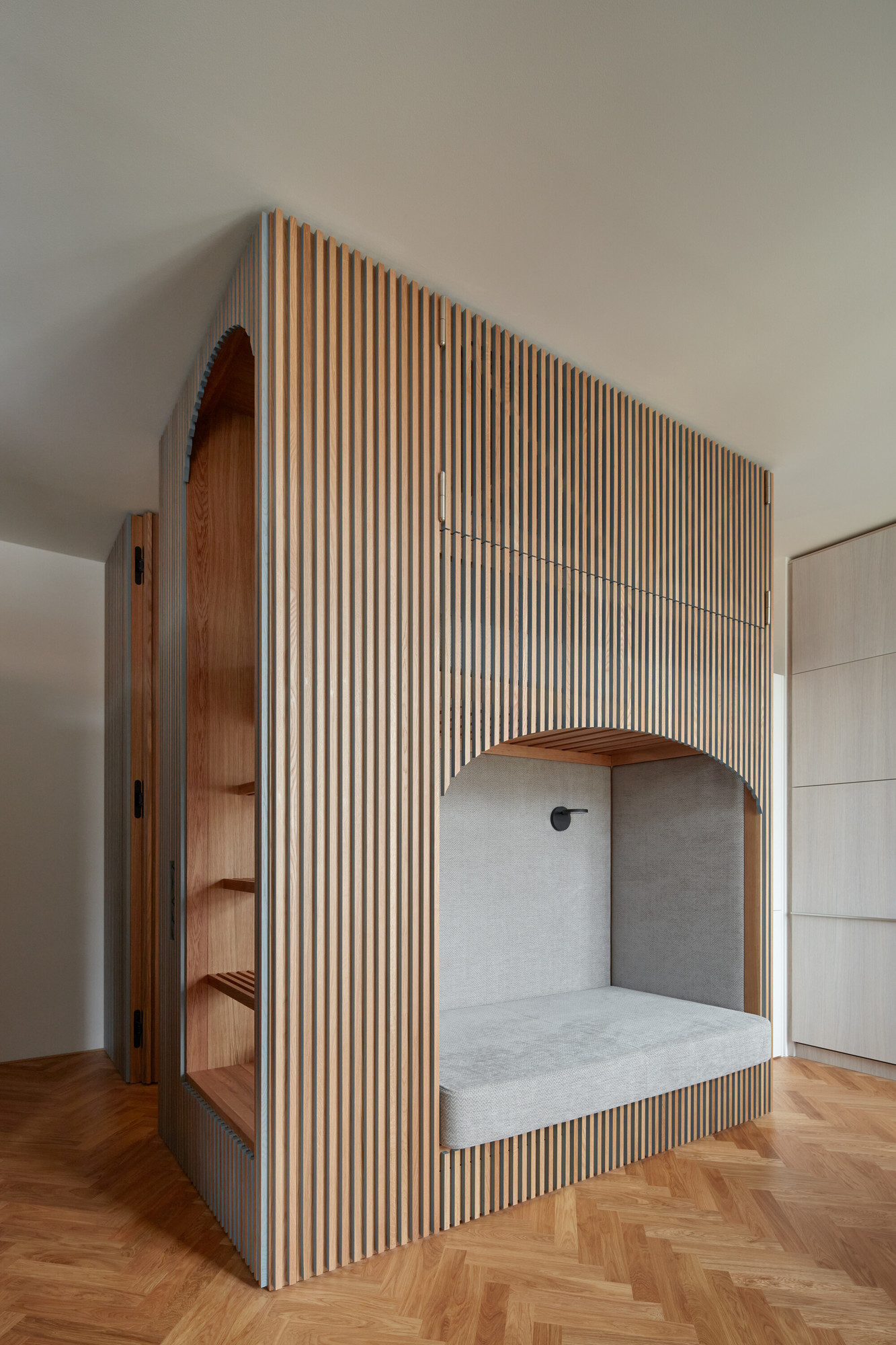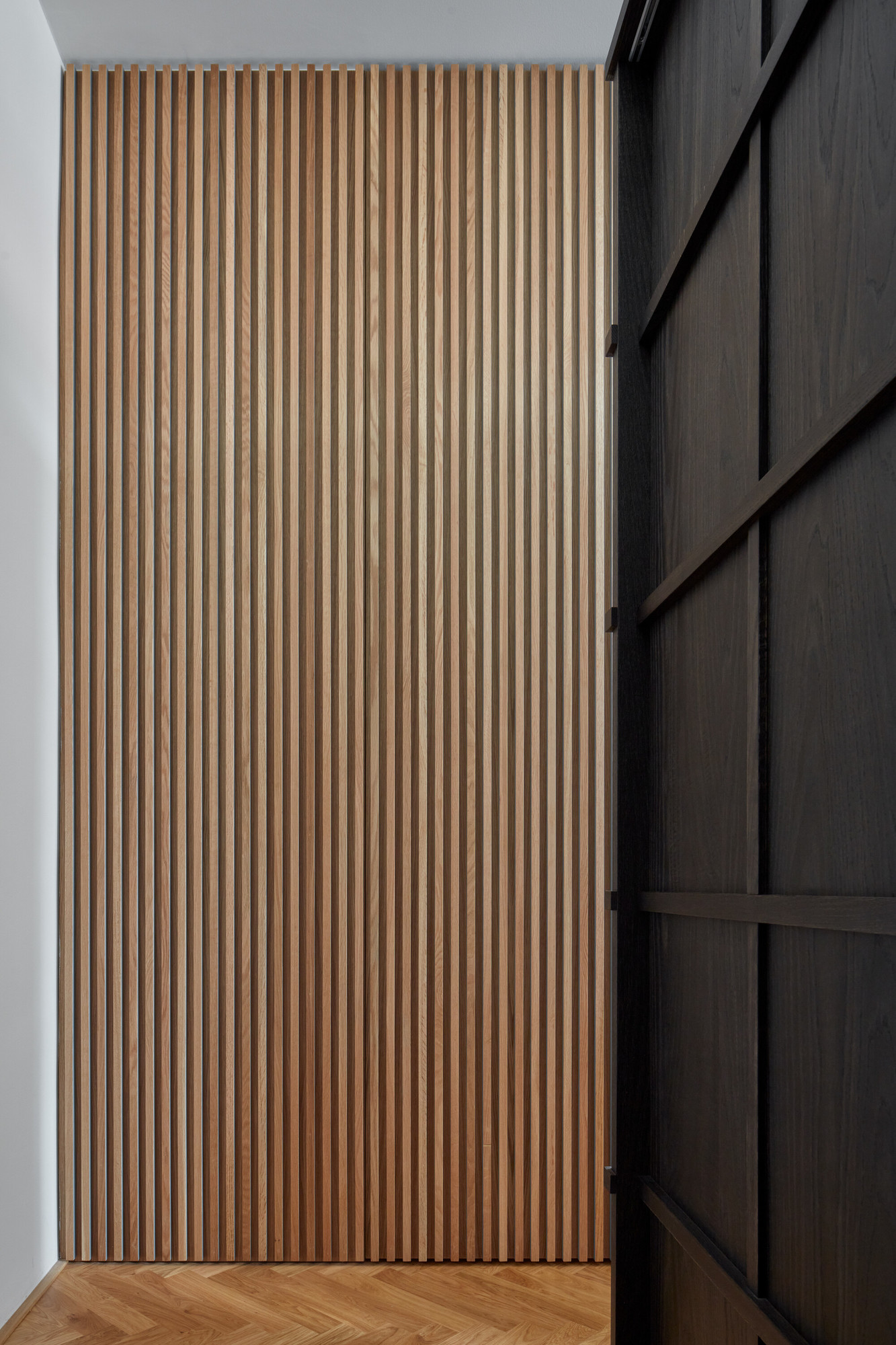 Une porte camouflée dans la claustra en chêne permet d’accéder directement à l’entrée qui commande la salle de bain.