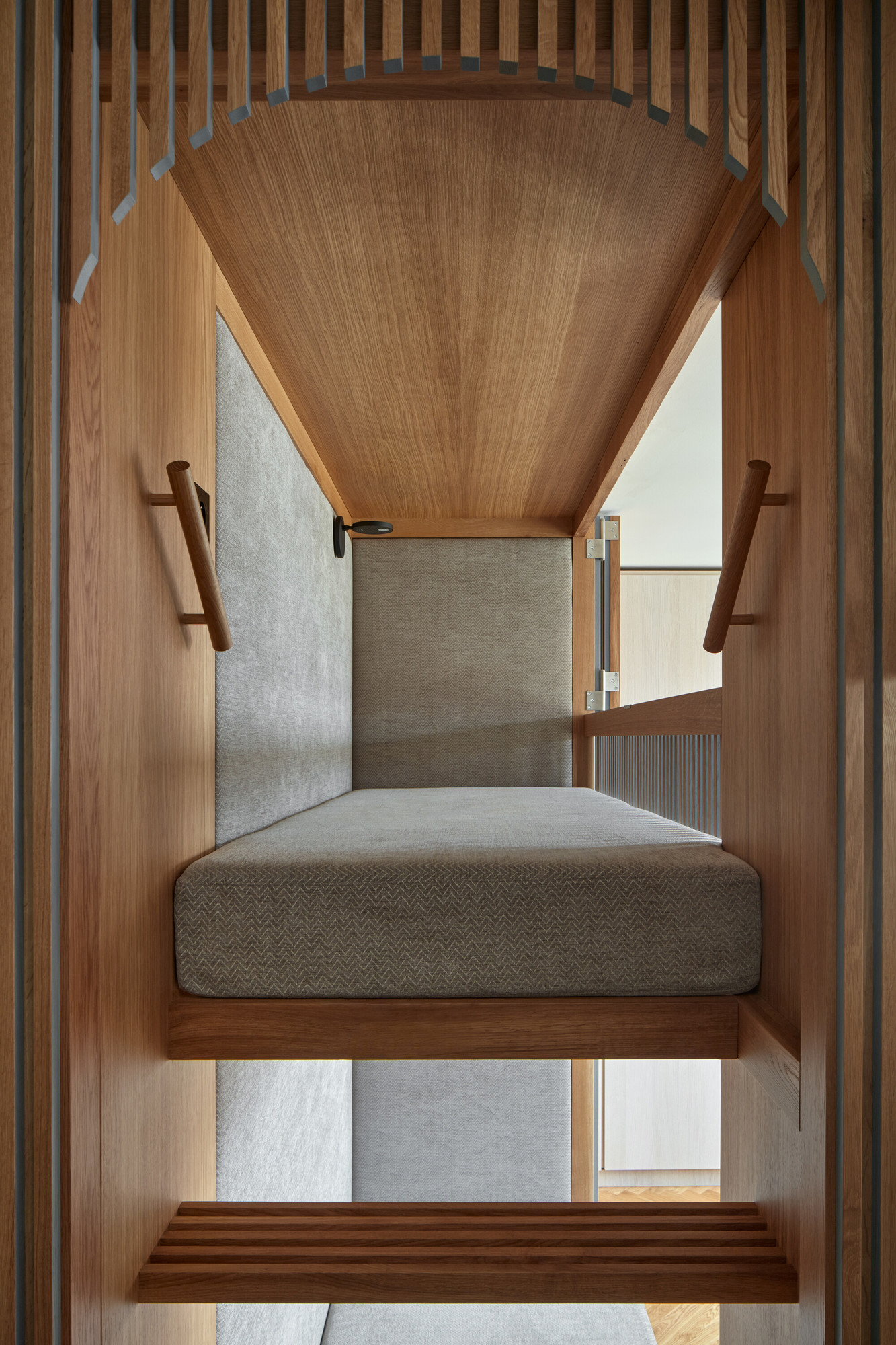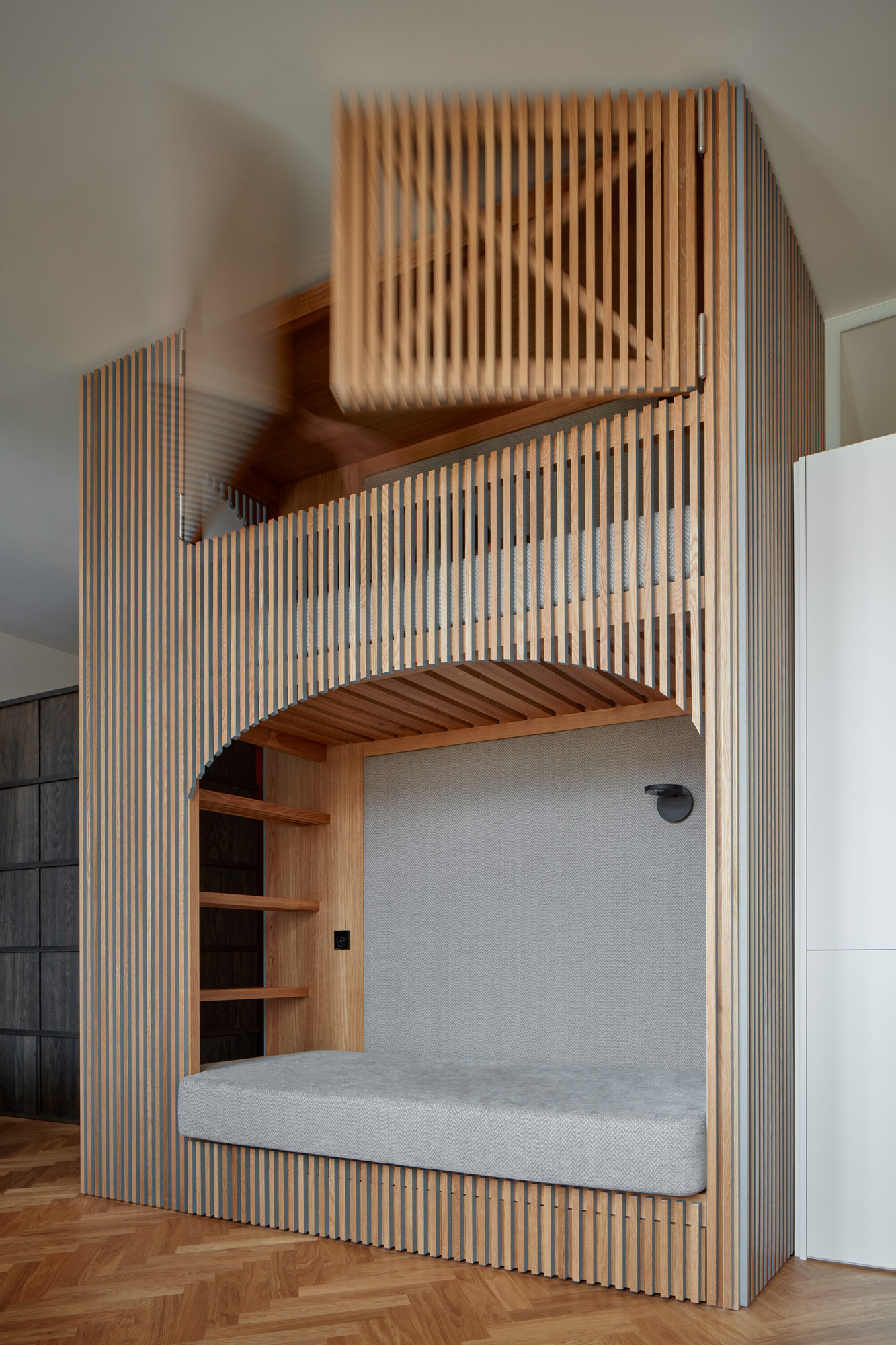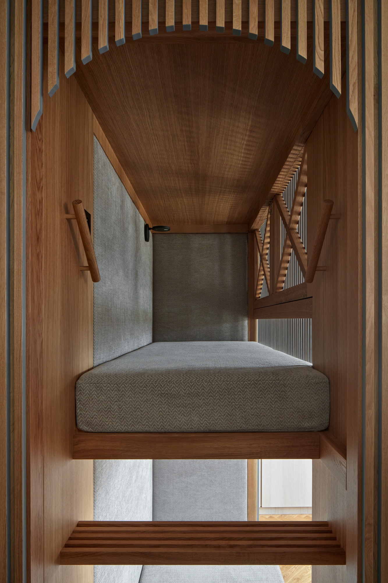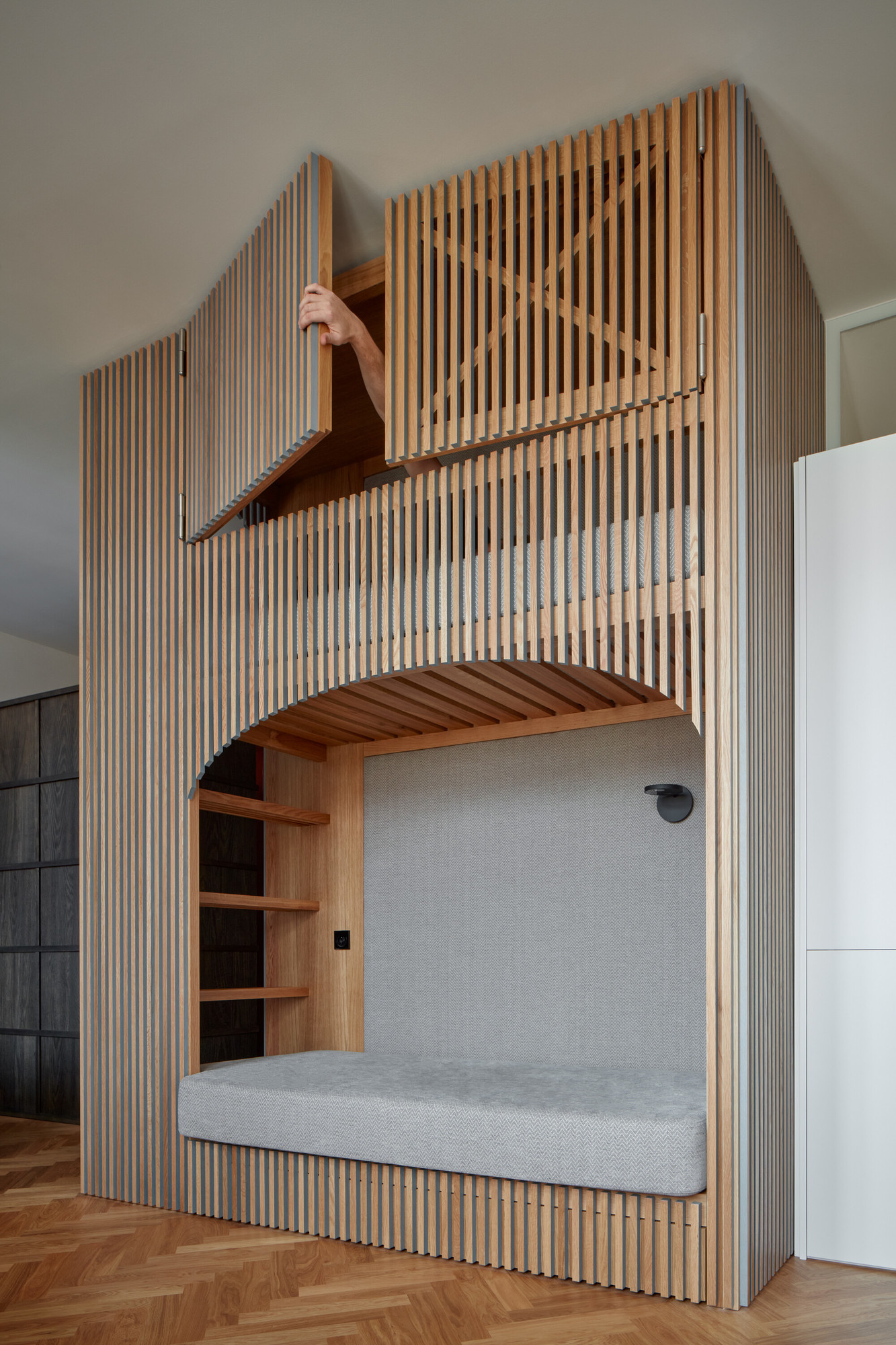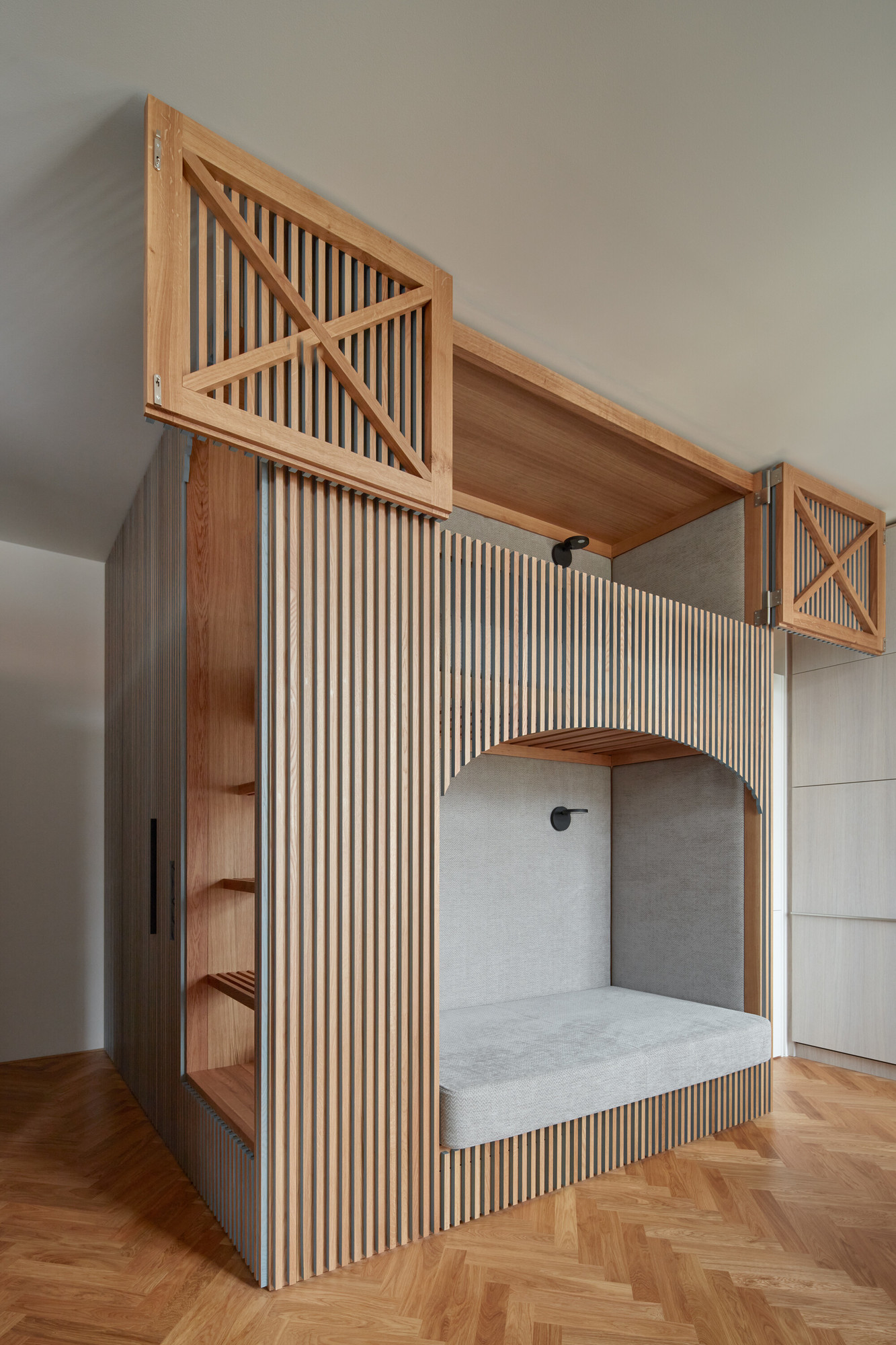 Le lit supérieur, quant à lui, se dissimule derrière deux battants en chêne massif.