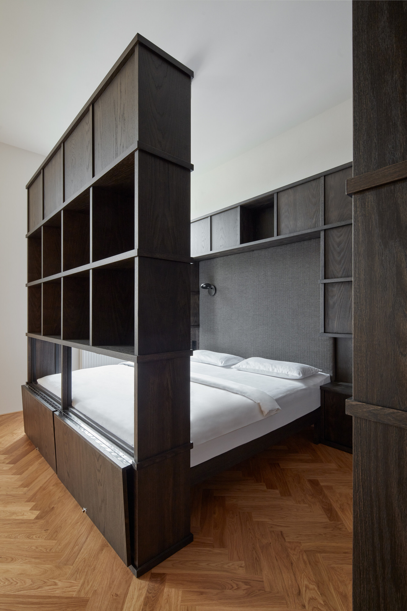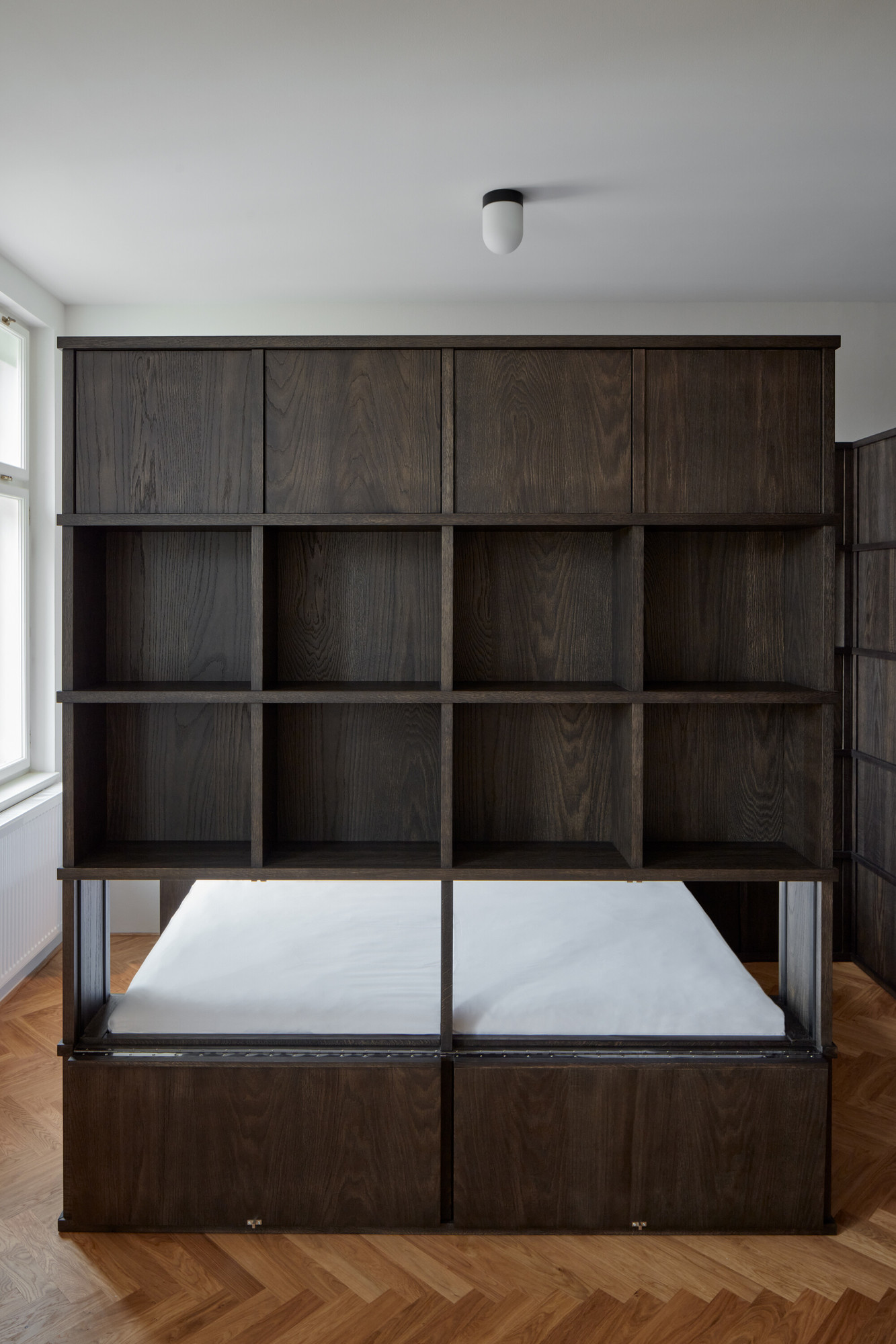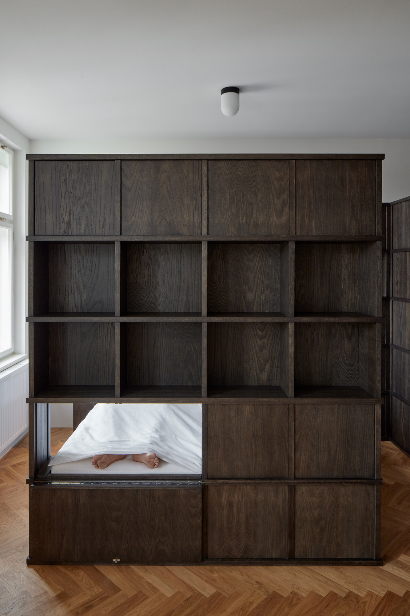 Le lit s’immisce entre deux sections d’étagères en bois qui le cachent.