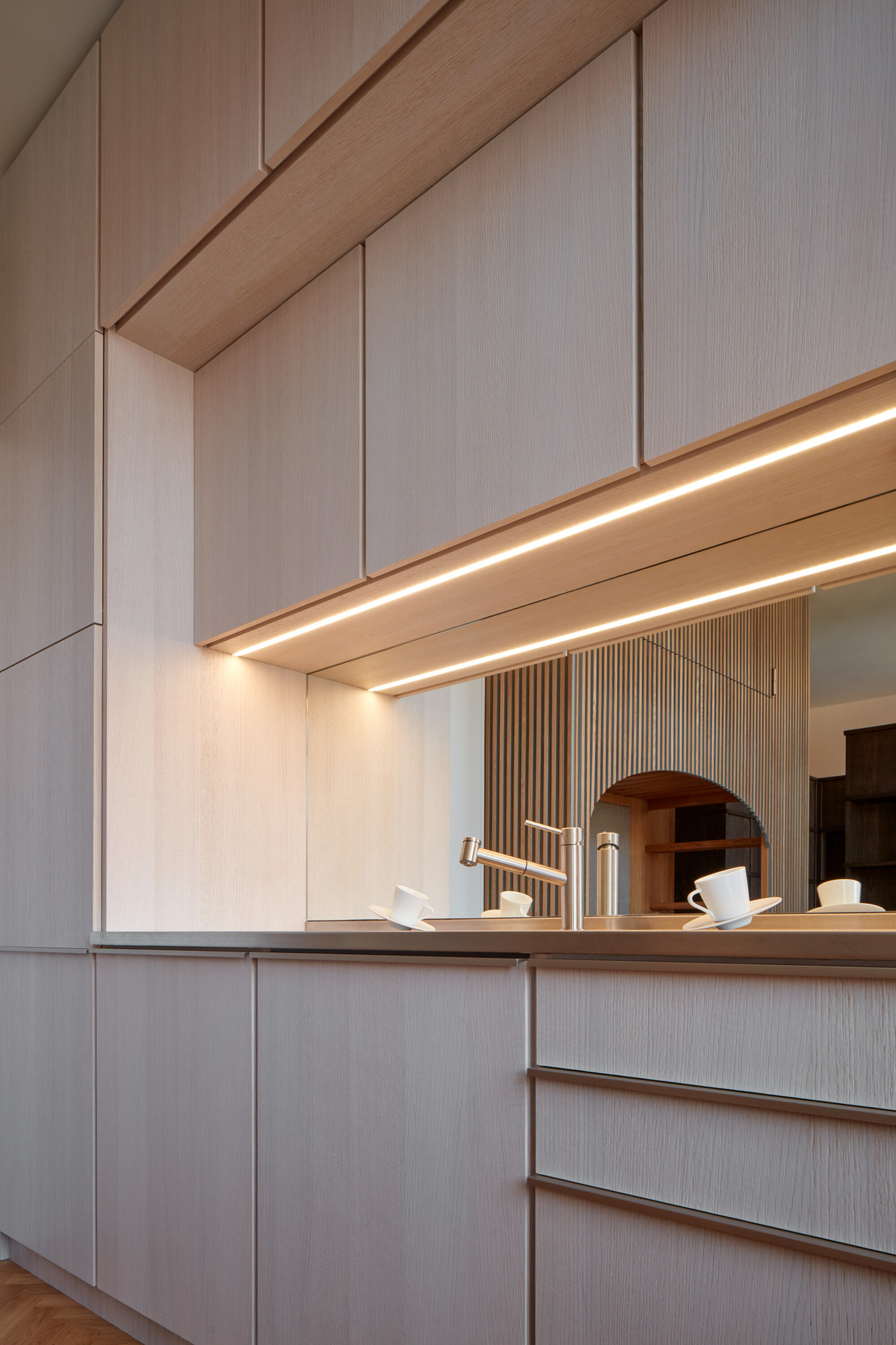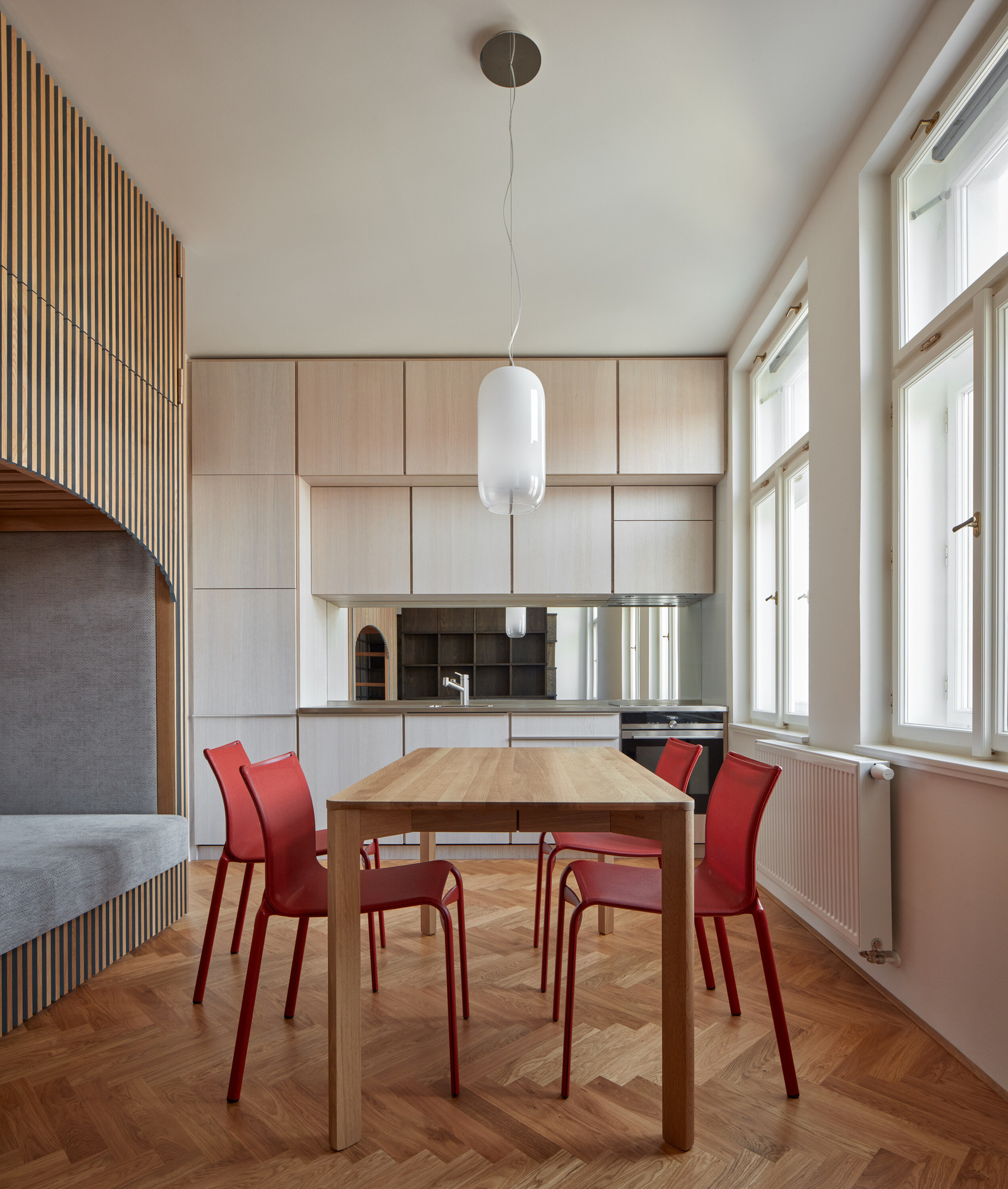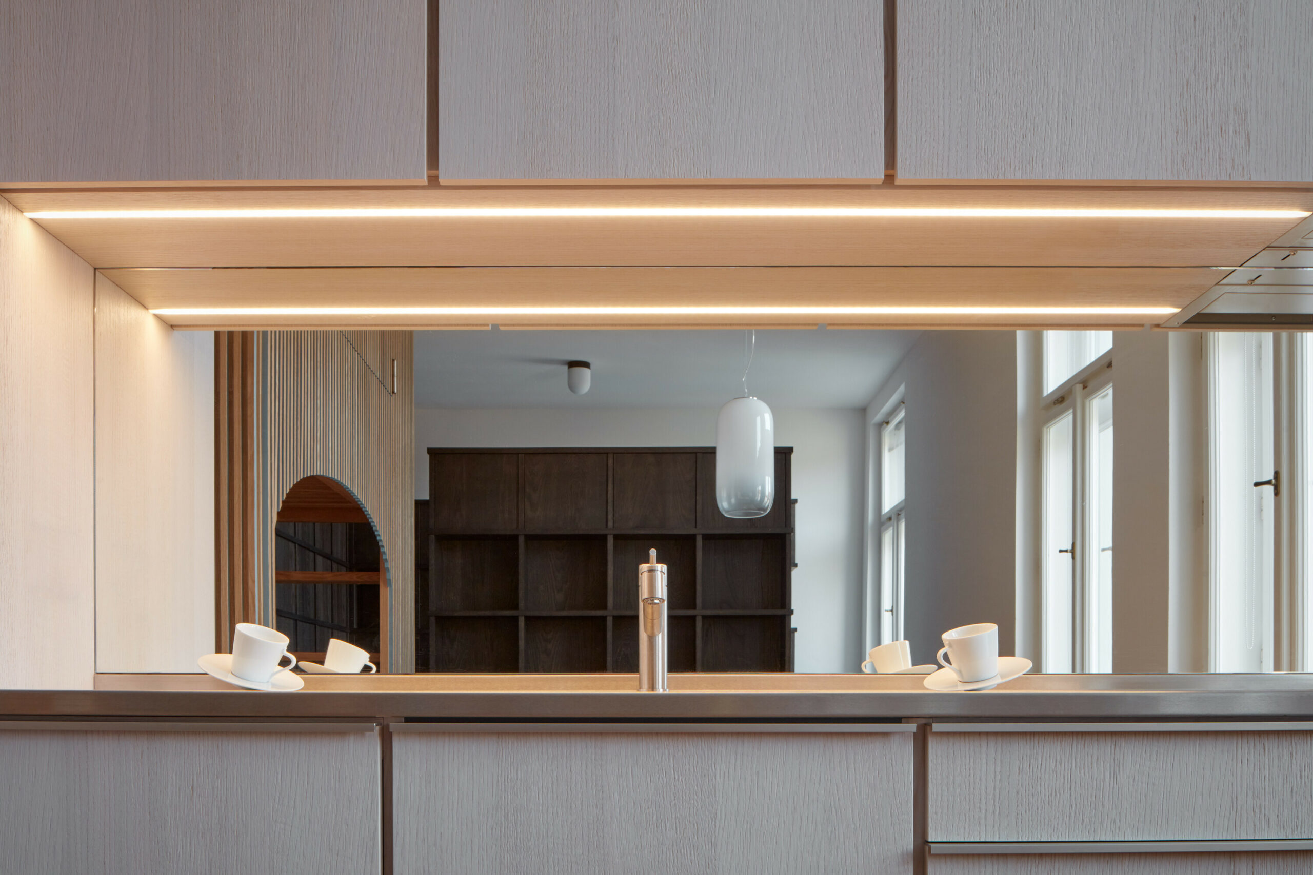 Le miroir placé derrière le plan de travail de la cuisine apporte de la profondeur à l’espace.